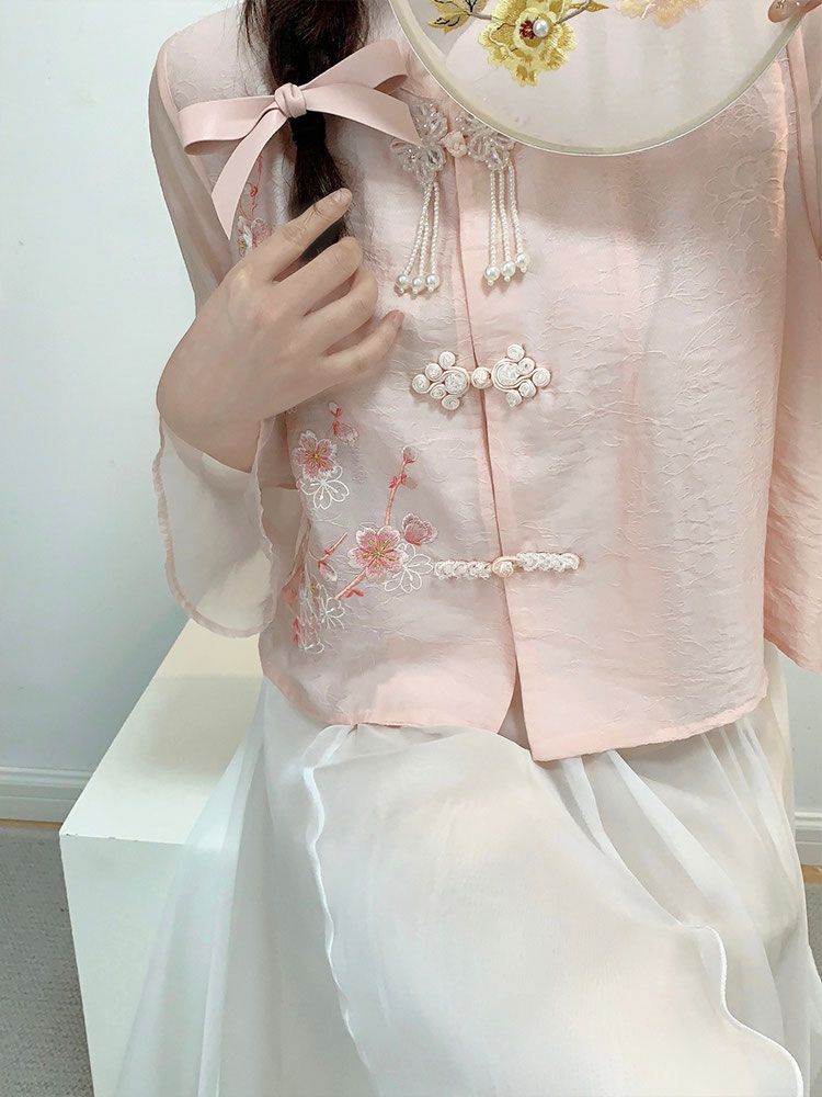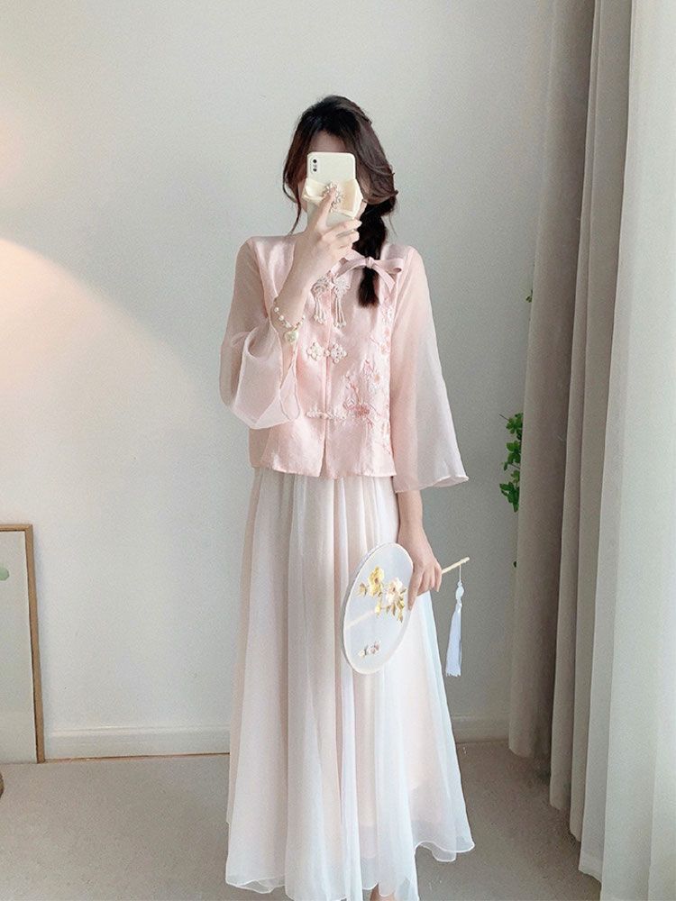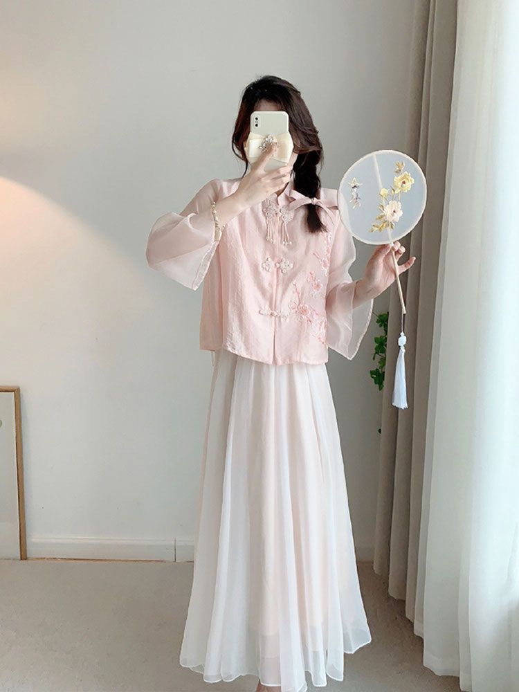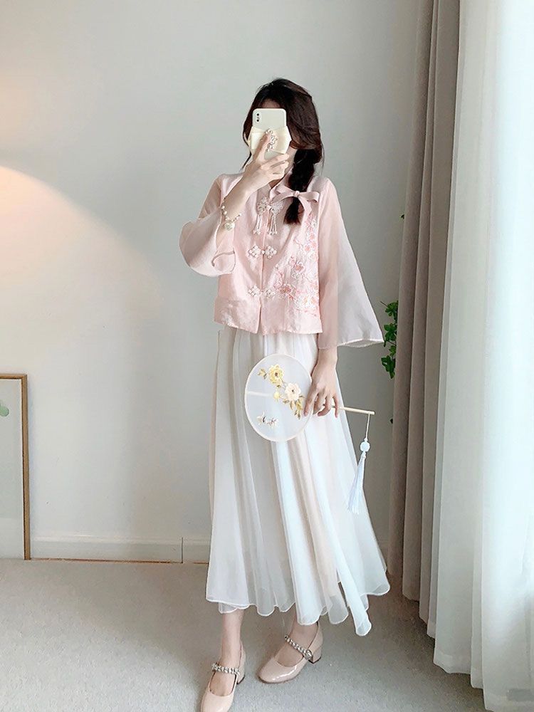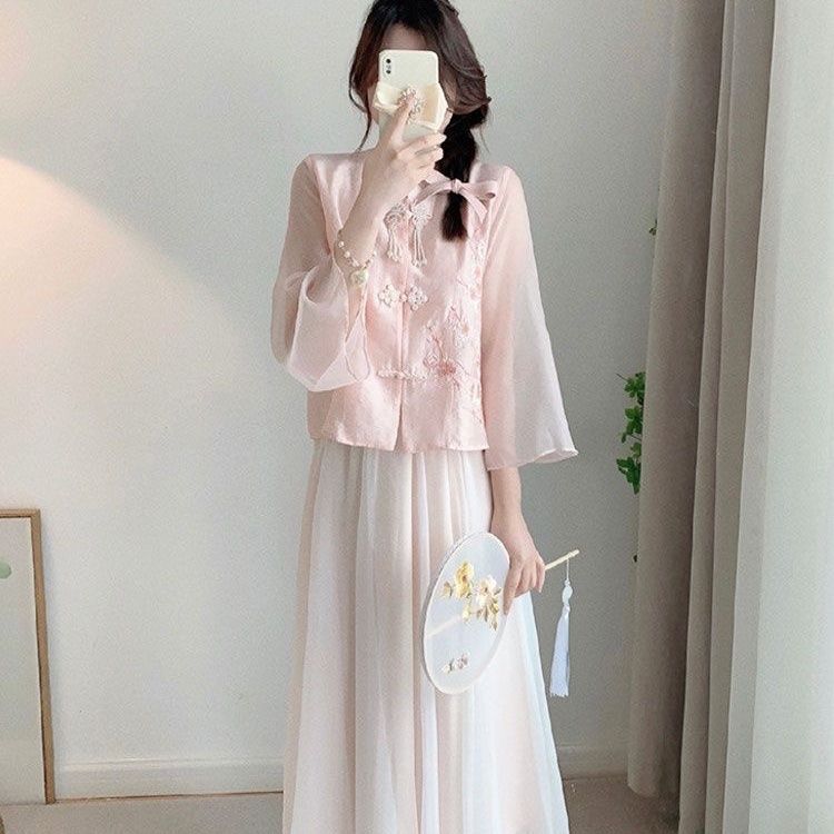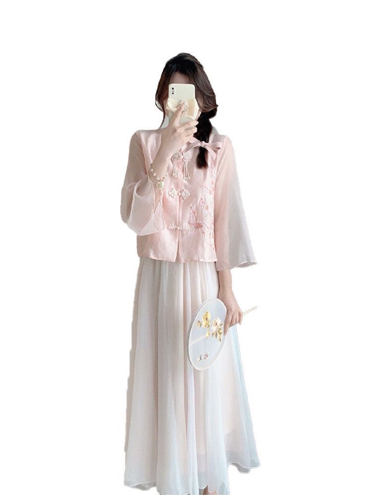 夏季新款唐装中国风新中式改良汉服女装粉色衬衫连衣裙子两件套装