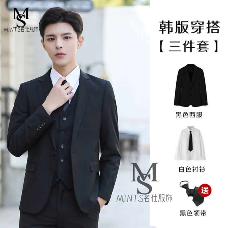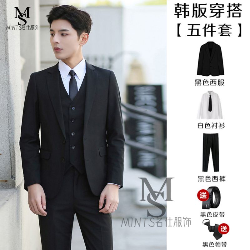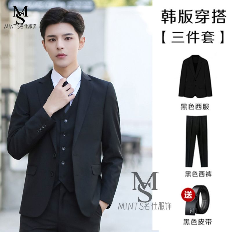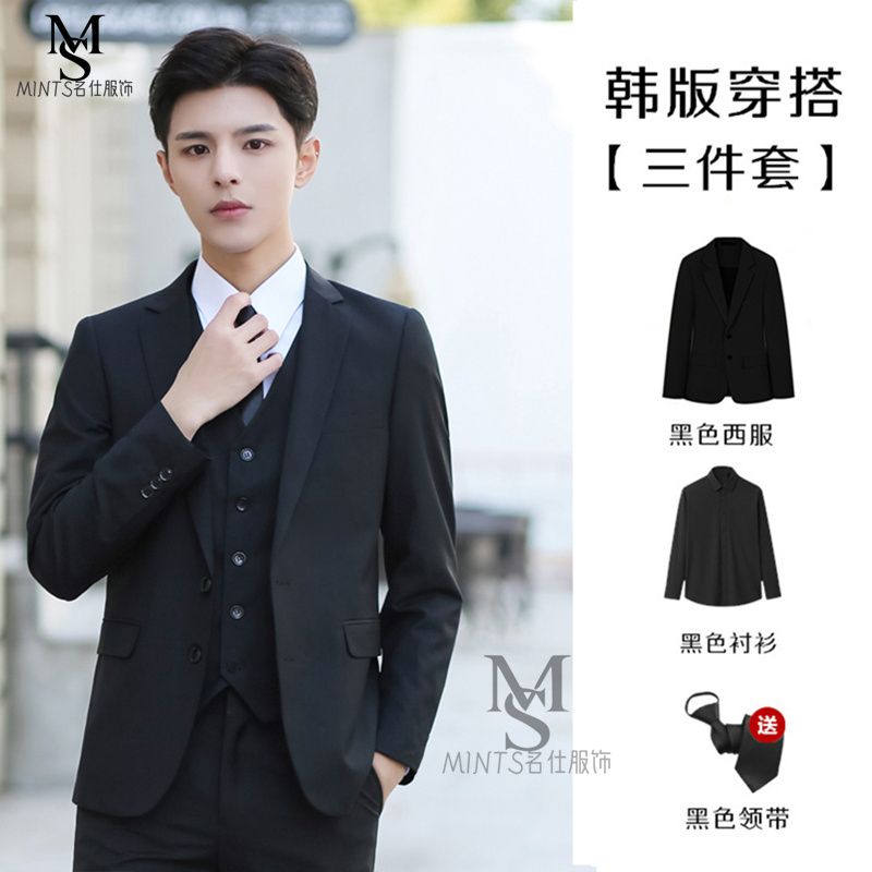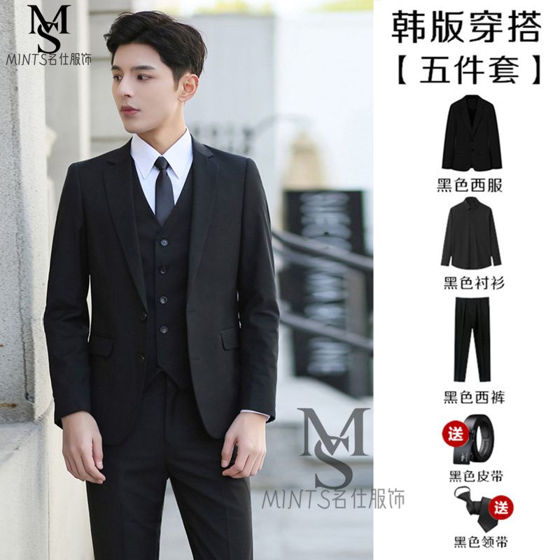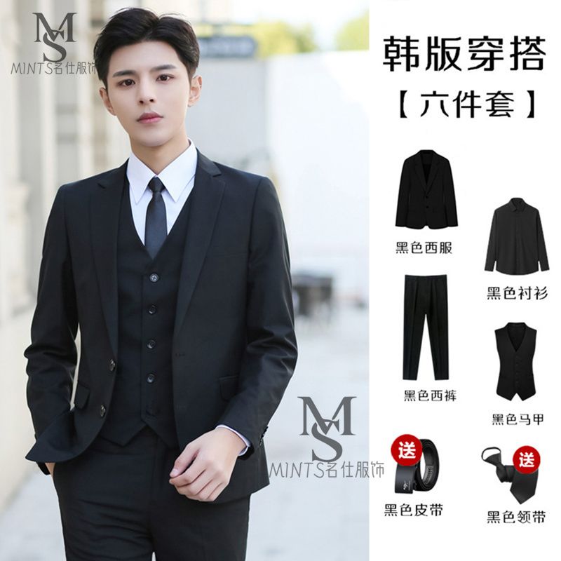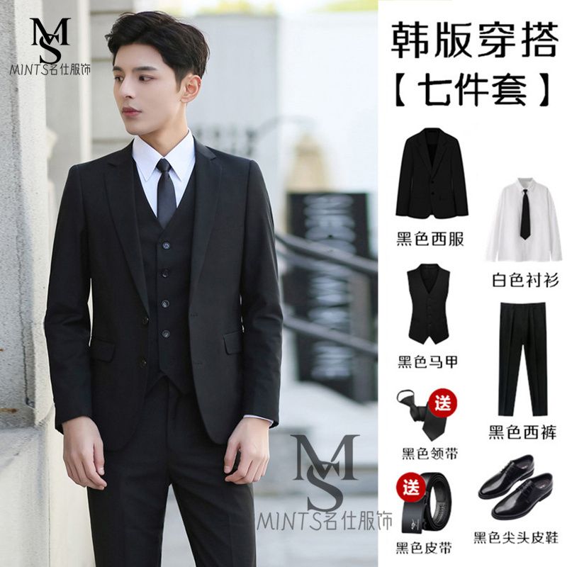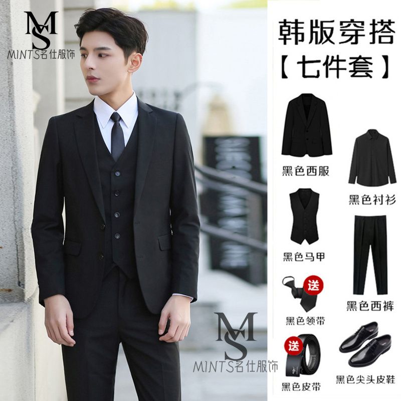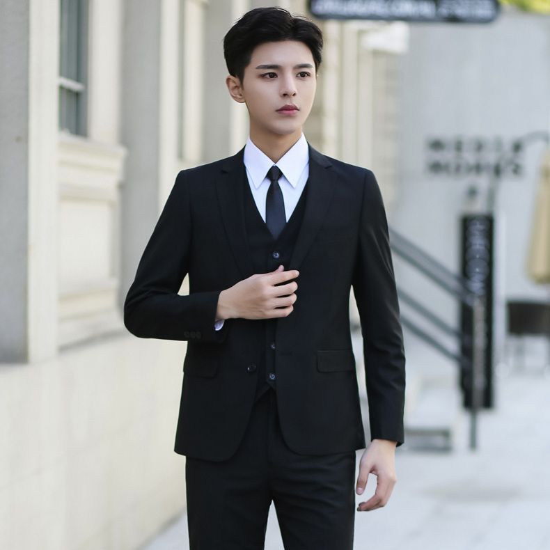 韩版修身黑色西服套装男士面试上班工作服商务帅气小西装一整套