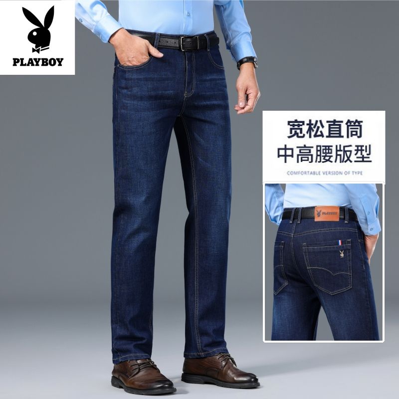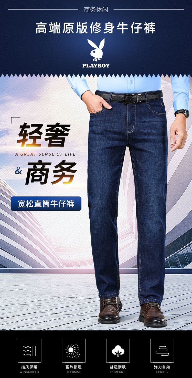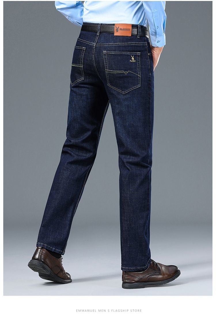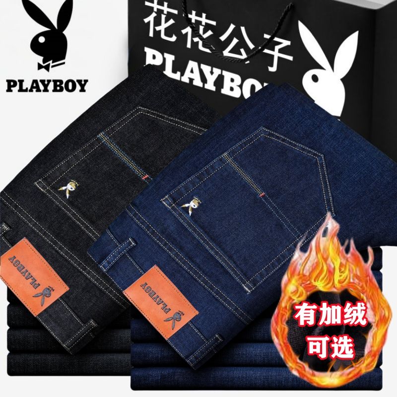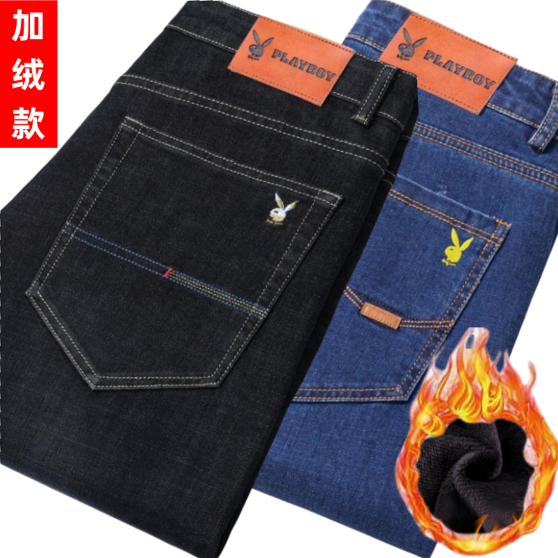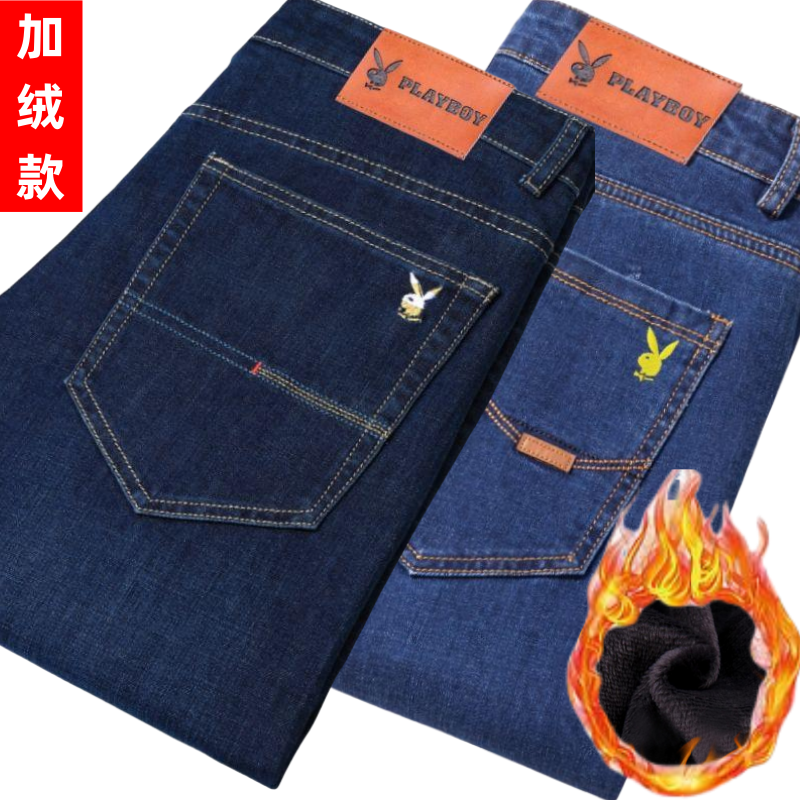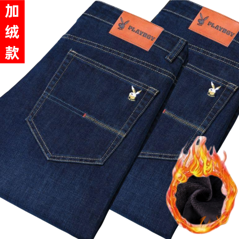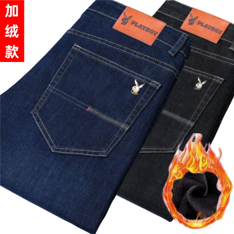 花花公子男士牛仔秋冬厚款宽松直筒弹力高腰中青年大码男加绒裤子