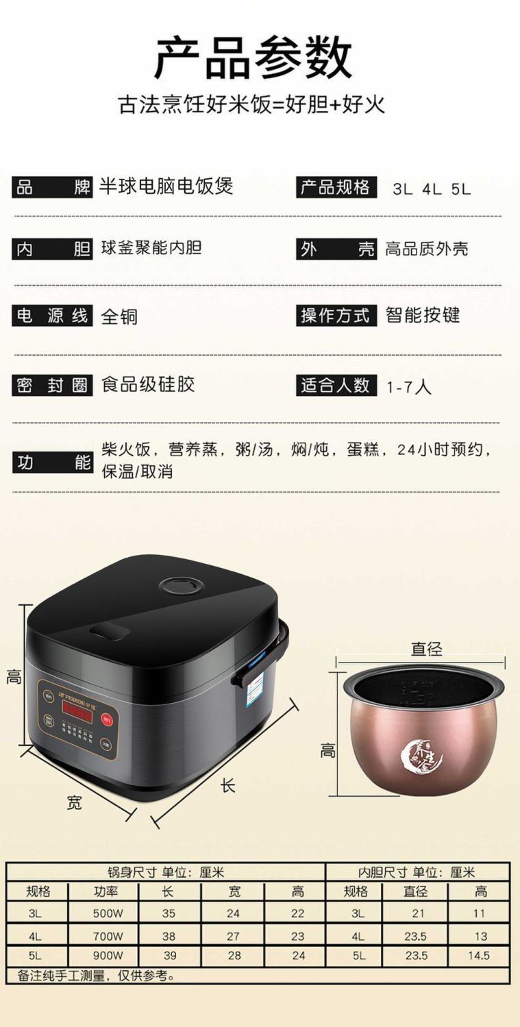 半球电饭煲家用新款3L4L5升大容量不粘智能预约多功能2-7人蒸煮锅
