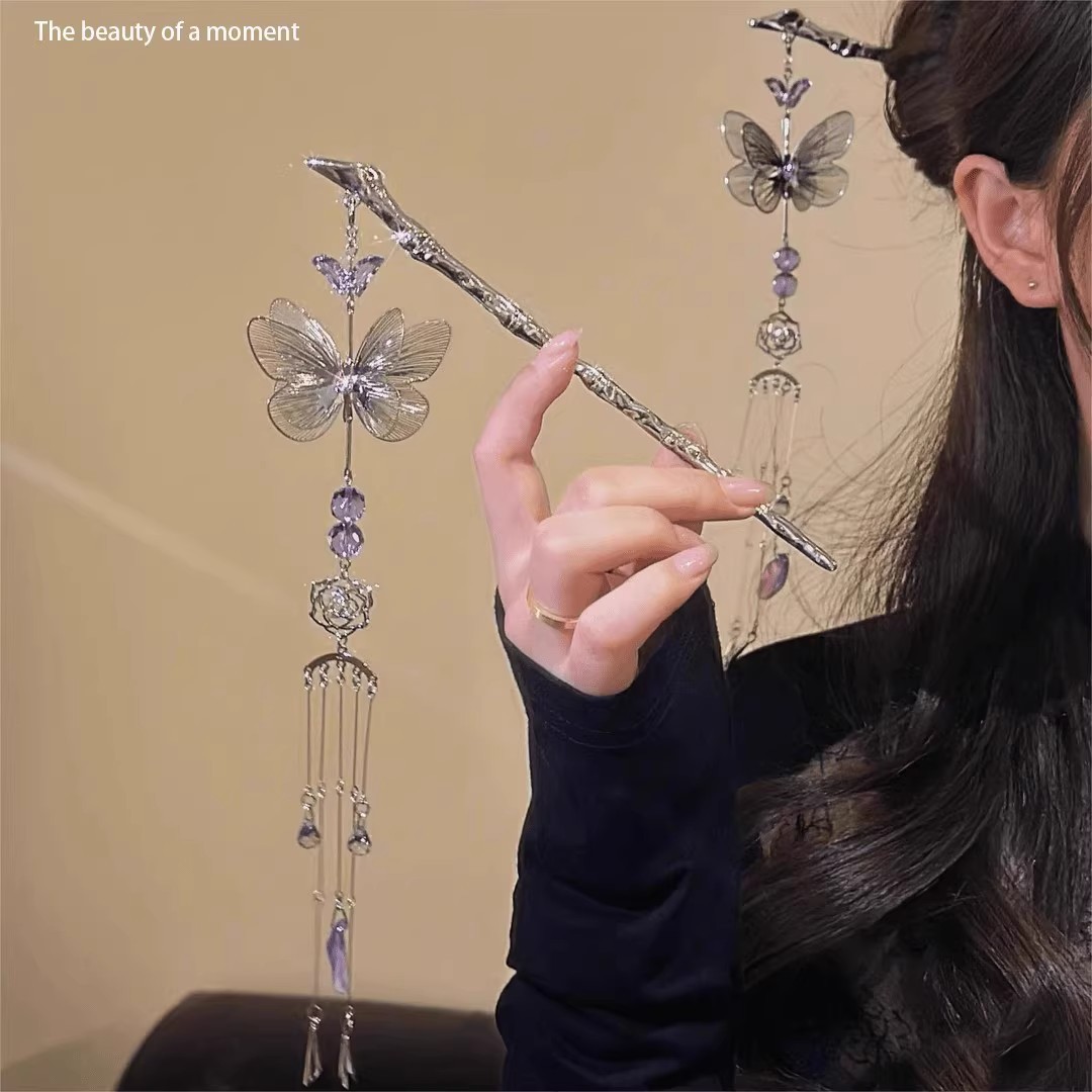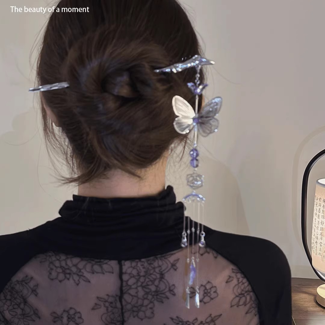 新中式头饰紫蝴蝶流苏发簪国风步摇簪子后脑勺盘发钗汉服旗袍配饰