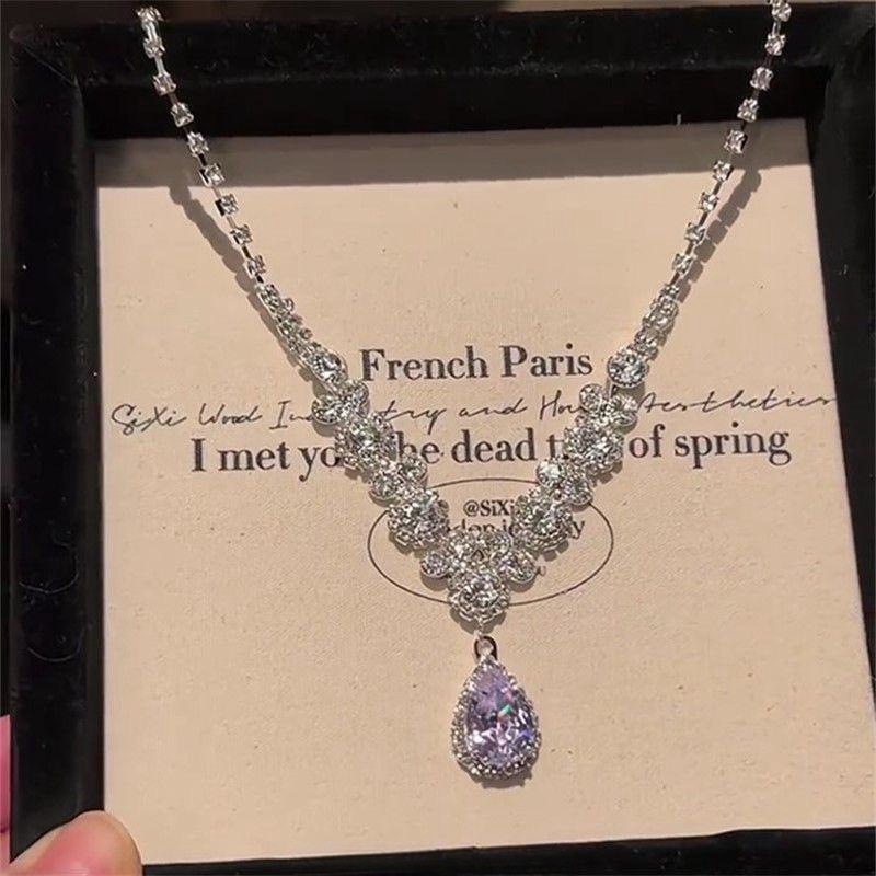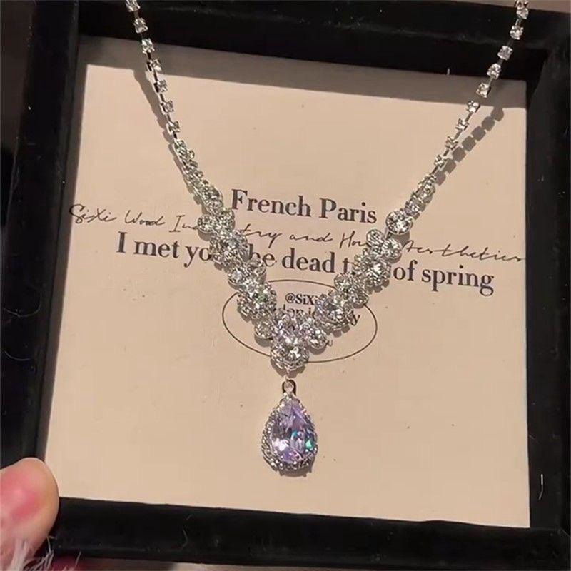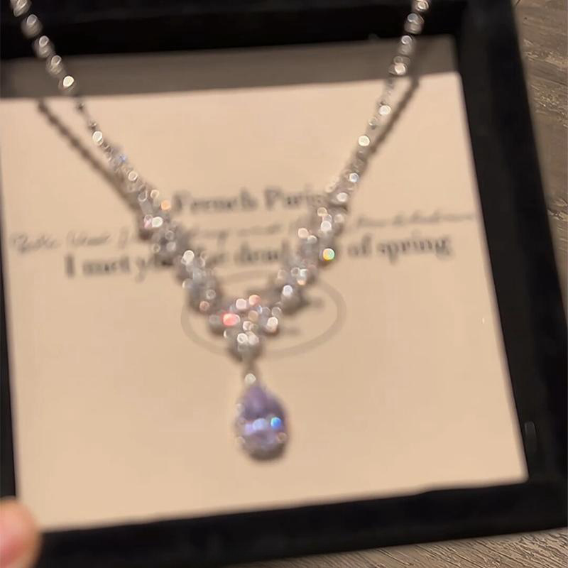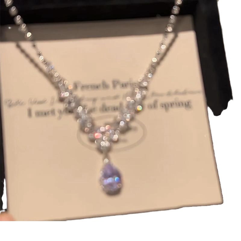 「biu boom」璀璨超闪紫色锆石项链水滴颈链银色宝石锁骨链配饰