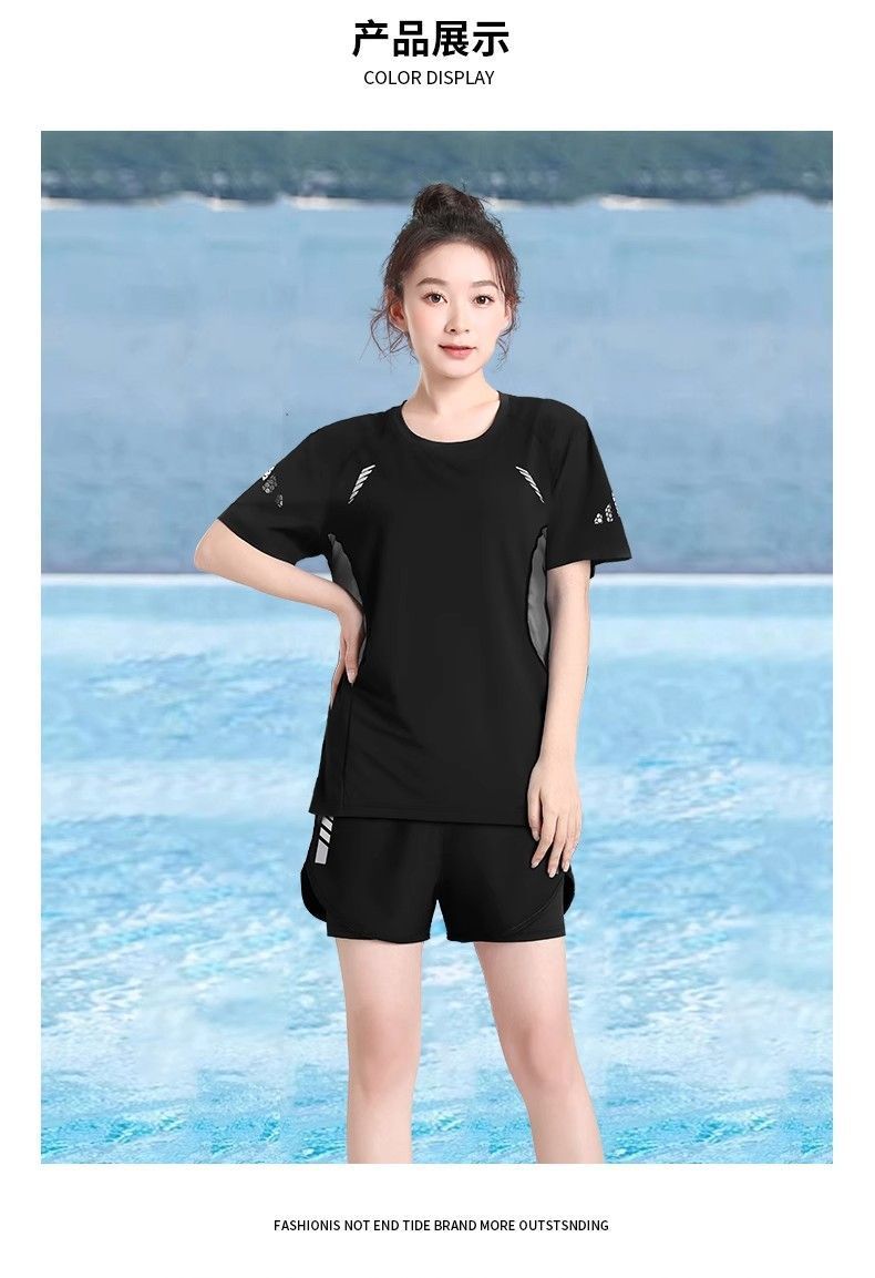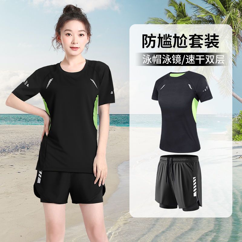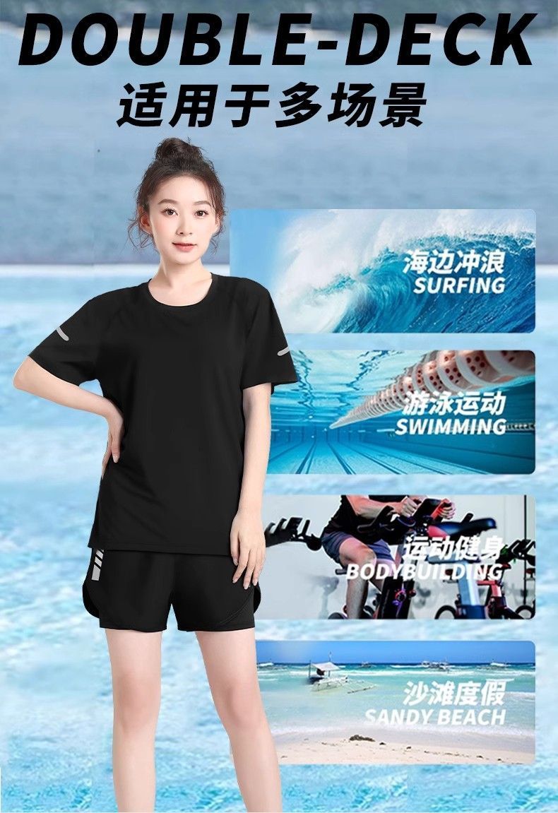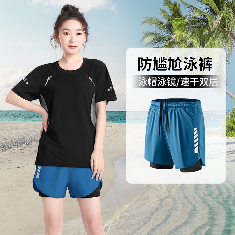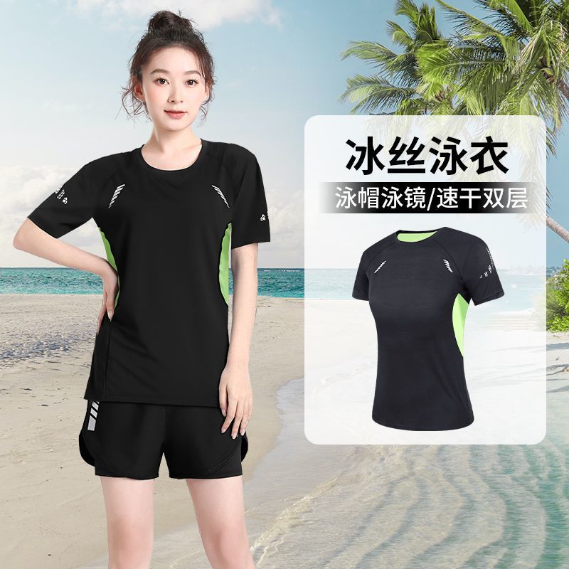 泳衣女夏季沙滩保守显瘦修身学生运动分体平角游泳短裤速干短袖