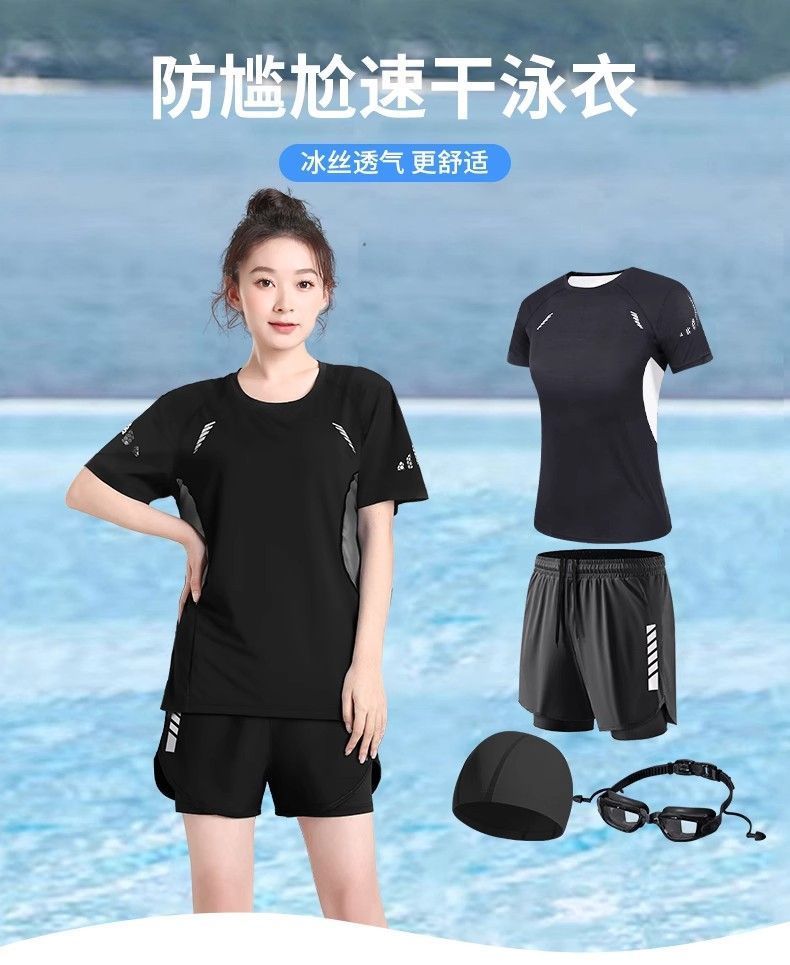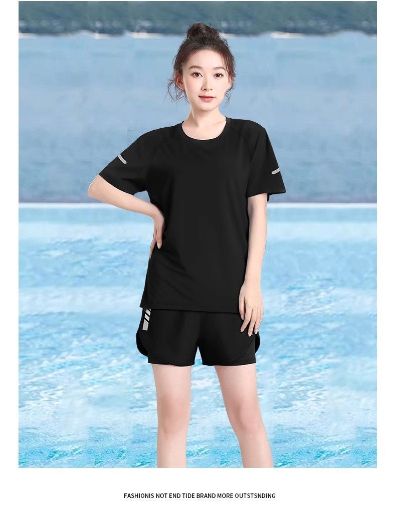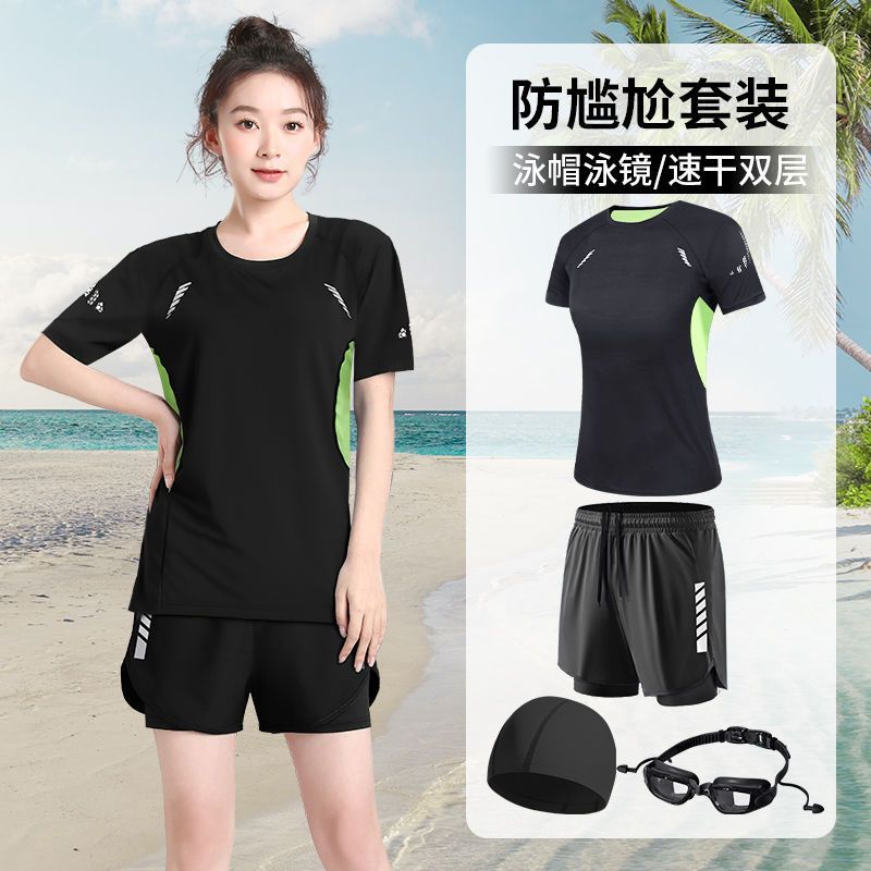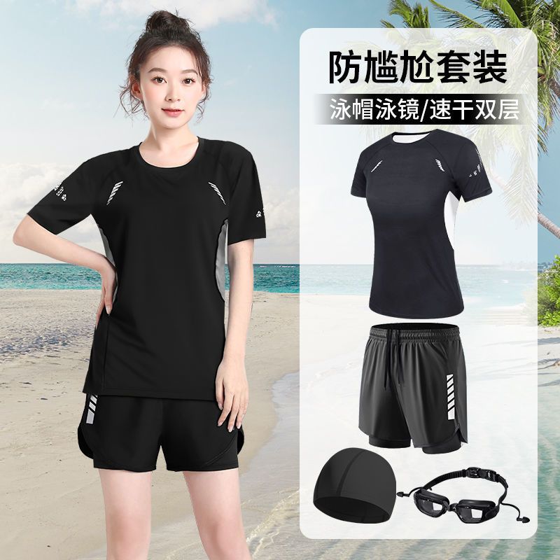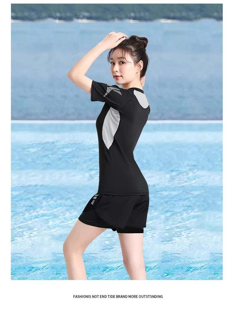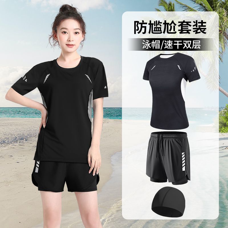 泳衣女夏季沙滩保守显瘦修身学生运动分体平角游泳短裤速干短袖