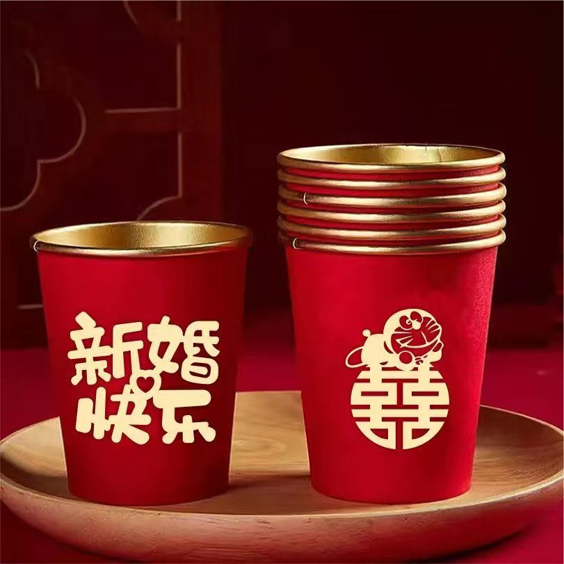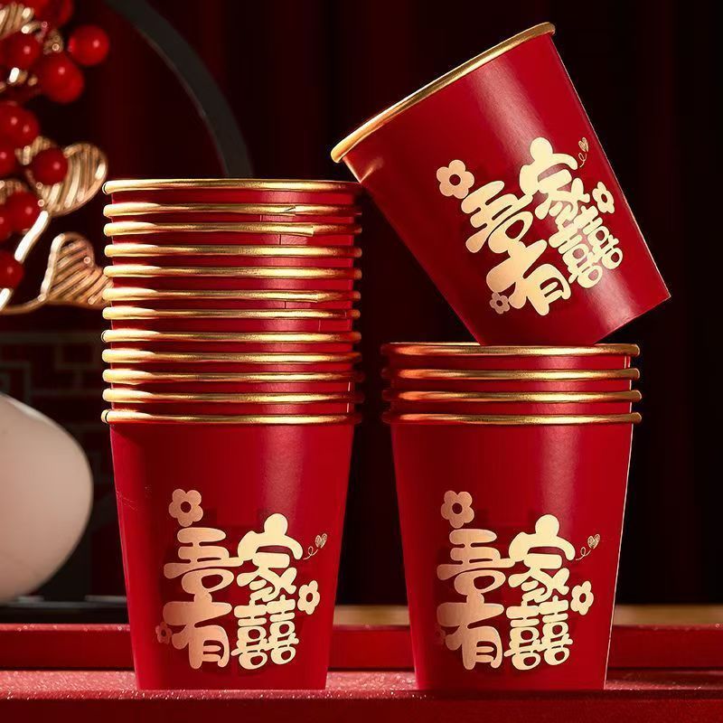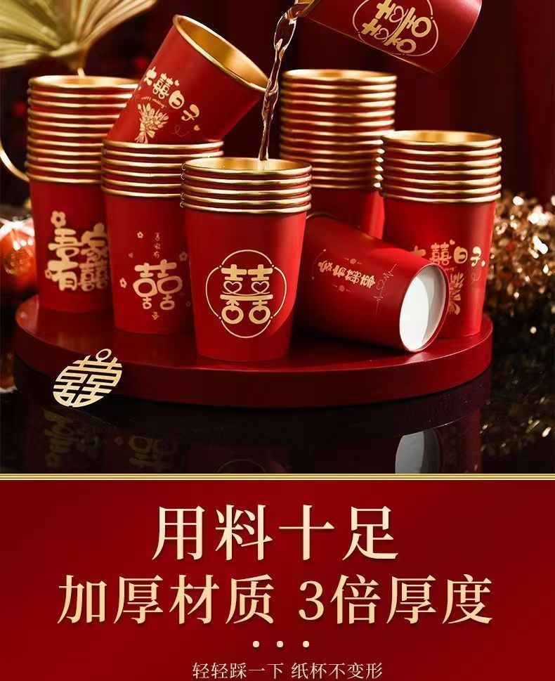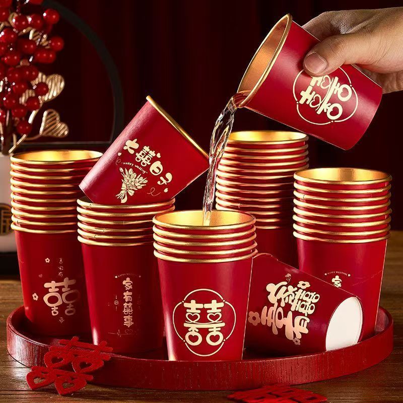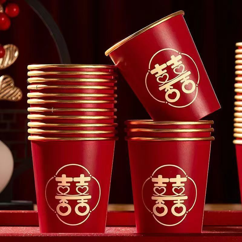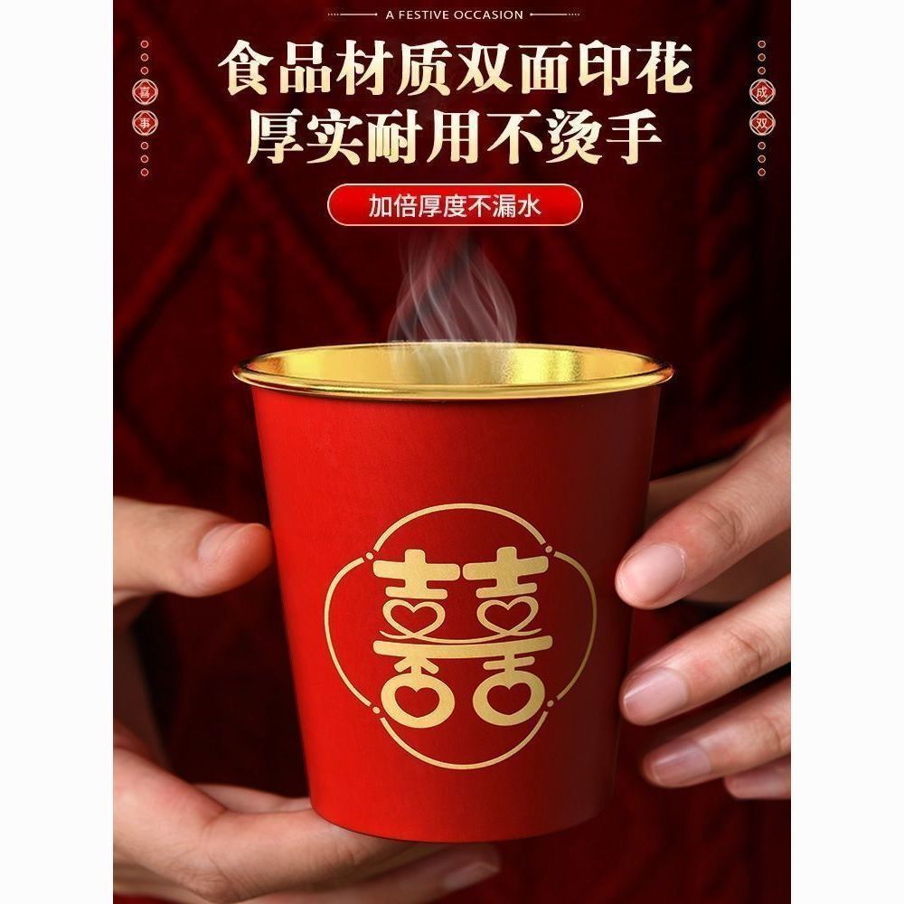 结婚一次性纸杯子金箔奢订婚婚礼喜杯婚宴水杯家用红色婚庆敬茶杯