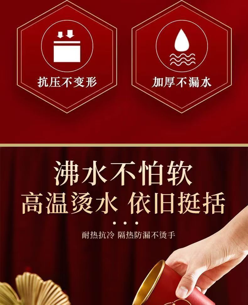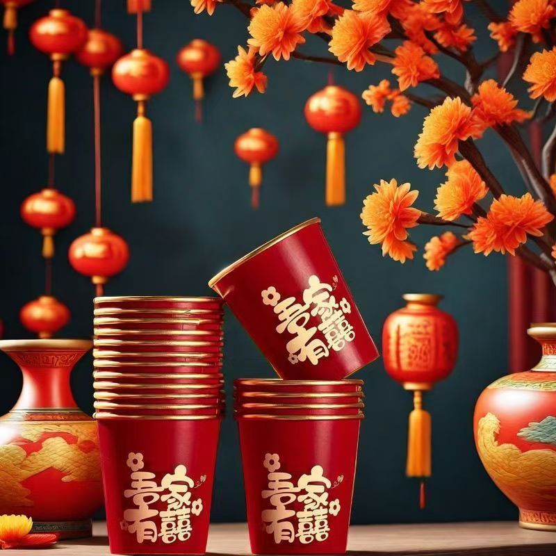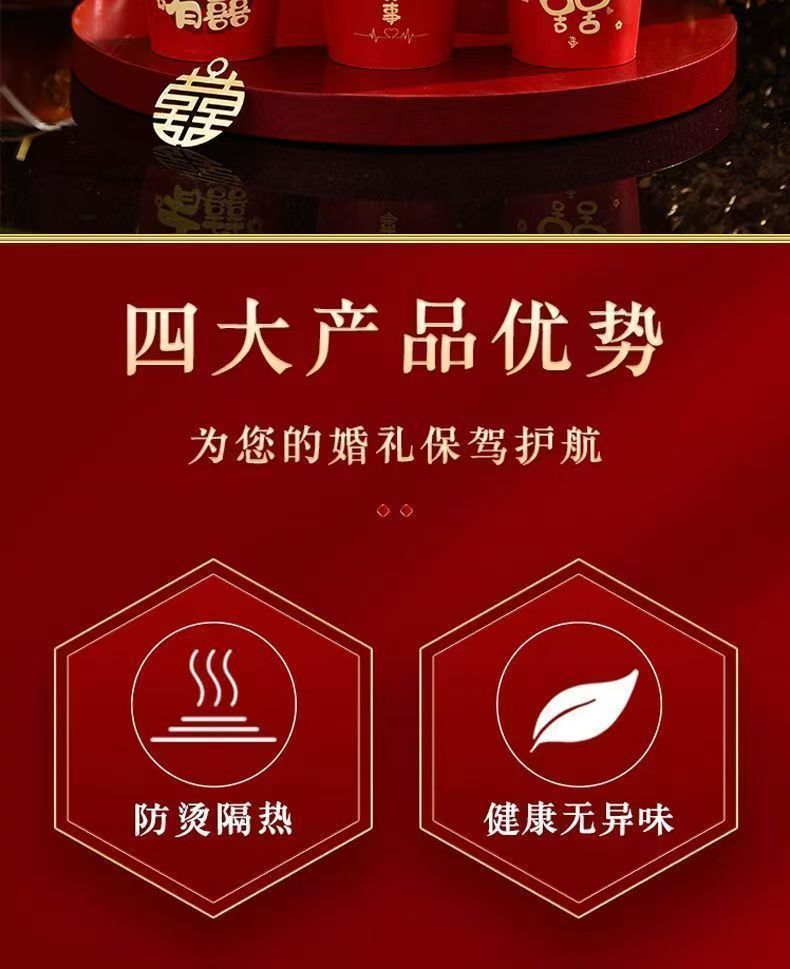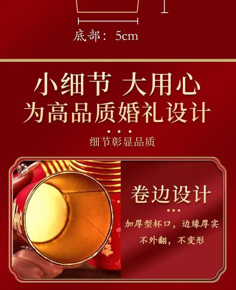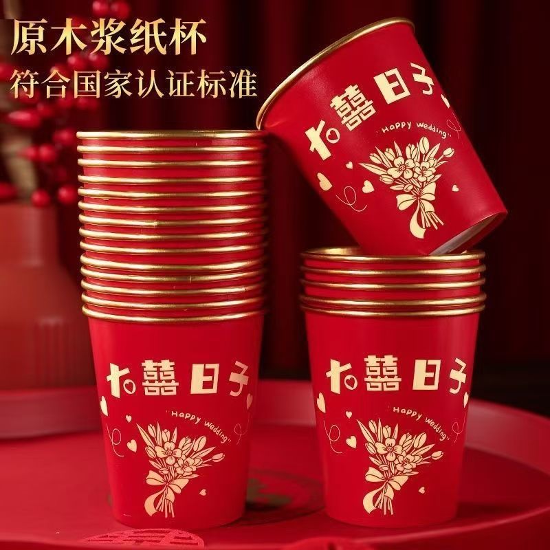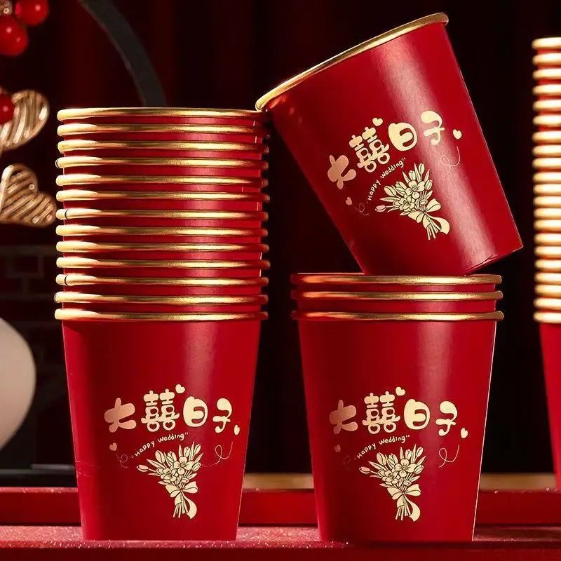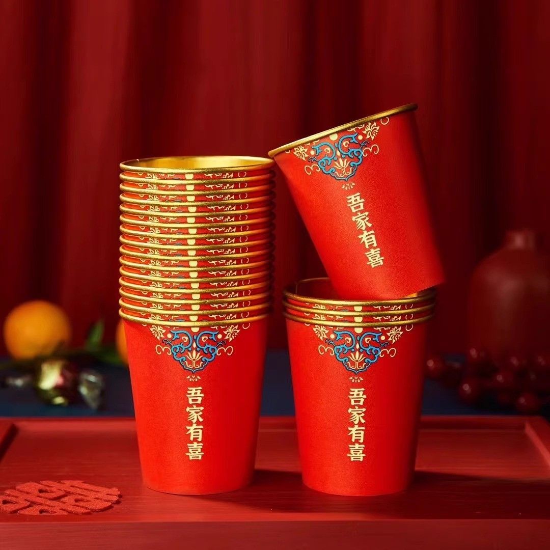结婚一次性纸杯子金箔奢订婚婚礼喜杯婚宴水杯家用红色婚庆敬茶杯