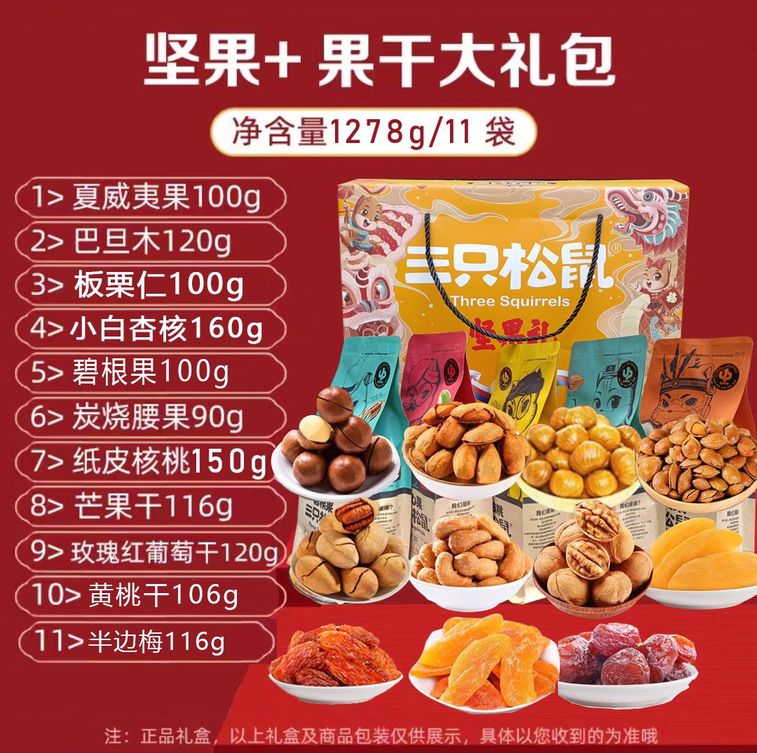 | gift box (7 bags of nuts +5 bags of dried fruit/12 in total)(礼盒装(7袋坚果+5袋果干/共12款)) | USD $32.27 | 999999 piece available |
