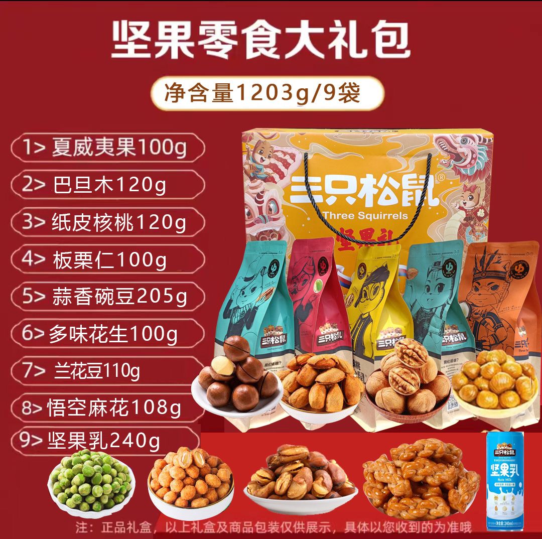 | gift box (best-selling nut snacks 9 1268g)(礼盒装(畅销坚果零食9款1268g)) | USD $17.93 | 999999 piece available |