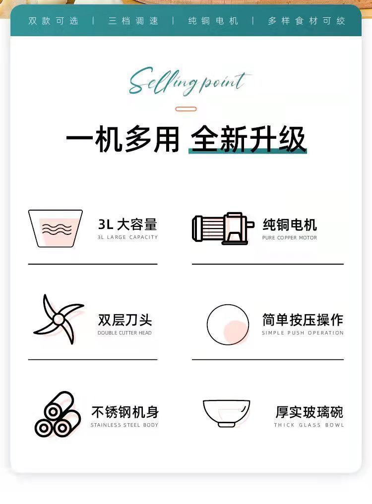 | 3 liters, 2 gears, 3 sets of knives [stainless steel bowl] (can be mixed with noodles)(3升2档三套刀【不锈钢碗】(可和面)) | USD $15.76 | 999999 piece available |
