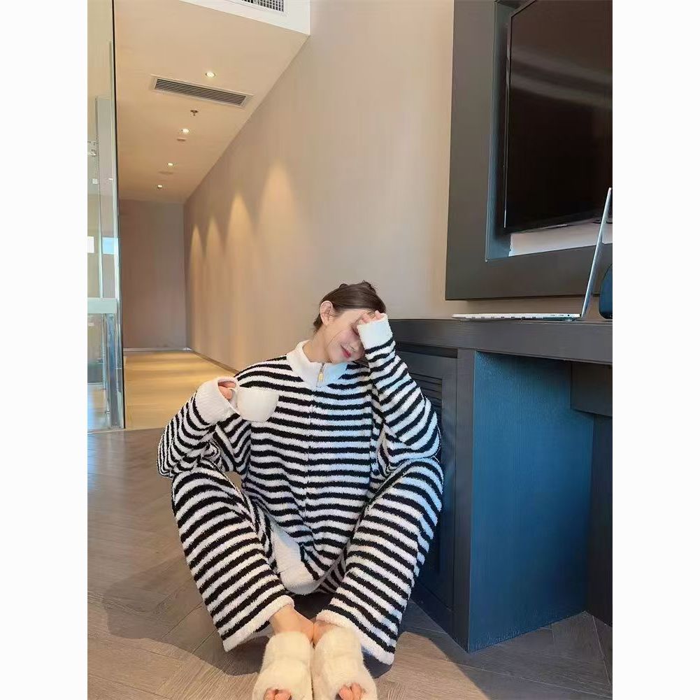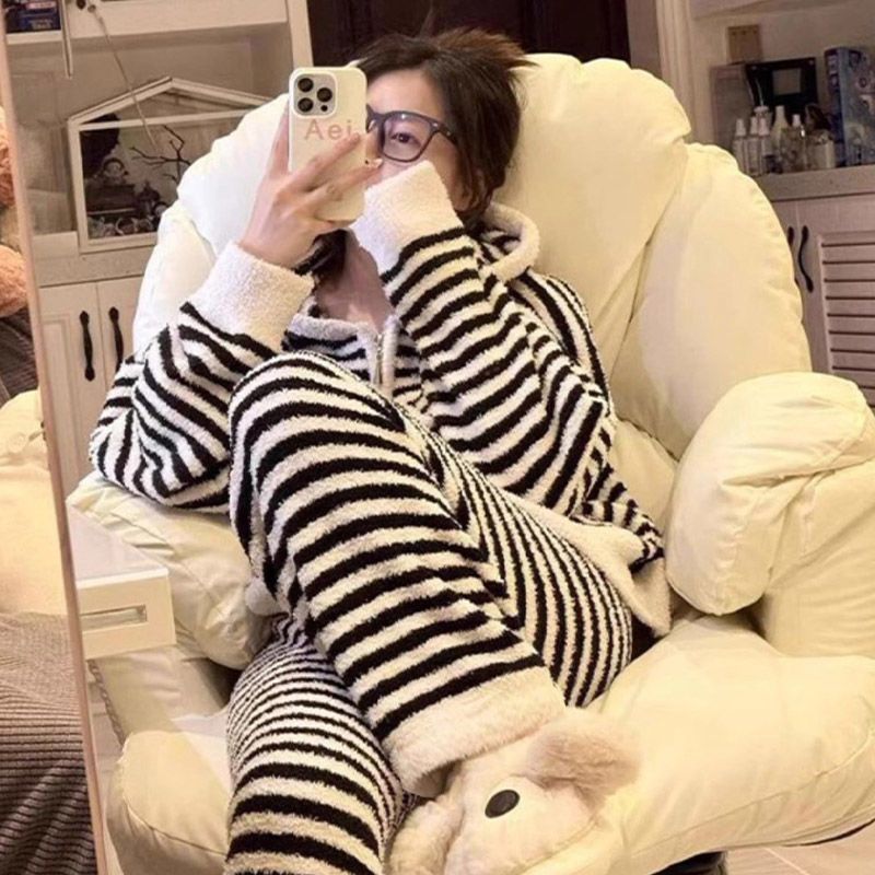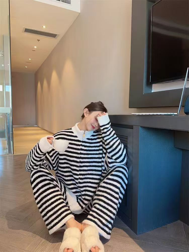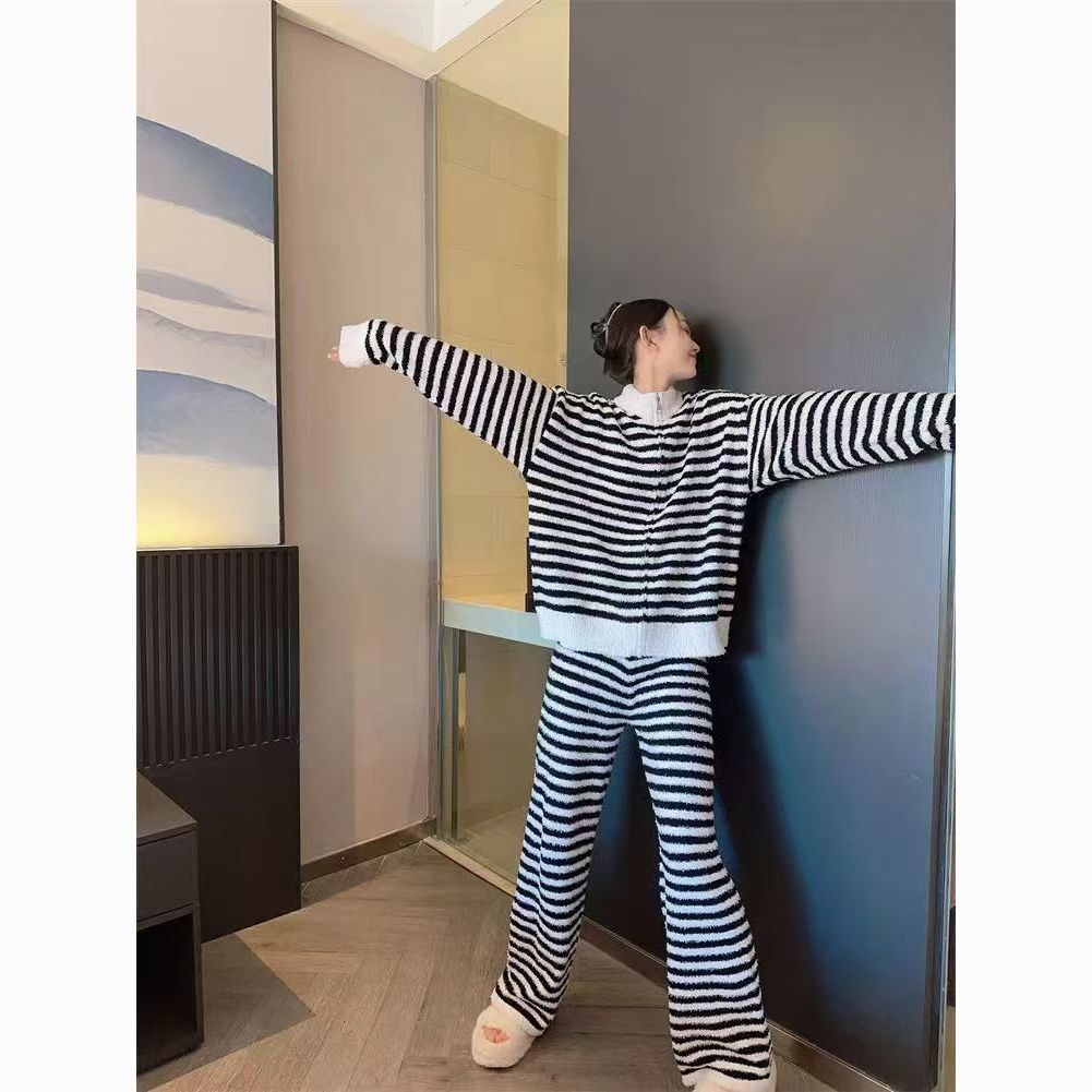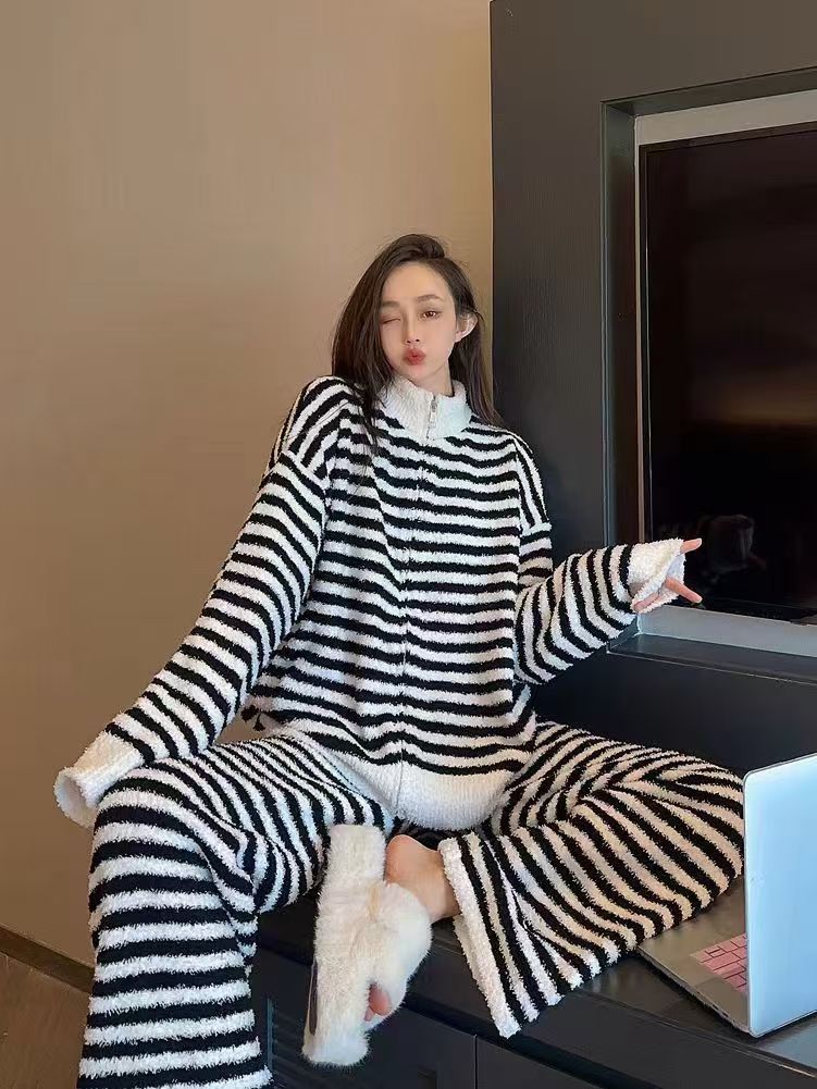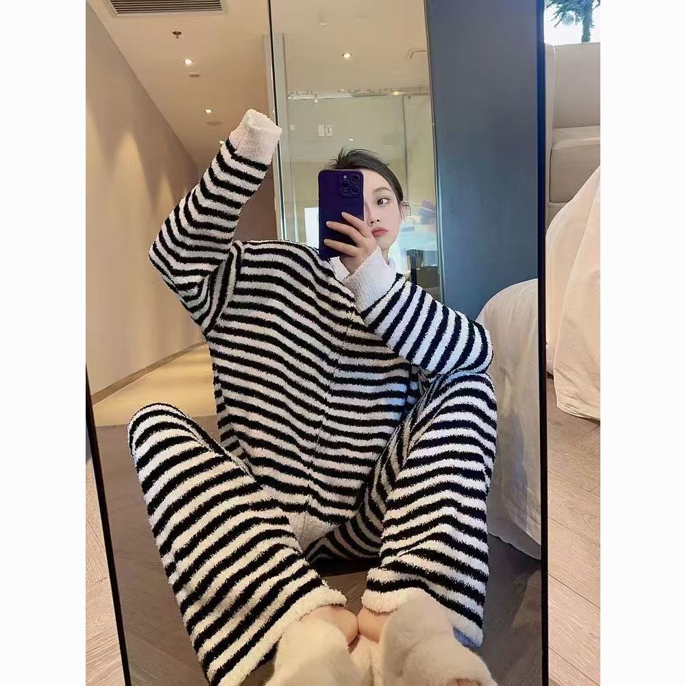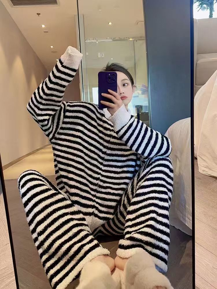 秋冬季软绵绵韩版条纹睡衣女士半边绒加绒加厚长袖长裤家居服套装