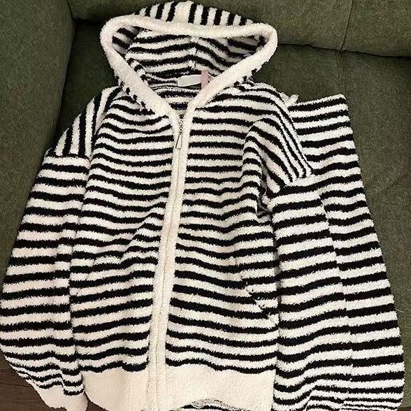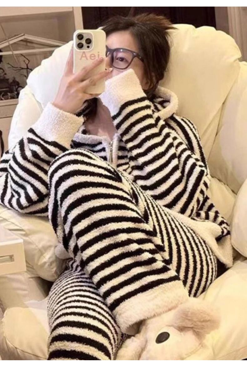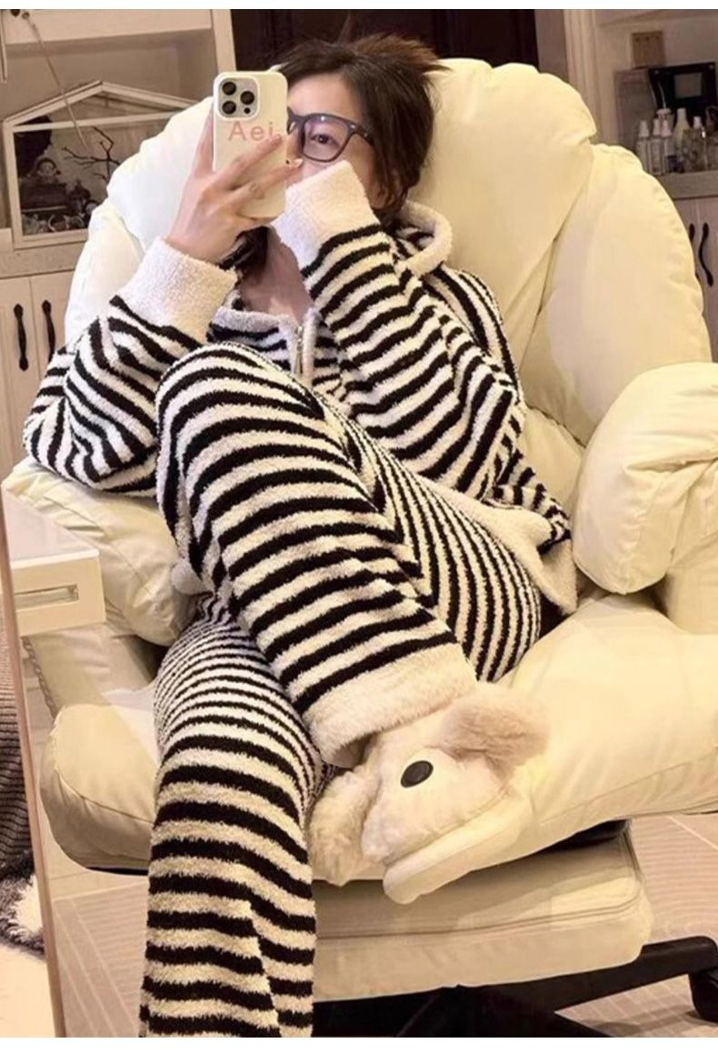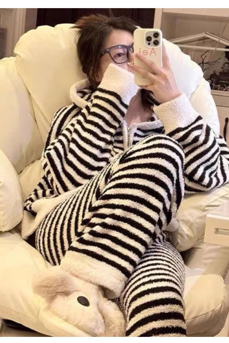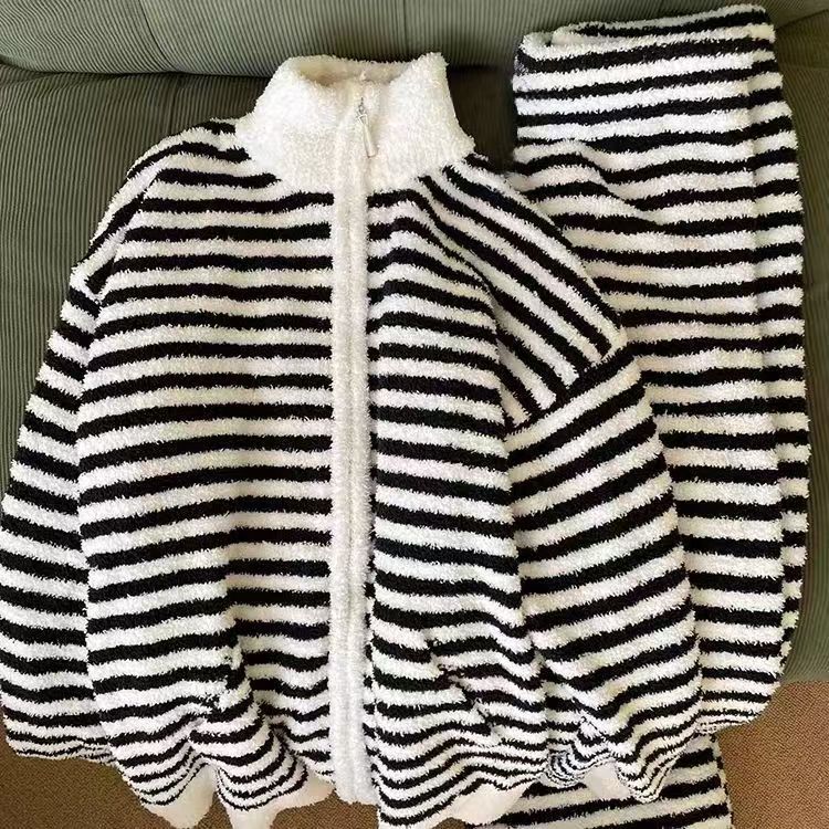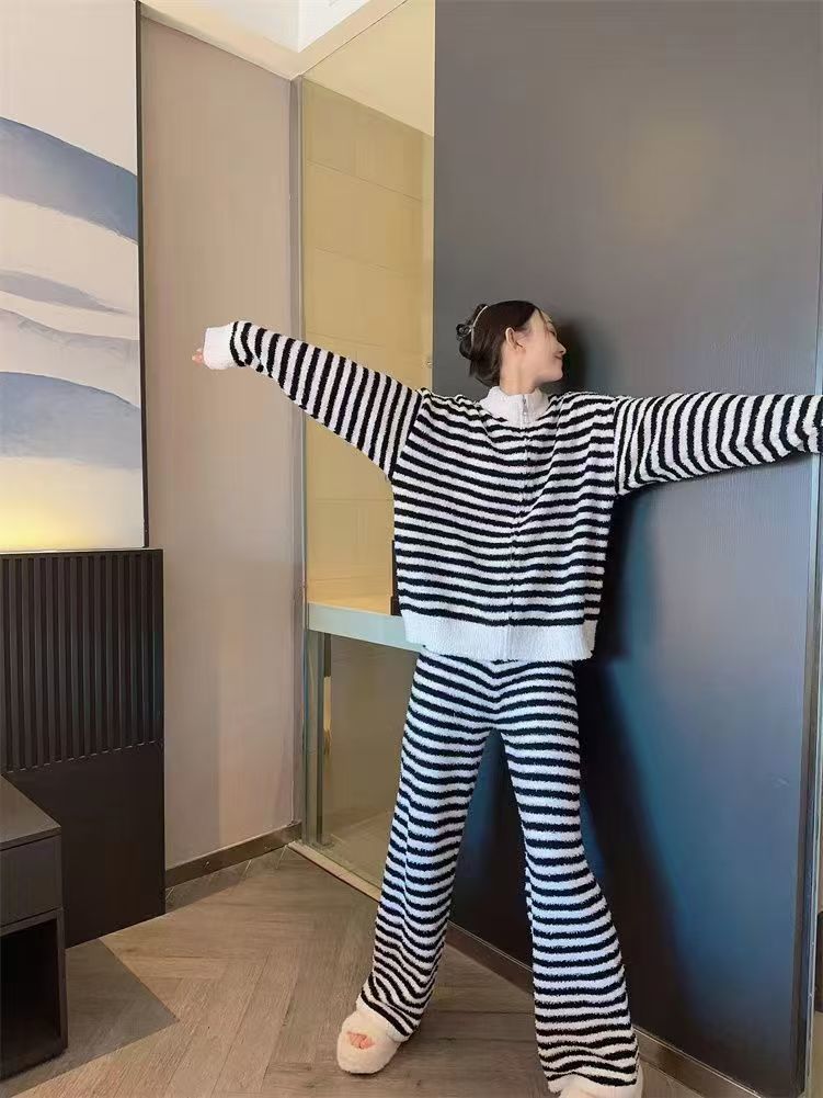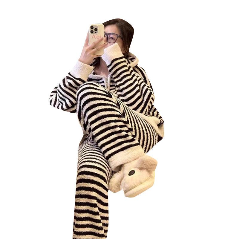 秋冬季软绵绵韩版条纹睡衣女士半边绒加绒加厚长袖长裤家居服套装