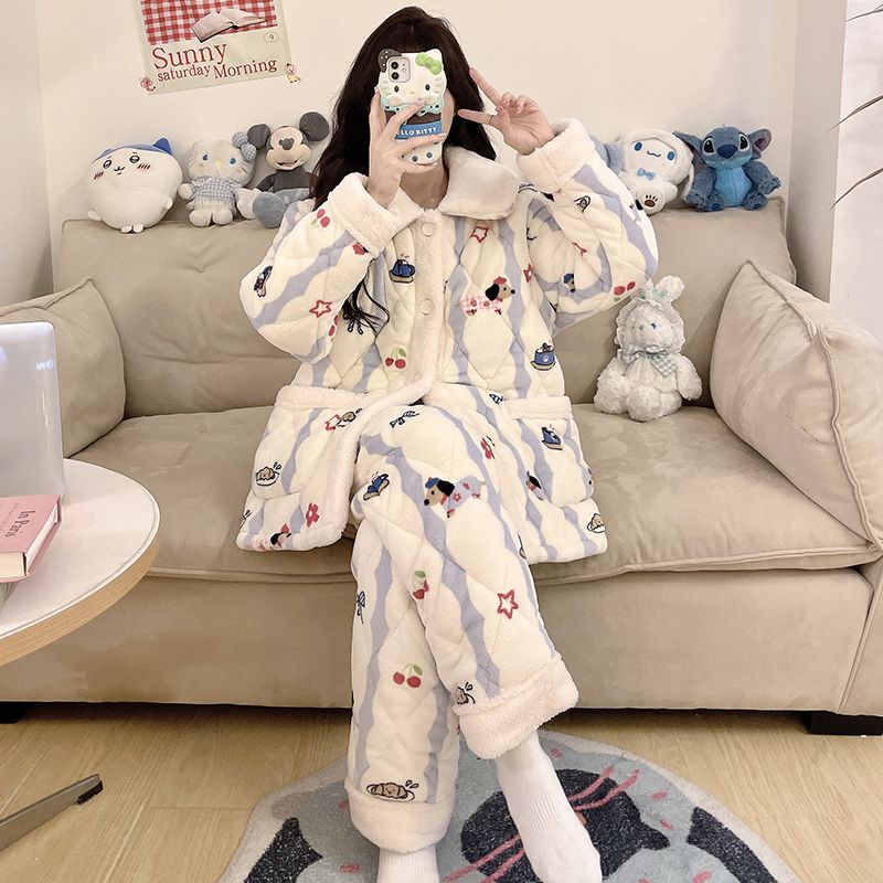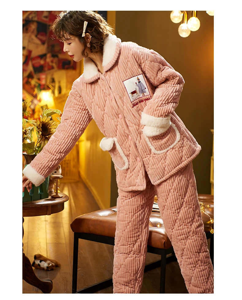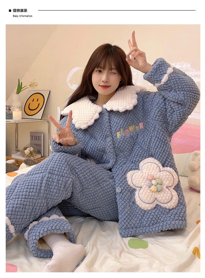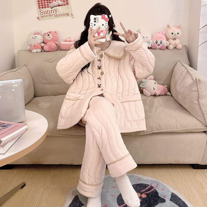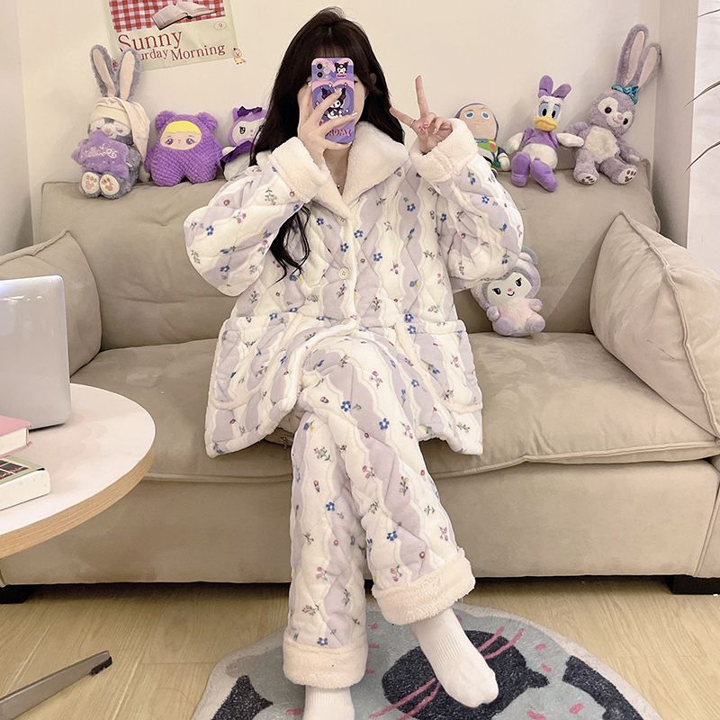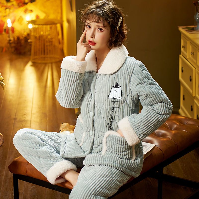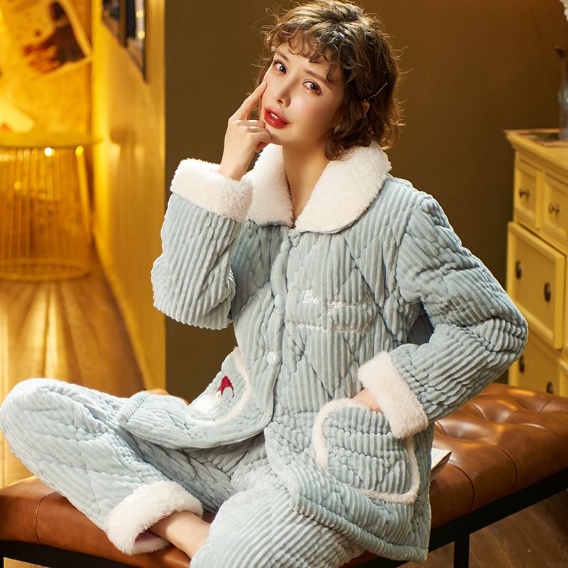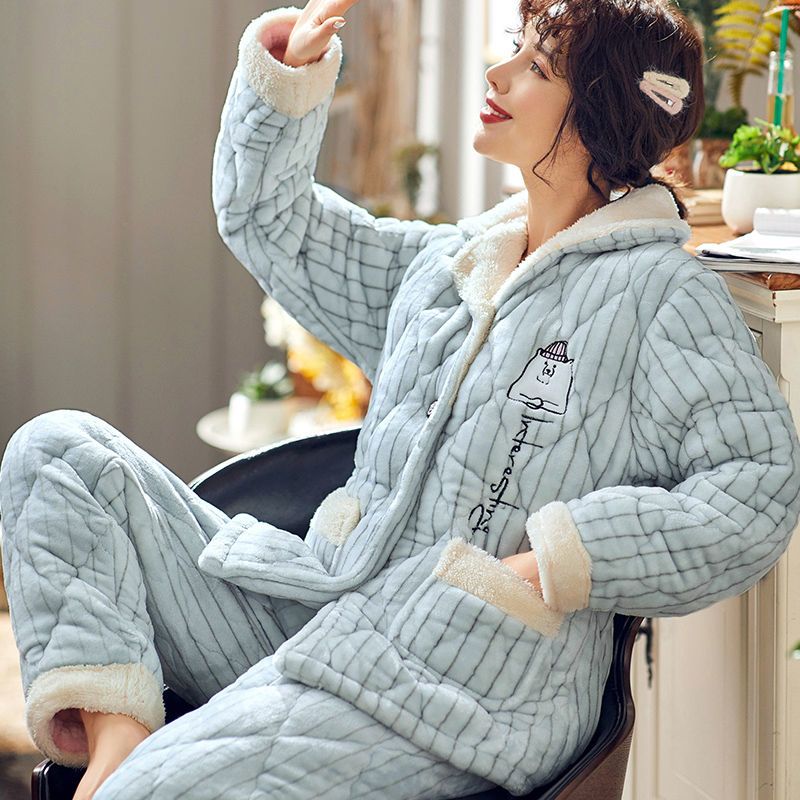 睡衣女秋冬款加厚三层夹棉珊瑚绒冬季长袖套装新款保暖家居服冬天