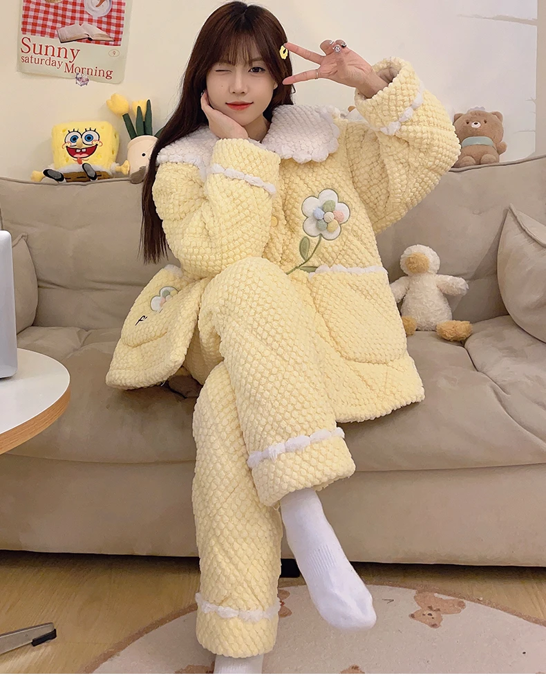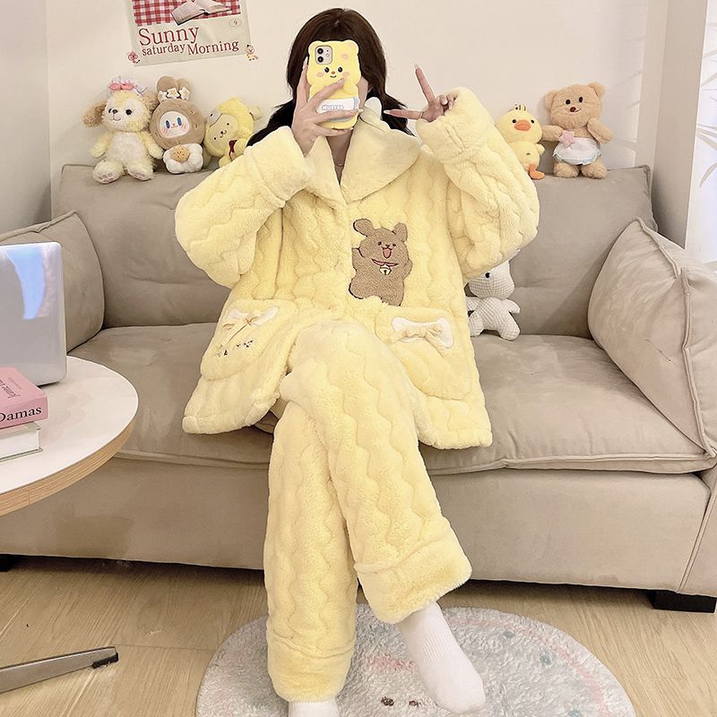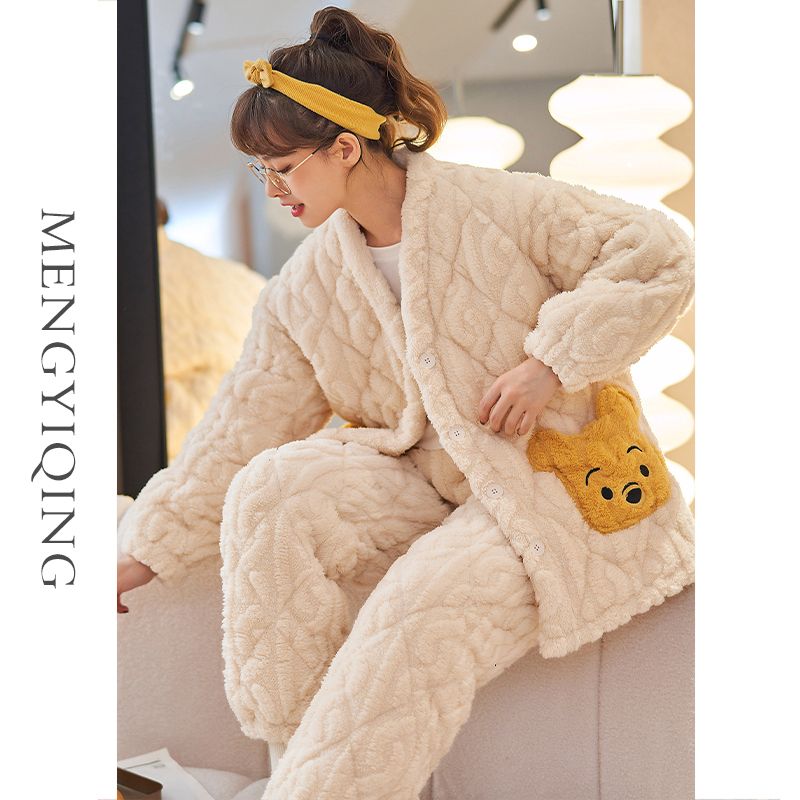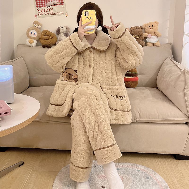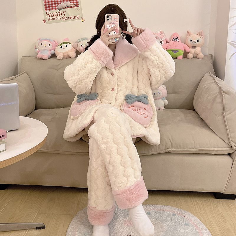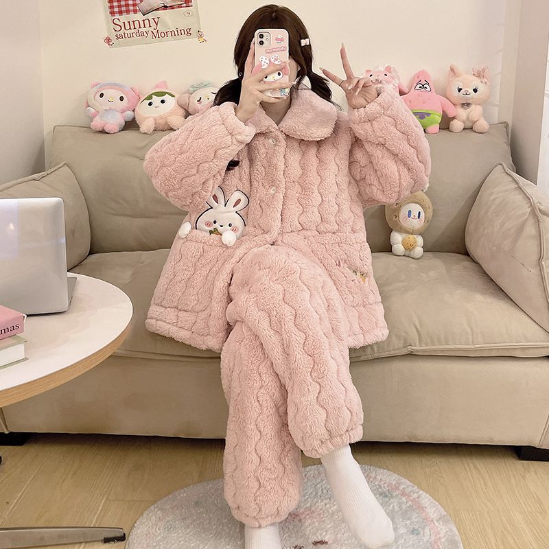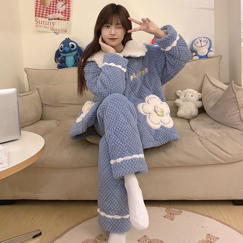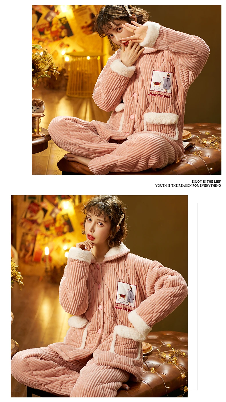 睡衣女秋冬款加厚三层夹棉珊瑚绒冬季长袖套装新款保暖家居服冬天