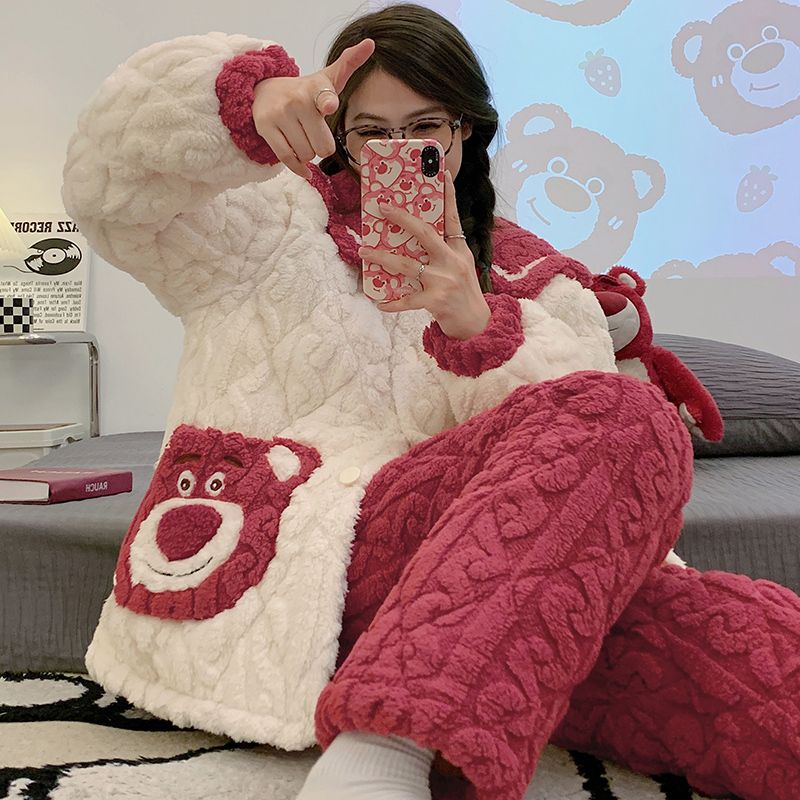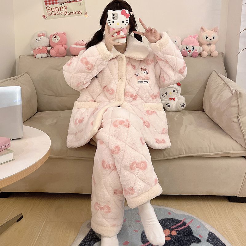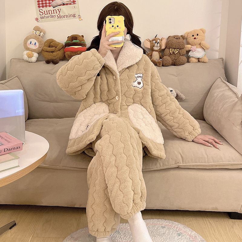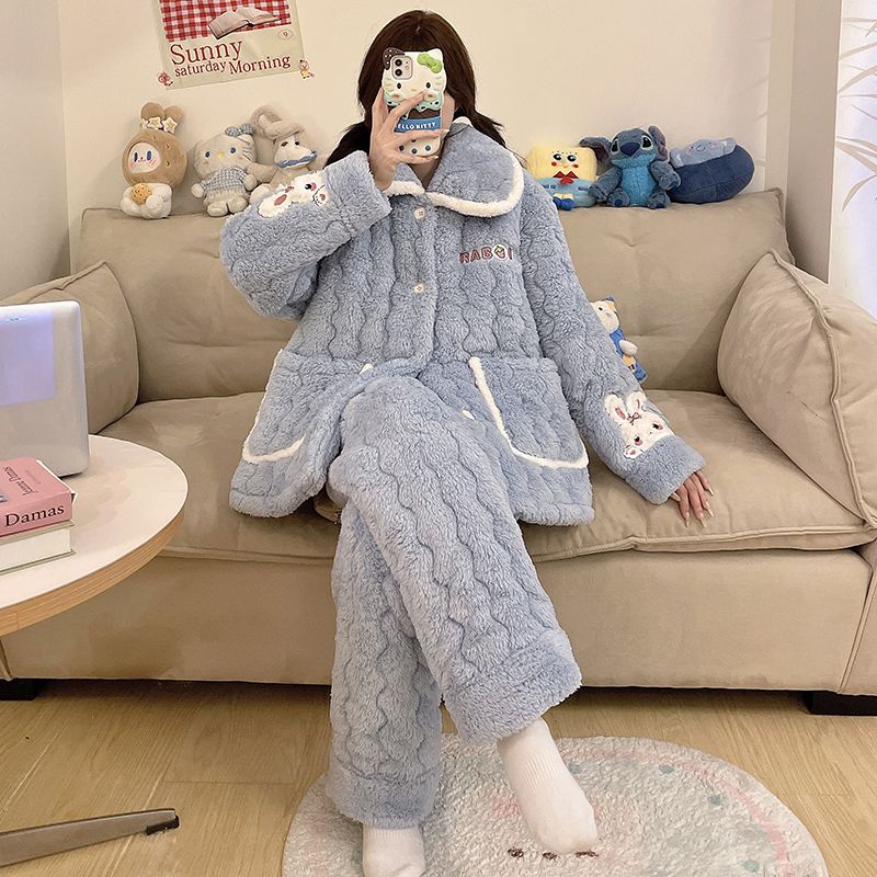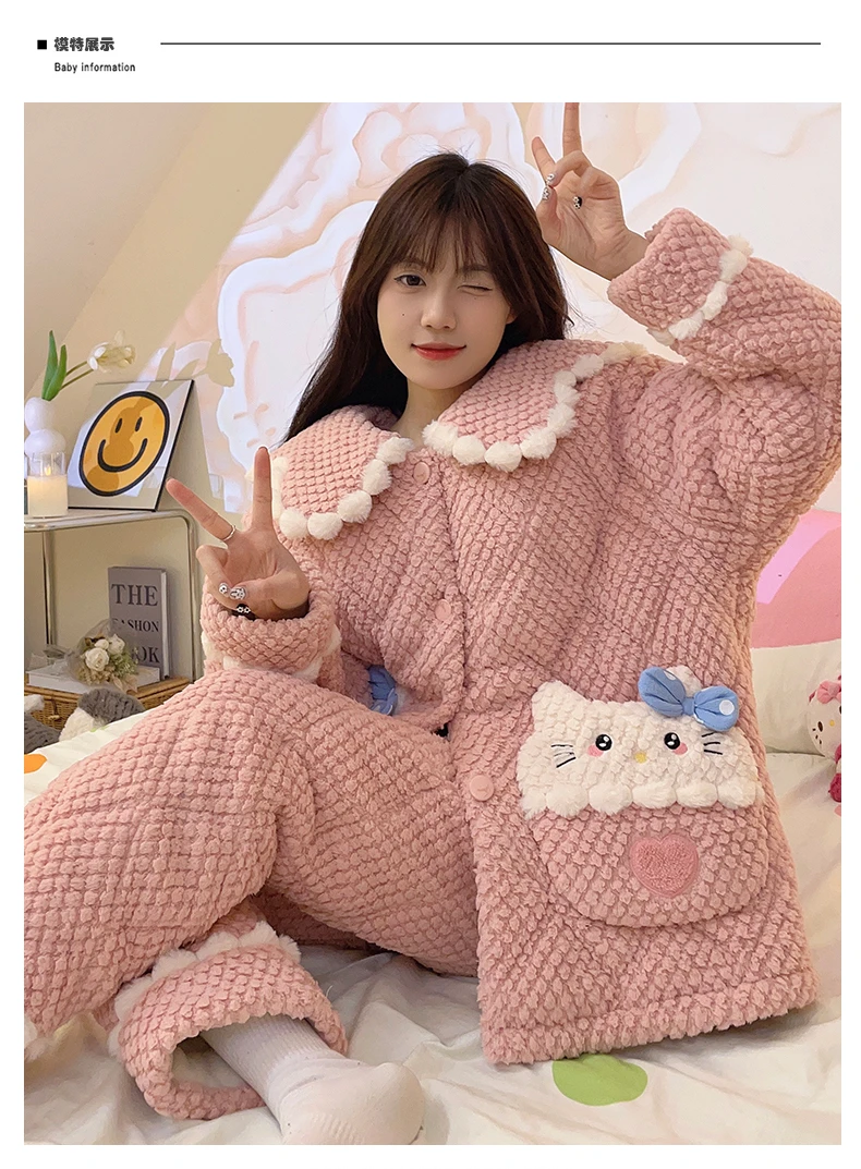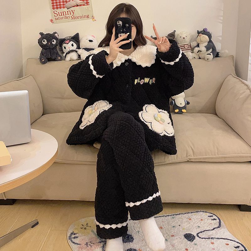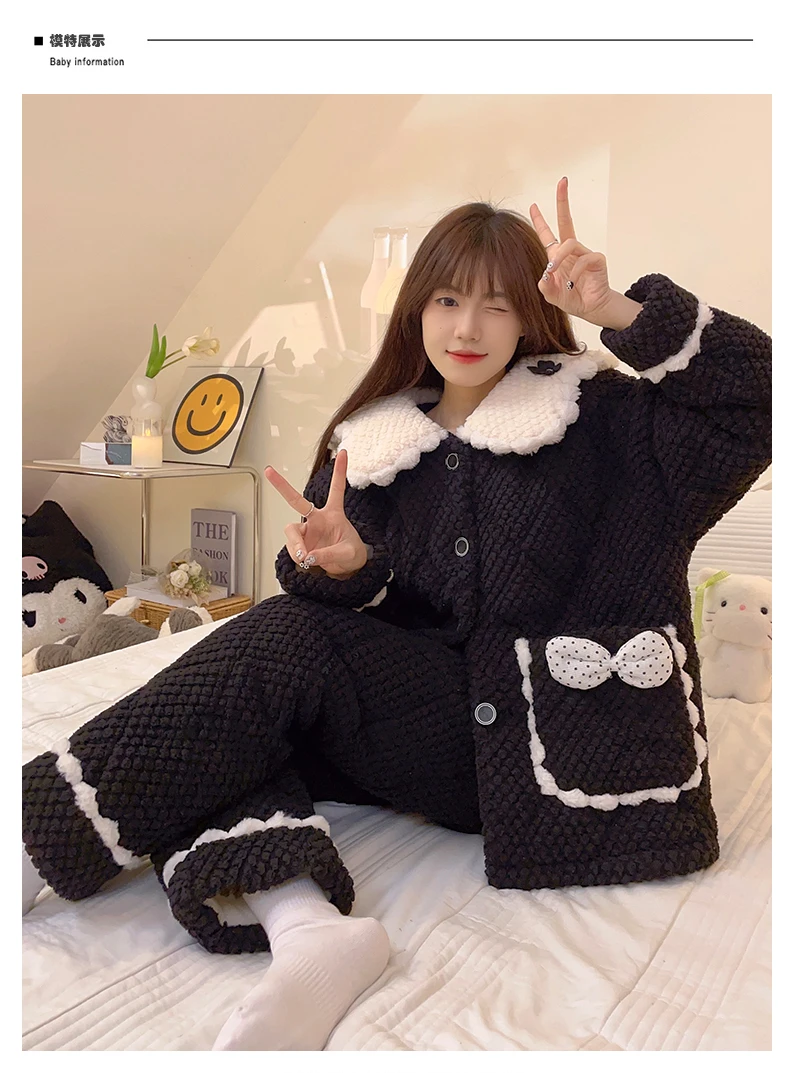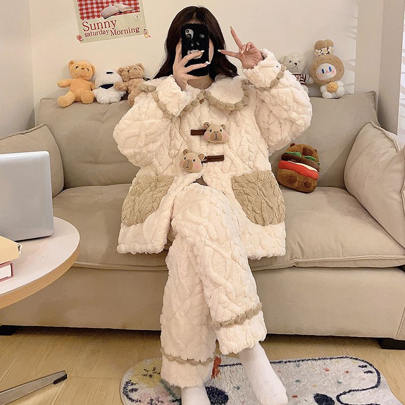 睡衣女秋冬款加厚三层夹棉珊瑚绒冬季长袖套装新款保暖家居服冬天