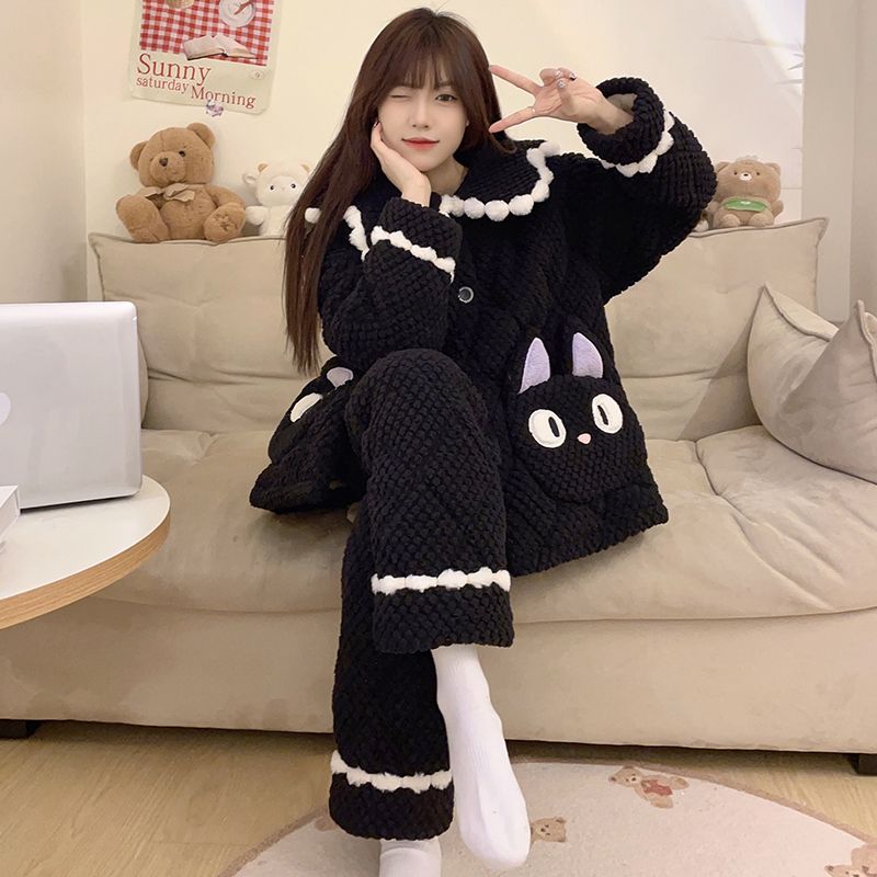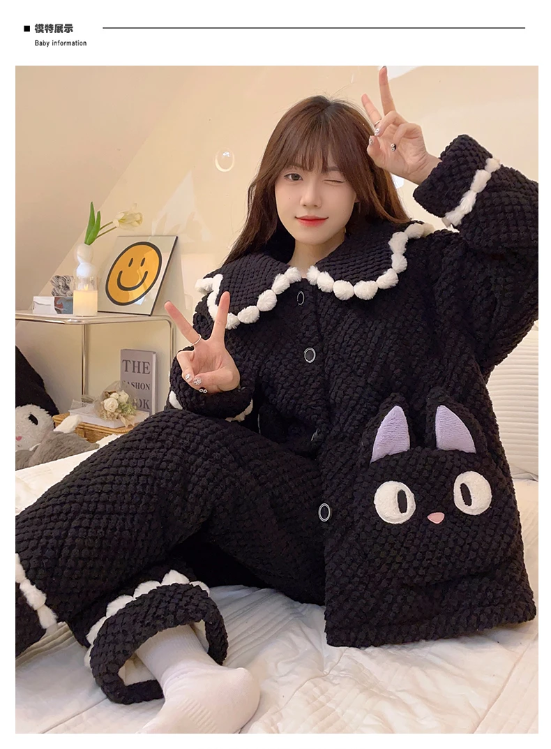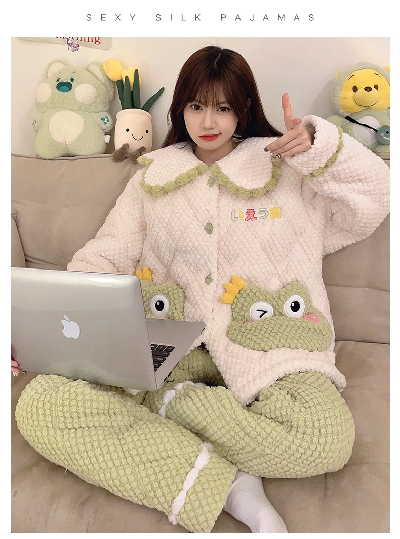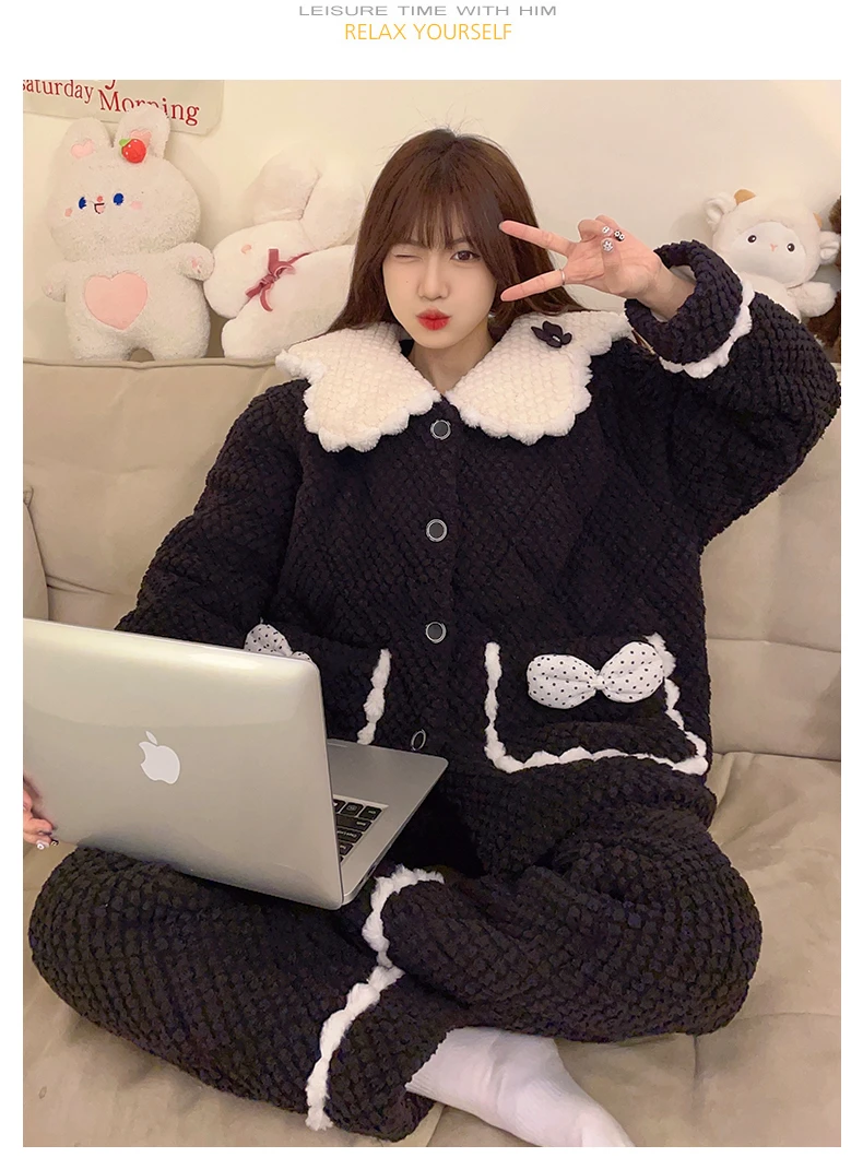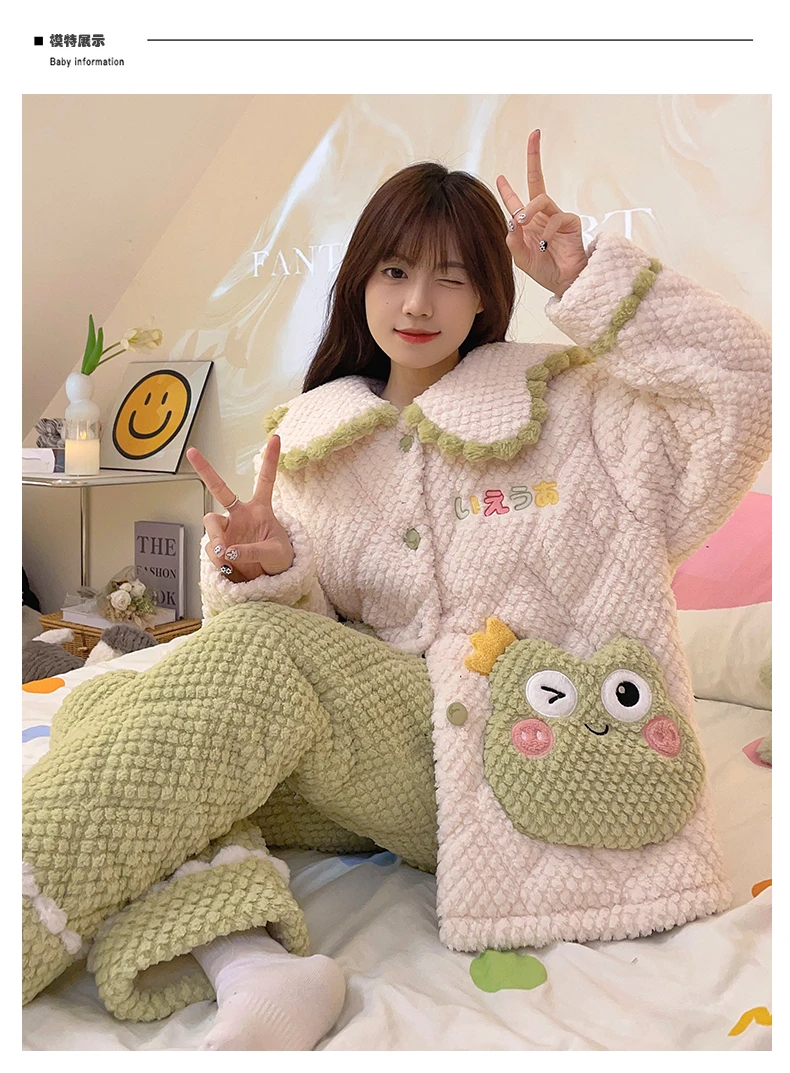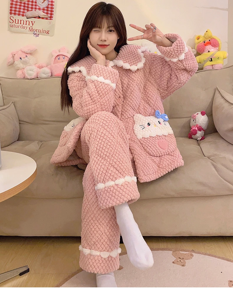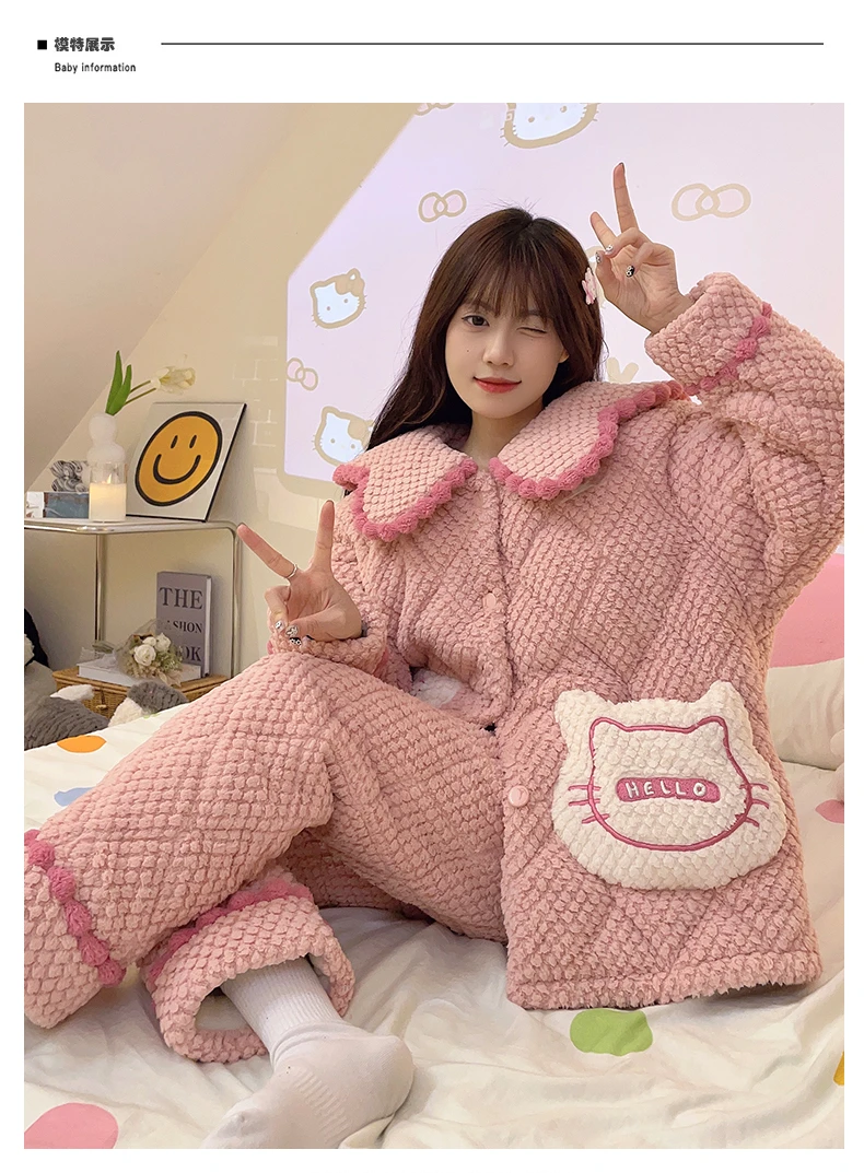 睡衣女秋冬款加厚三层夹棉珊瑚绒冬季长袖套装新款保暖家居服冬天