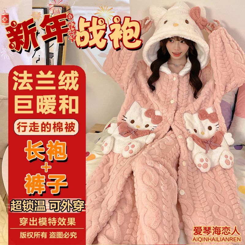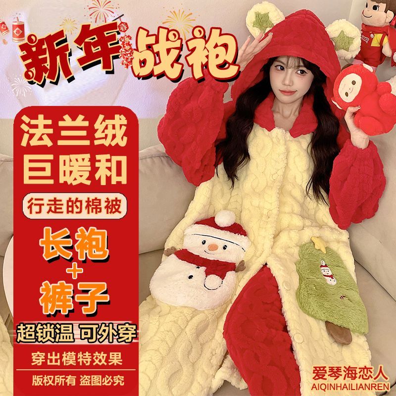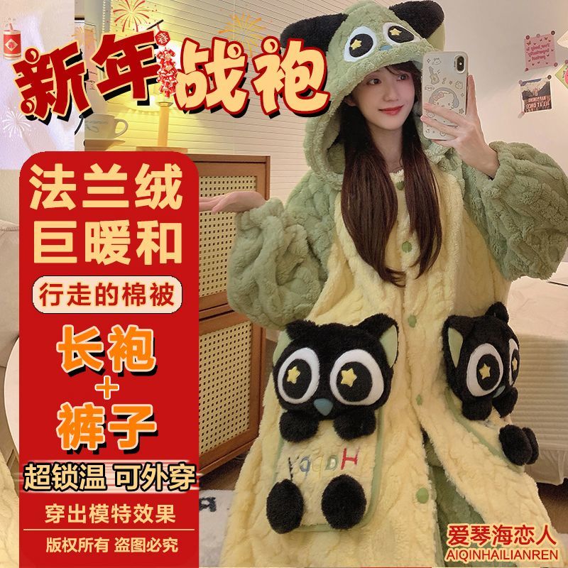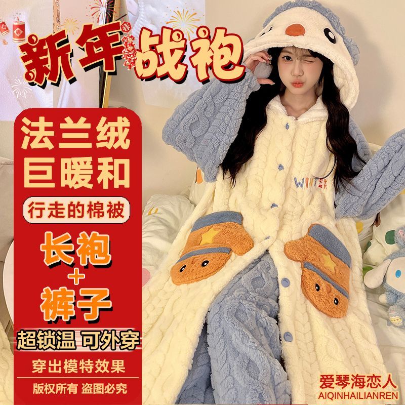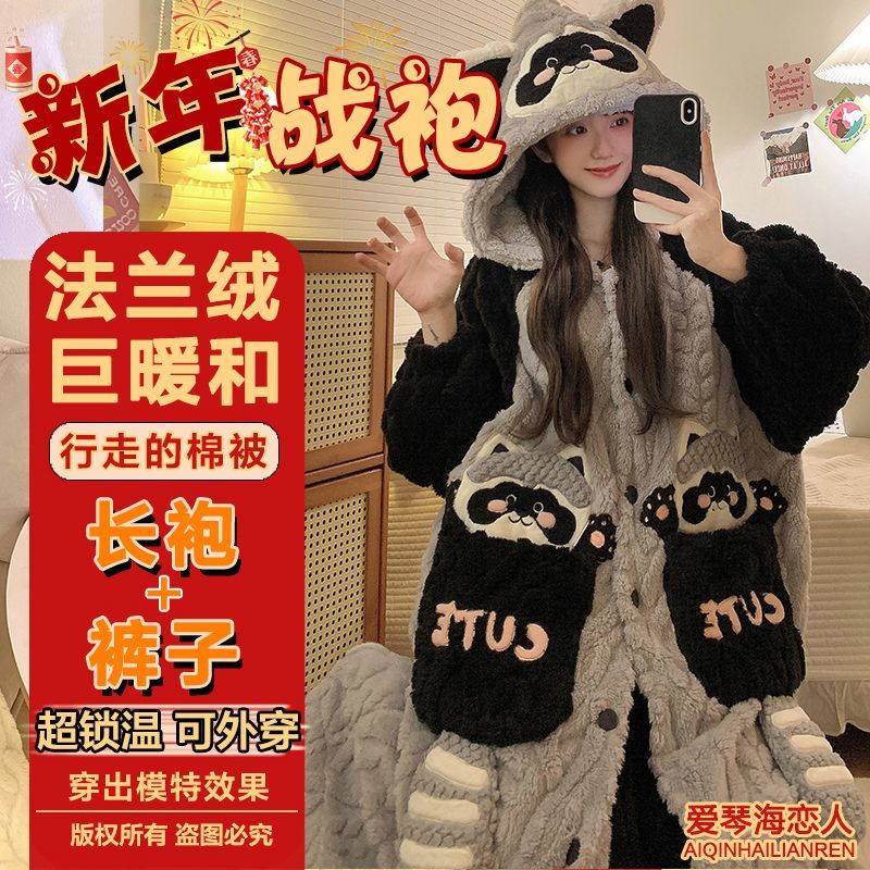 秋冬季珊瑚绒睡衣女2024年长款睡袍加厚加绒连帽法兰绒家居服套装