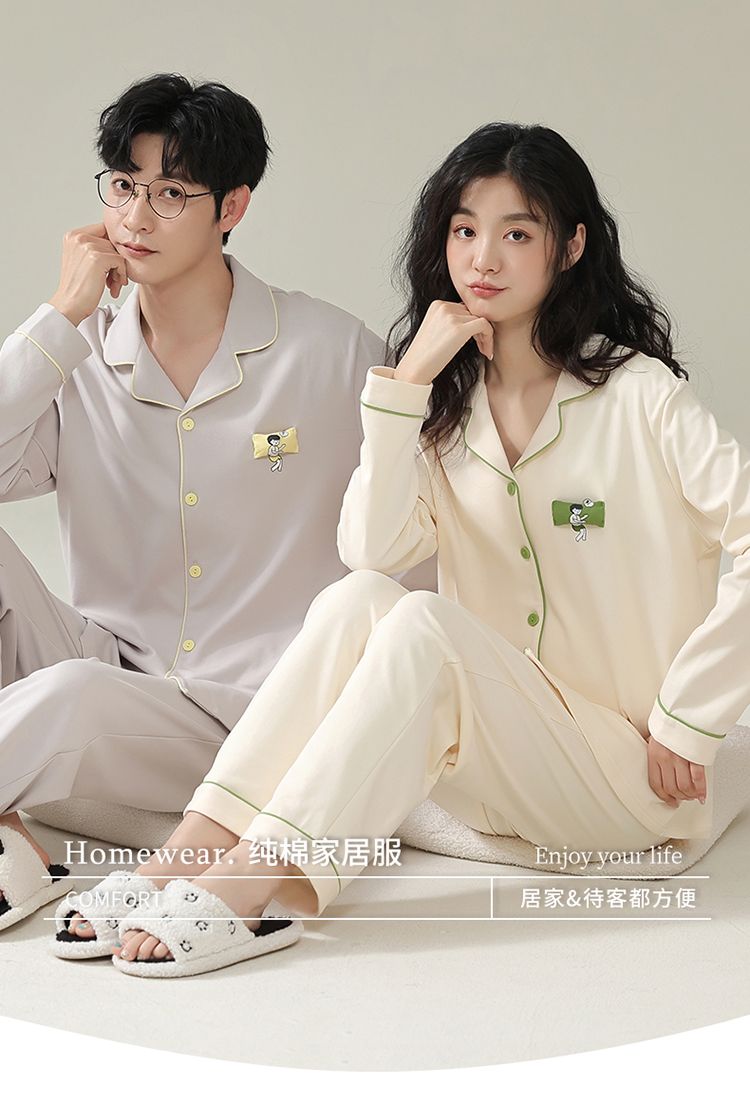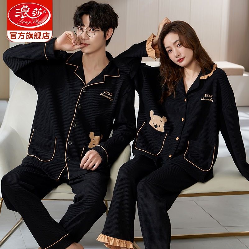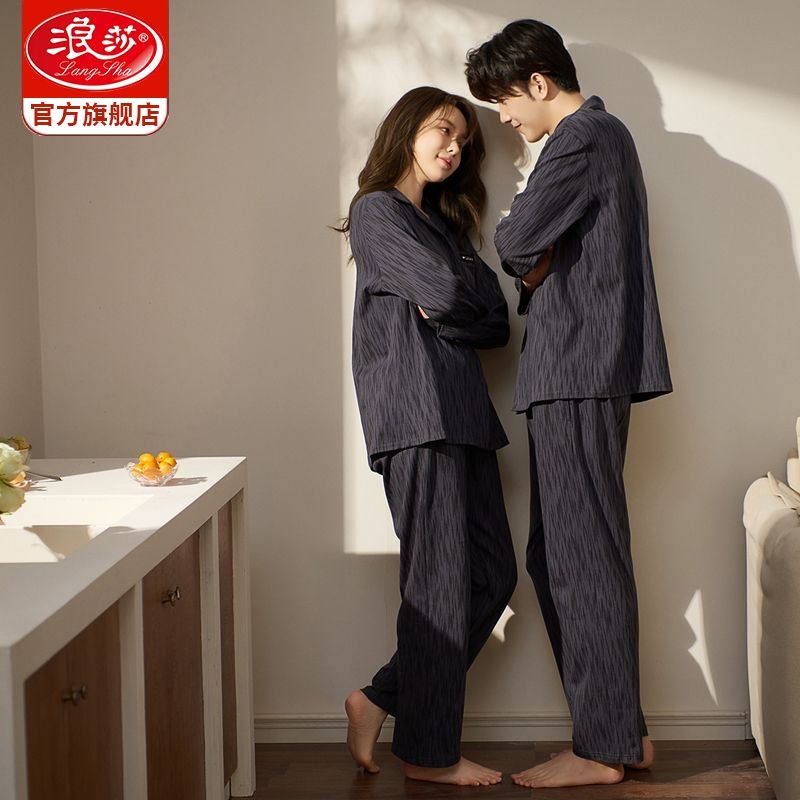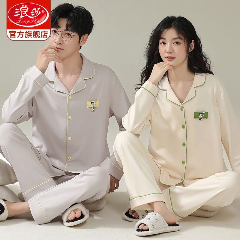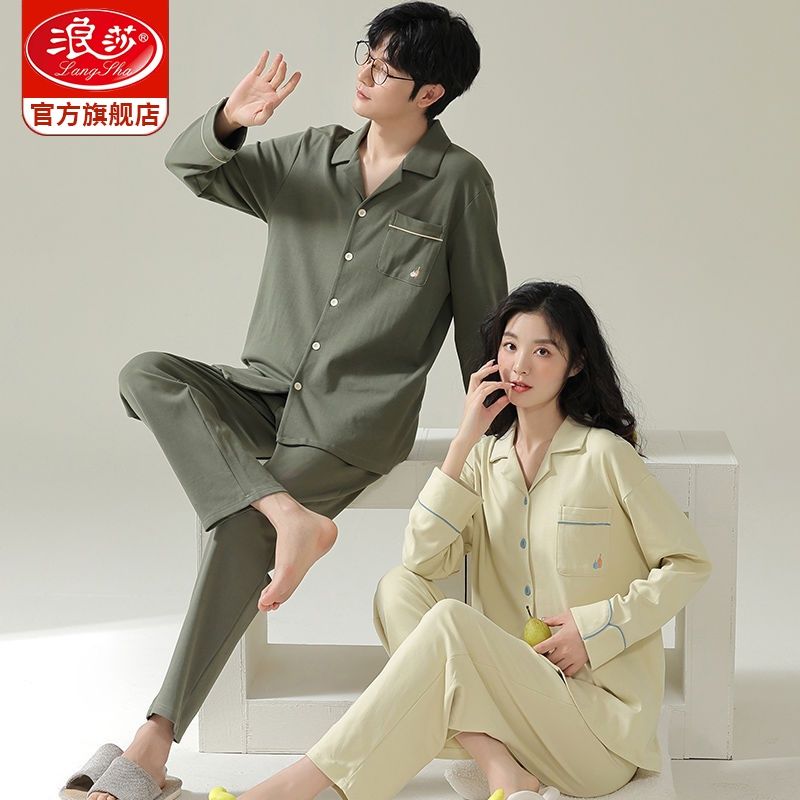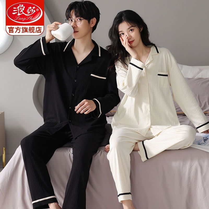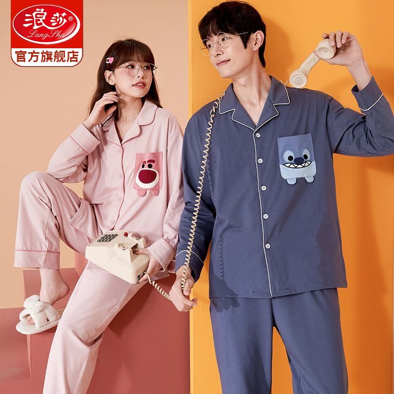浪莎情侣睡衣春秋季纯棉开衫长袖宽松大码家居服一男一女两件套装