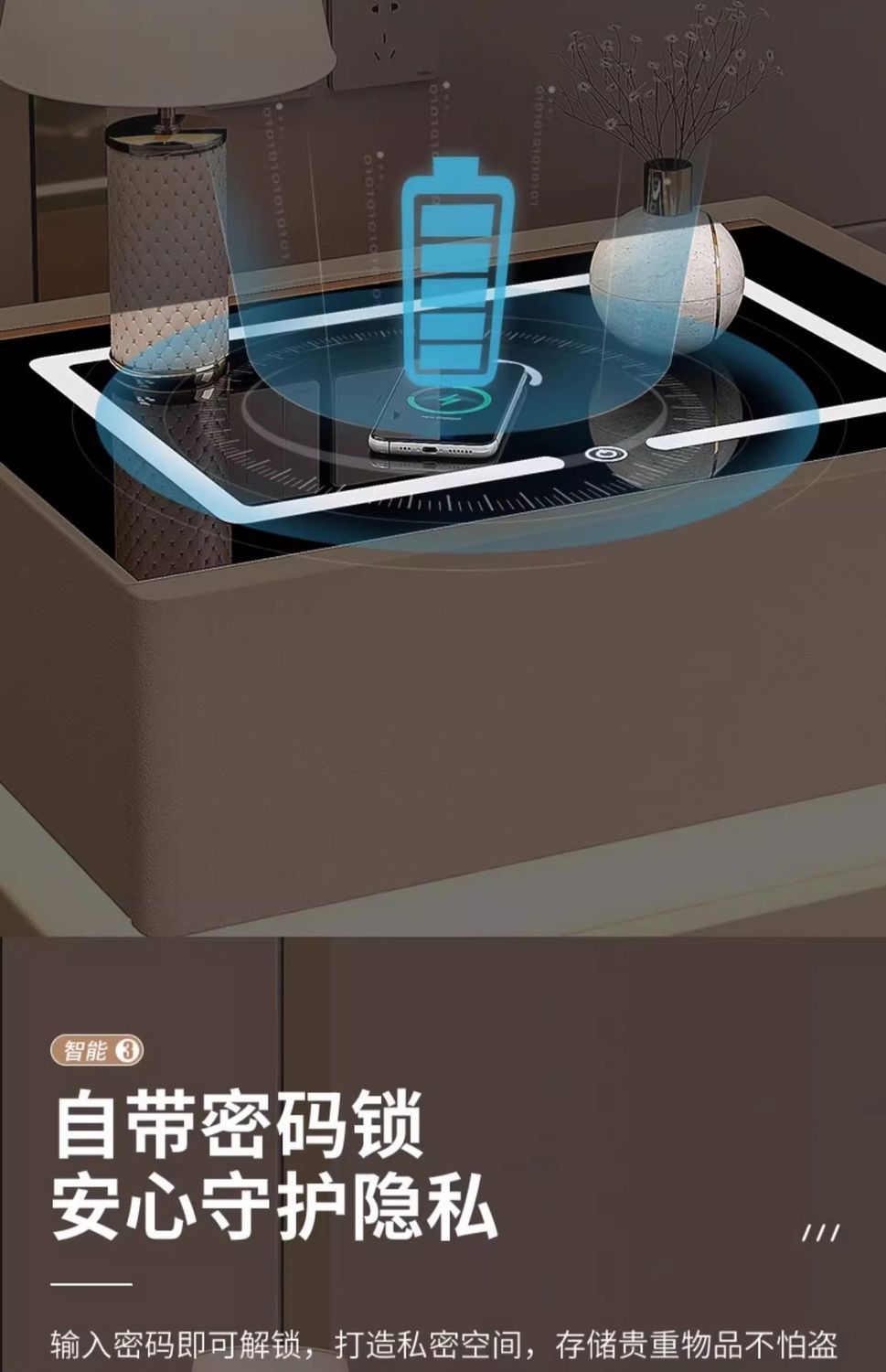 | white and black induction lamp + wireless charging + password lock + tricolour light(白黑感应灯+无线充电+ 密码锁+三色灯) | USD $88.17 | 999999 piece available |