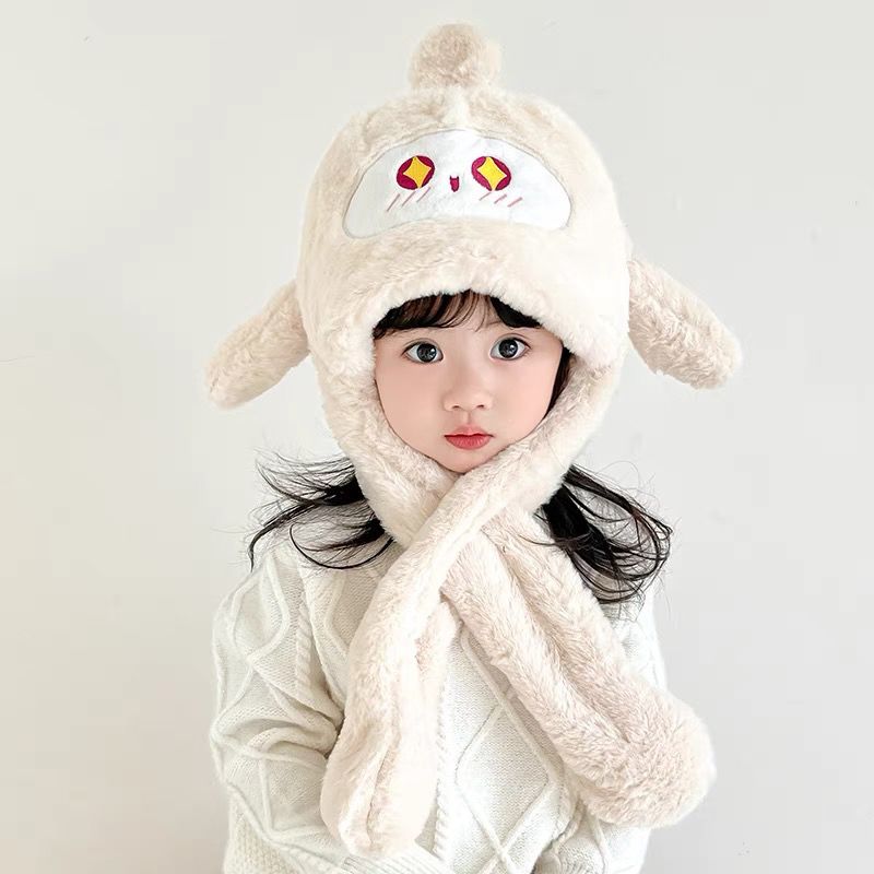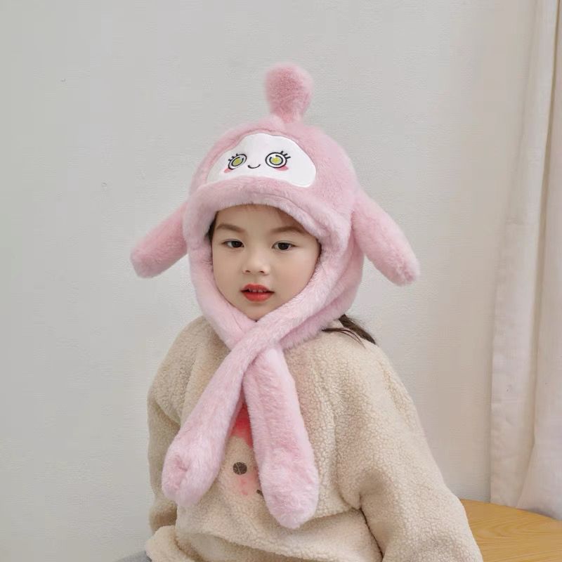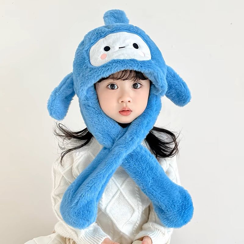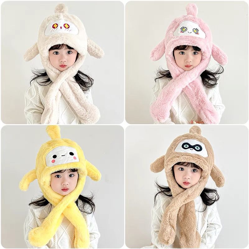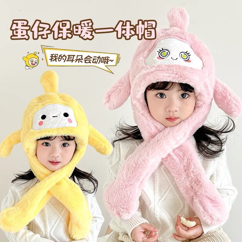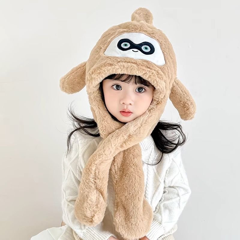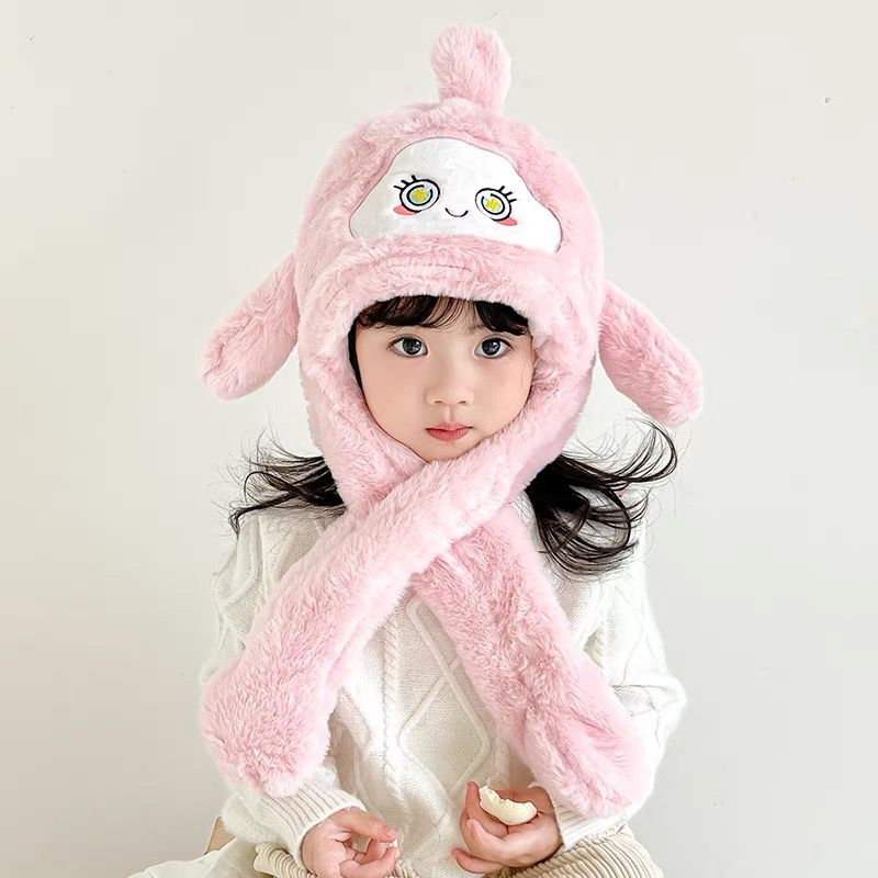 韩国耳朵会动毛绒儿童二合一帽子围巾一体加绒加厚宝宝卡通护耳帽