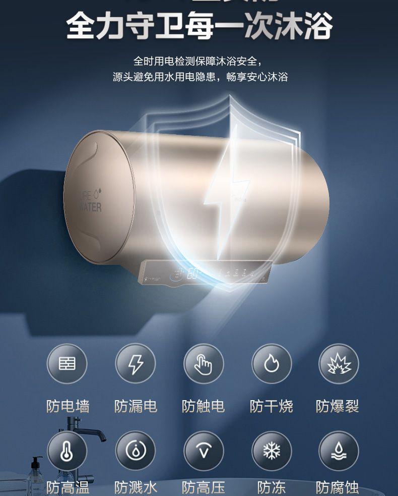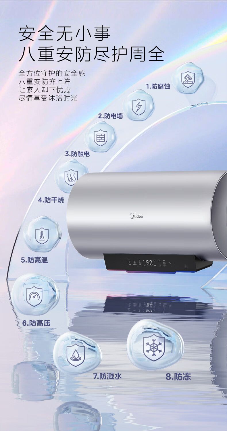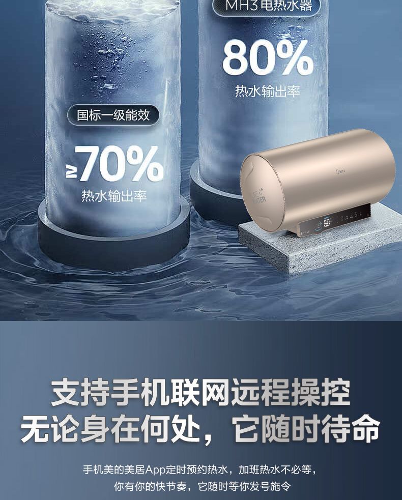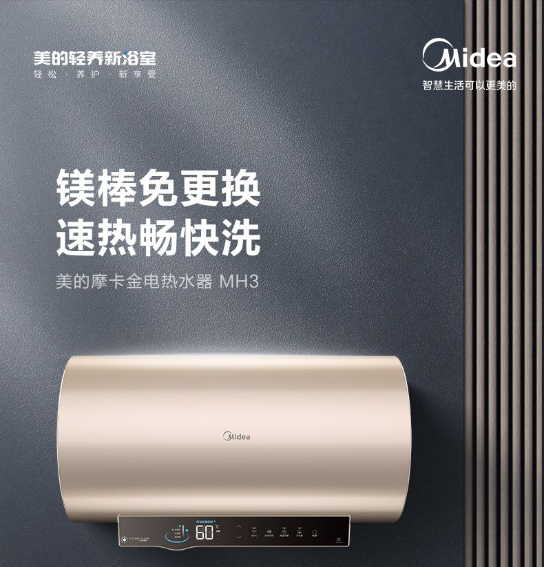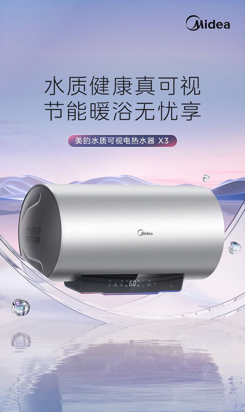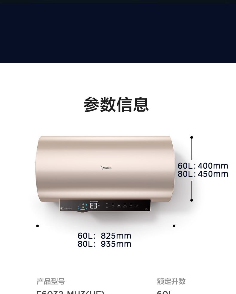 美的电热水器终身免换稀土镁棒水质可视3300W大功率60L/80L/100L