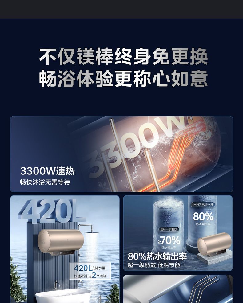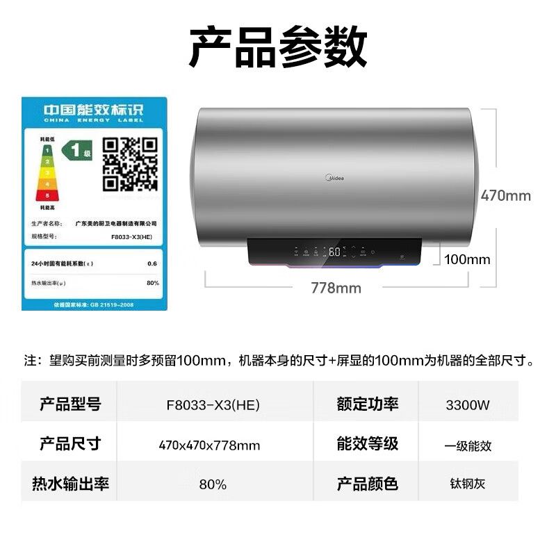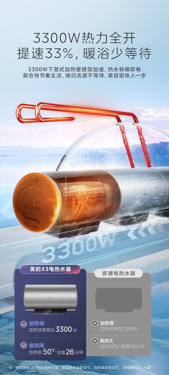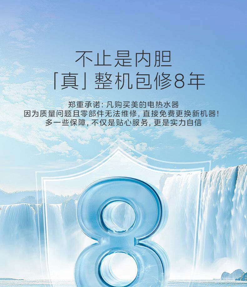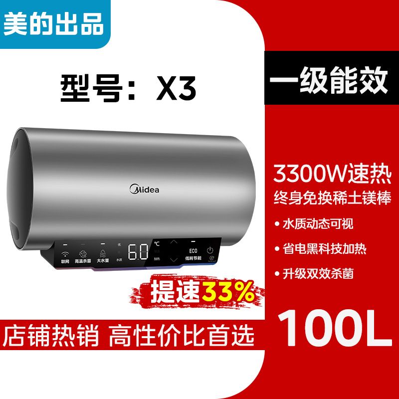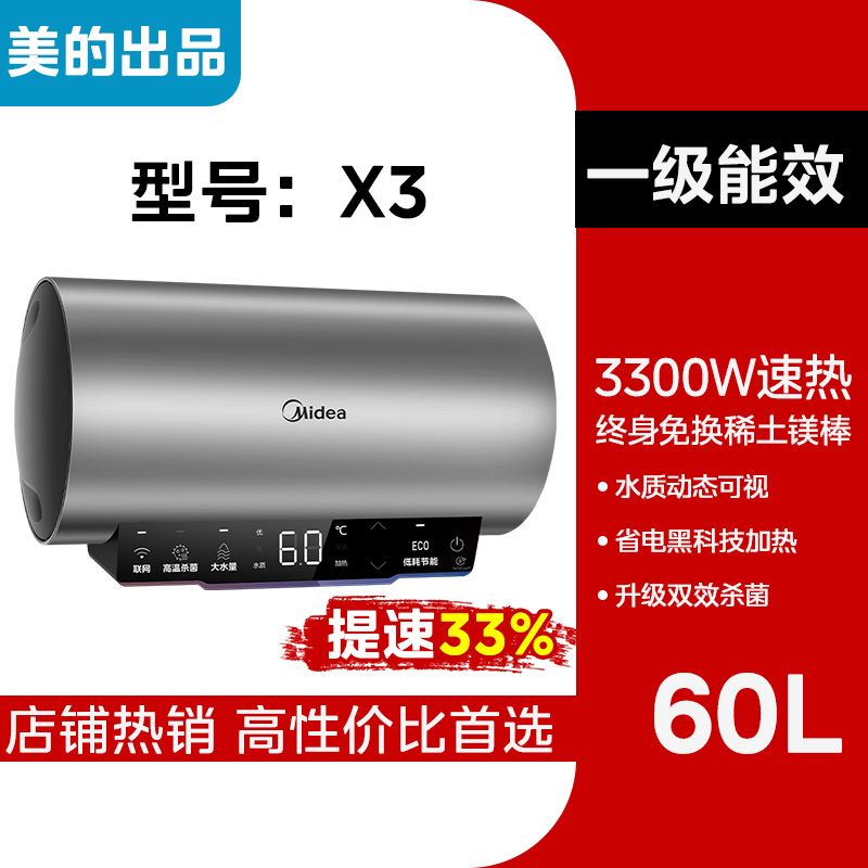 美的电热水器终身免换稀土镁棒水质可视3300W大功率60L/80L/100L