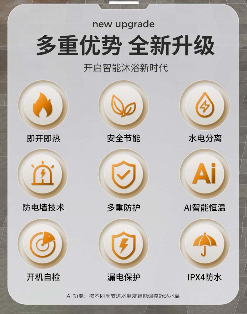 | 6000w silver gray infinite hot water safety constant temperature(6000瓦 银灰 无限热水 安全恒温) | USD $71.98 | 999999 piece available |