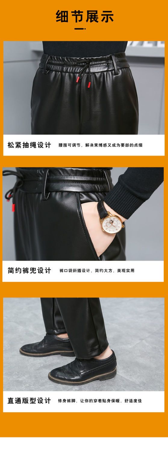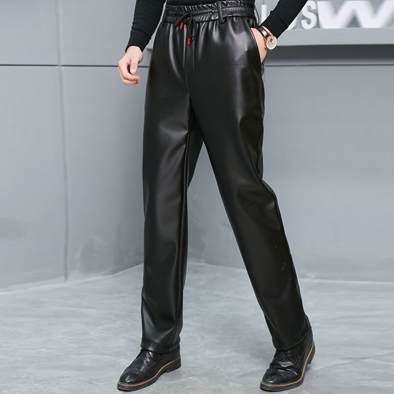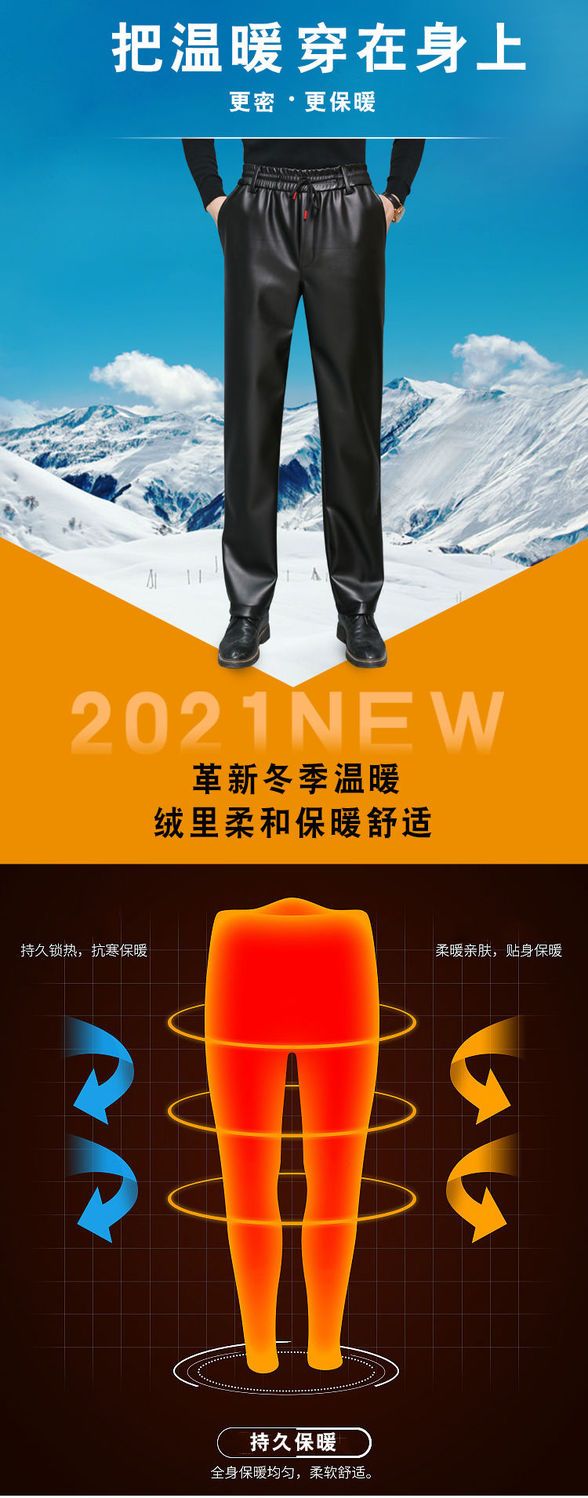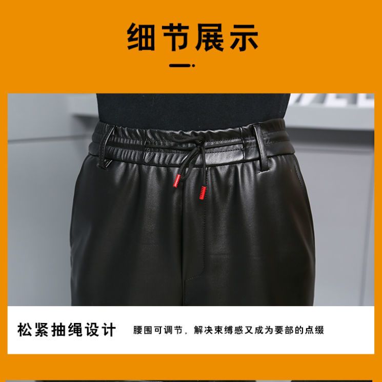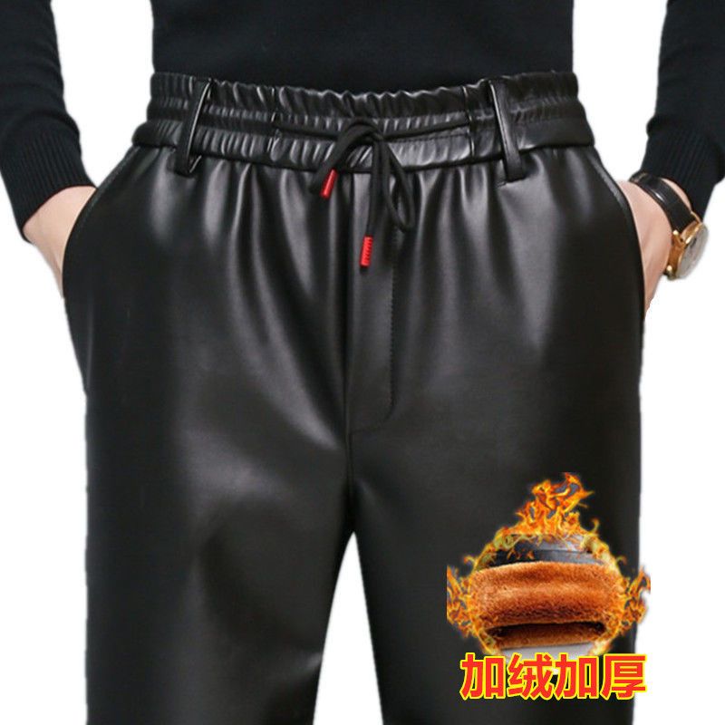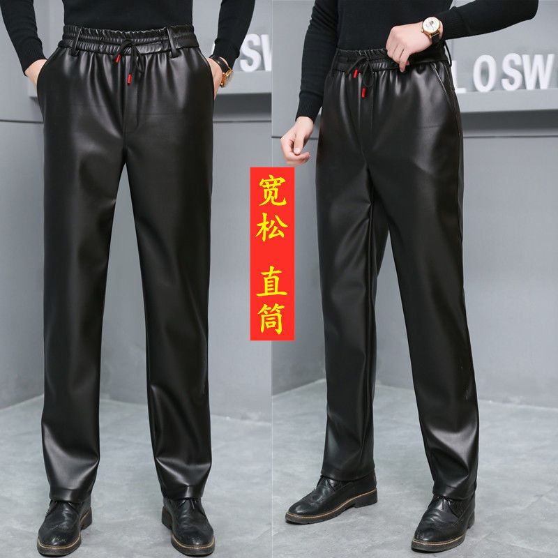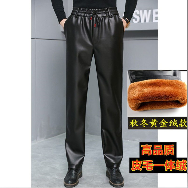 皮裤子男士防水软皮加绒加厚秋冬季直筒宽松皮毛一体工作中老年裤