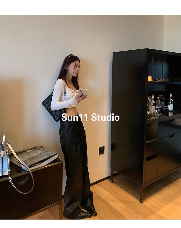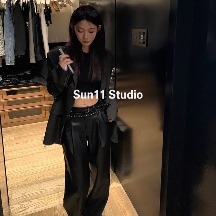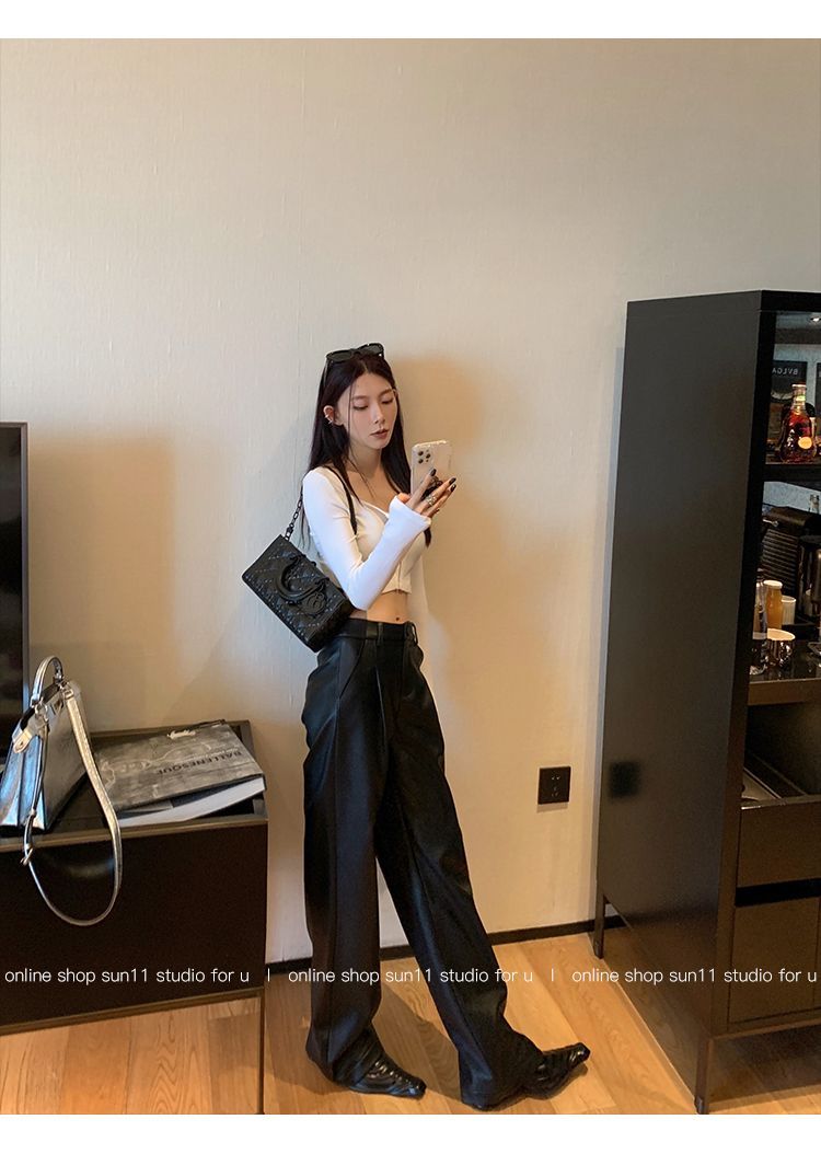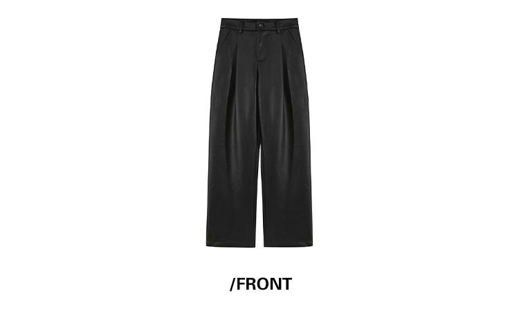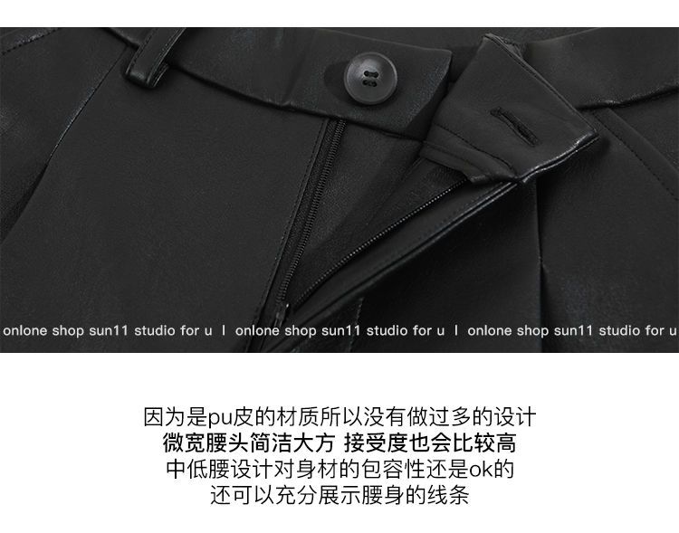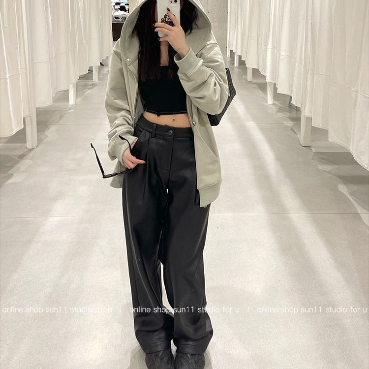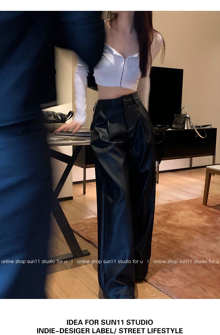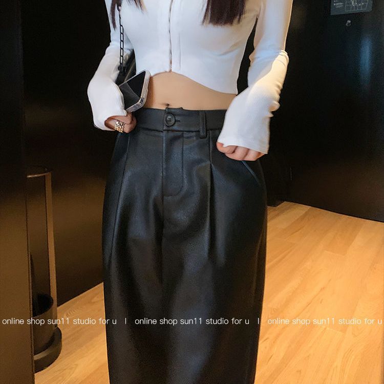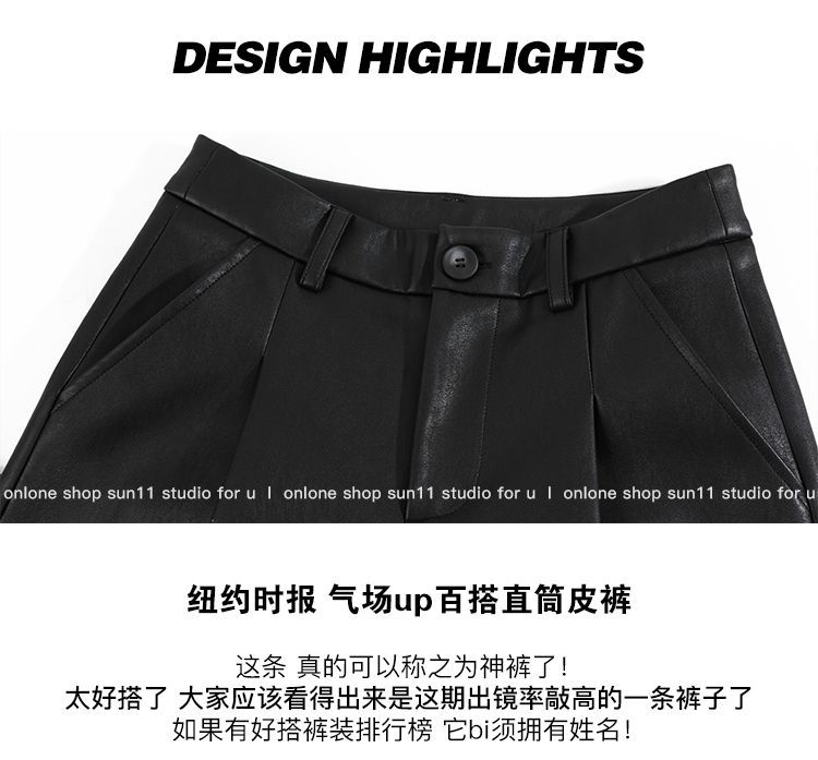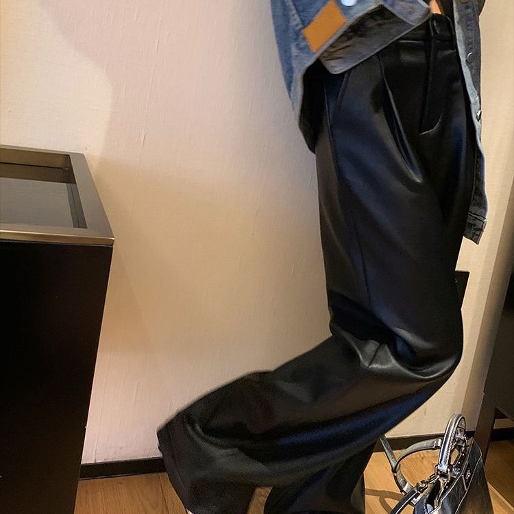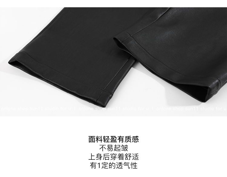 黑色pu皮休闲裤女秋季大码高腰显瘦遮肉宽松阔腿垂感直筒哑光皮裤