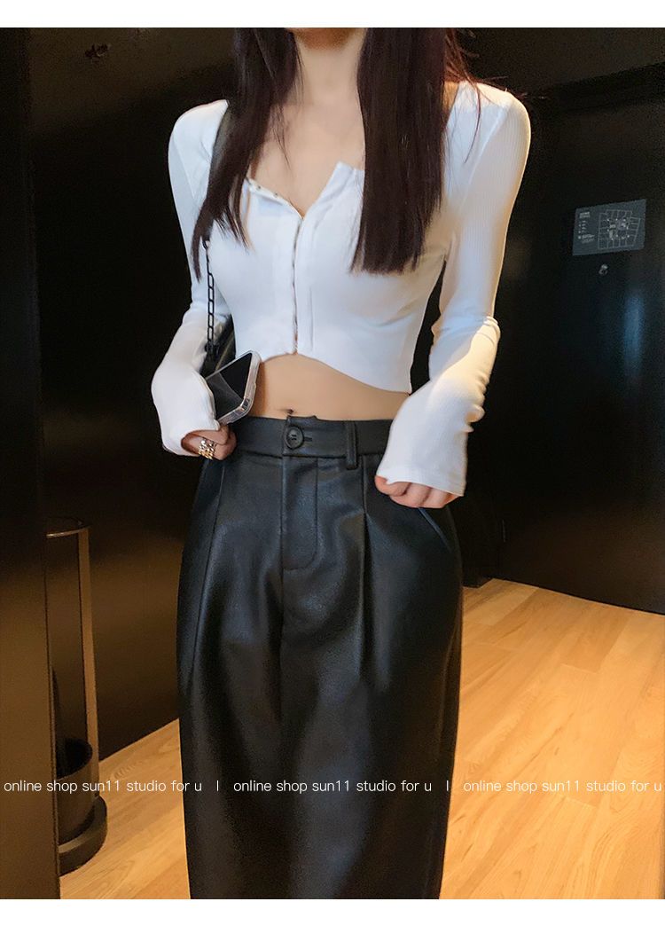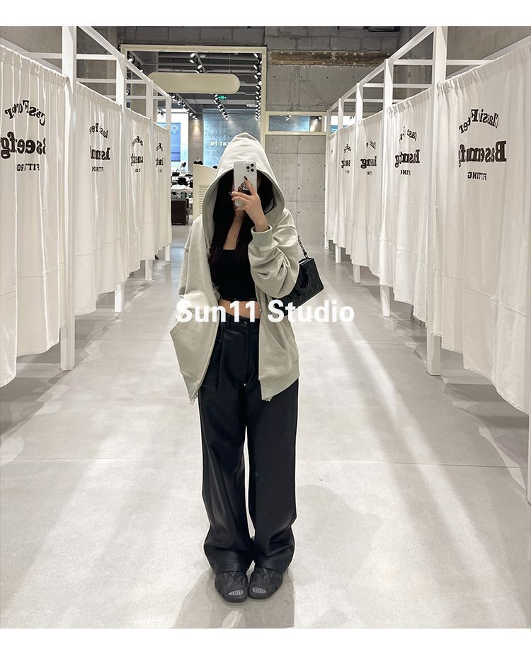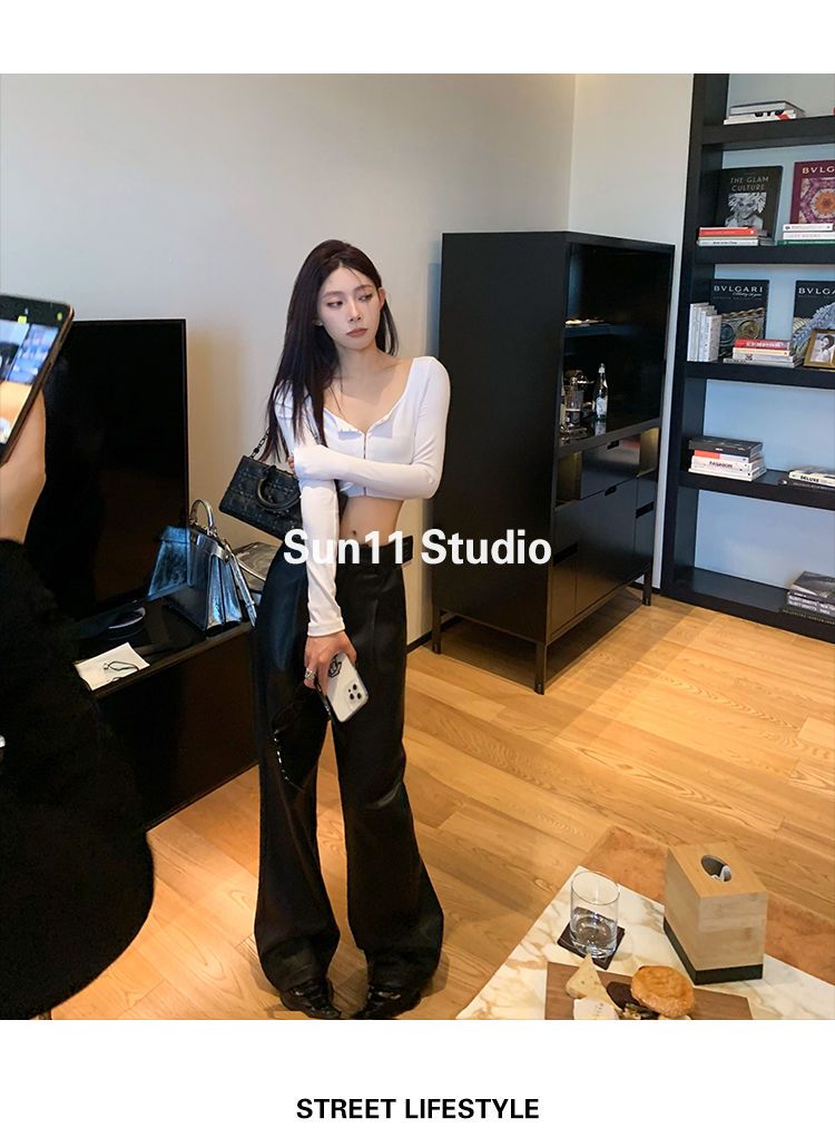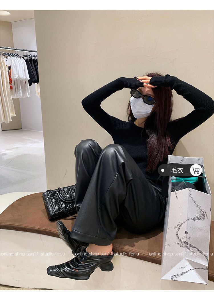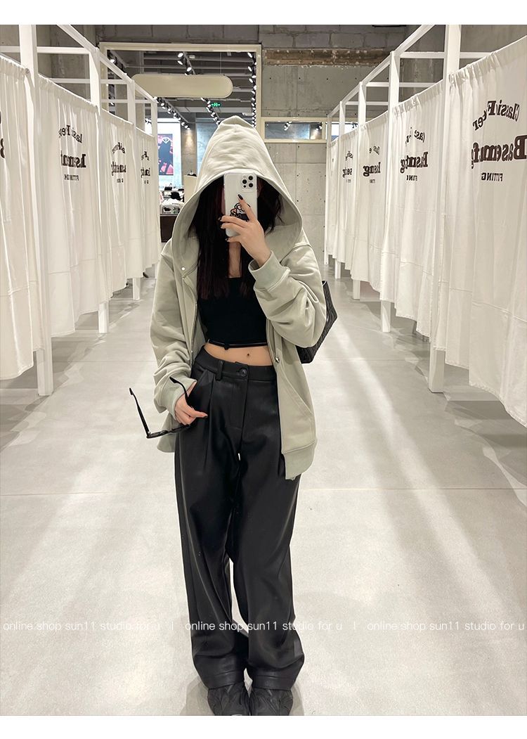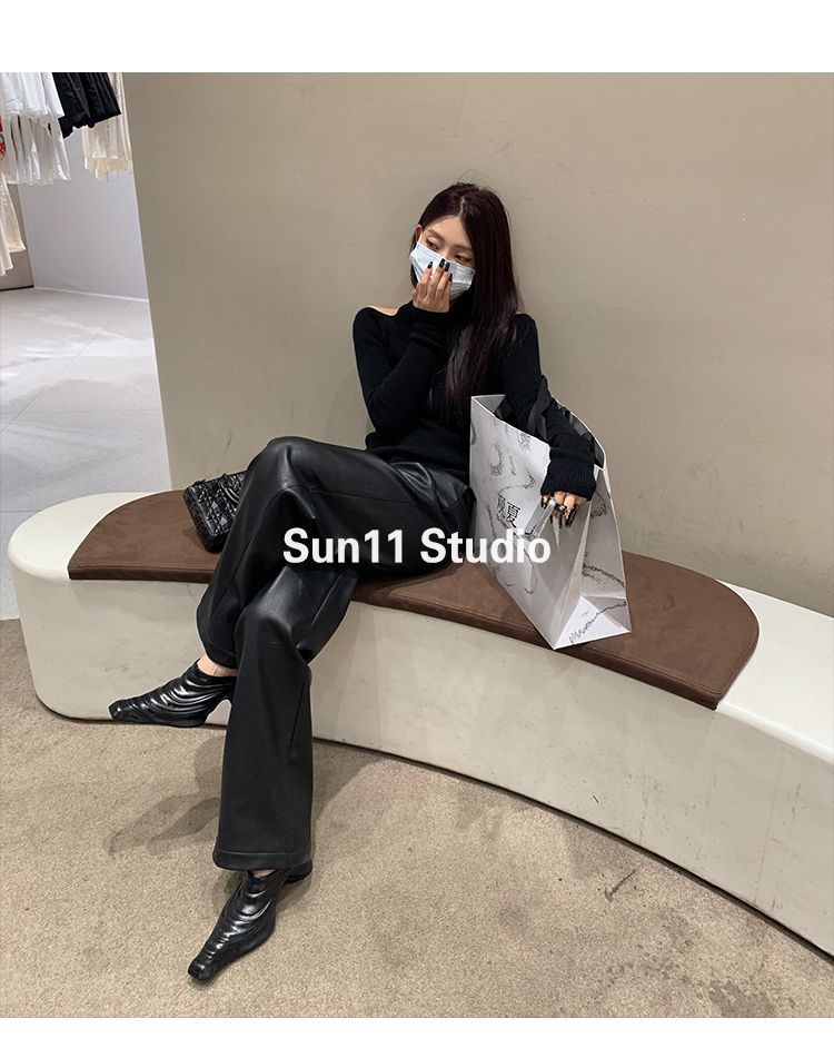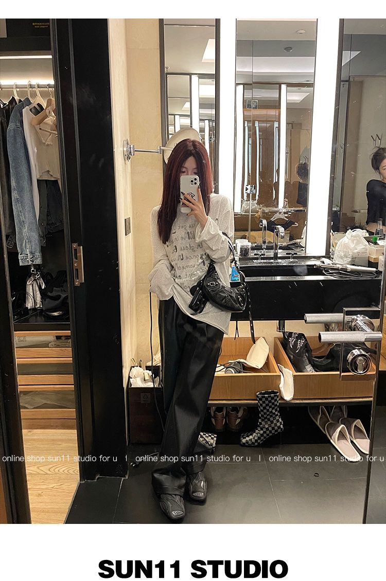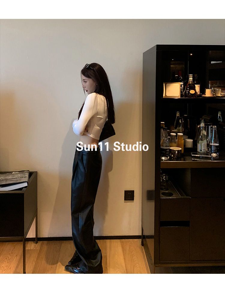 黑色pu皮休闲裤女秋季大码高腰显瘦遮肉宽松阔腿垂感直筒哑光皮裤