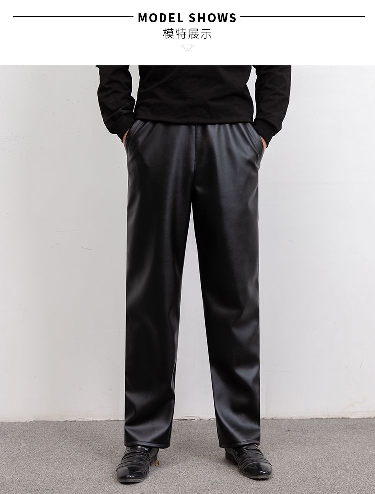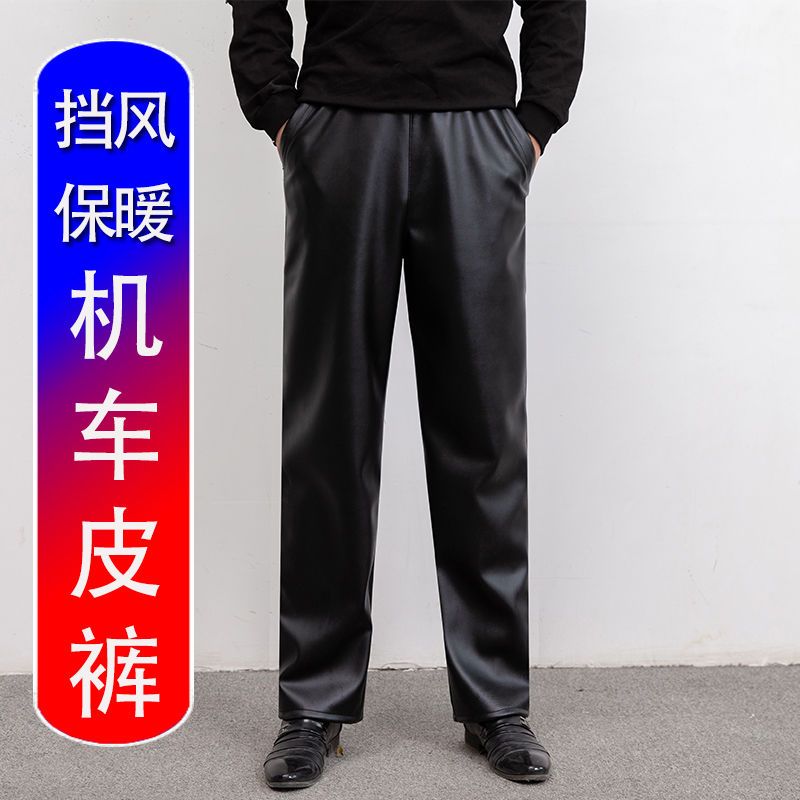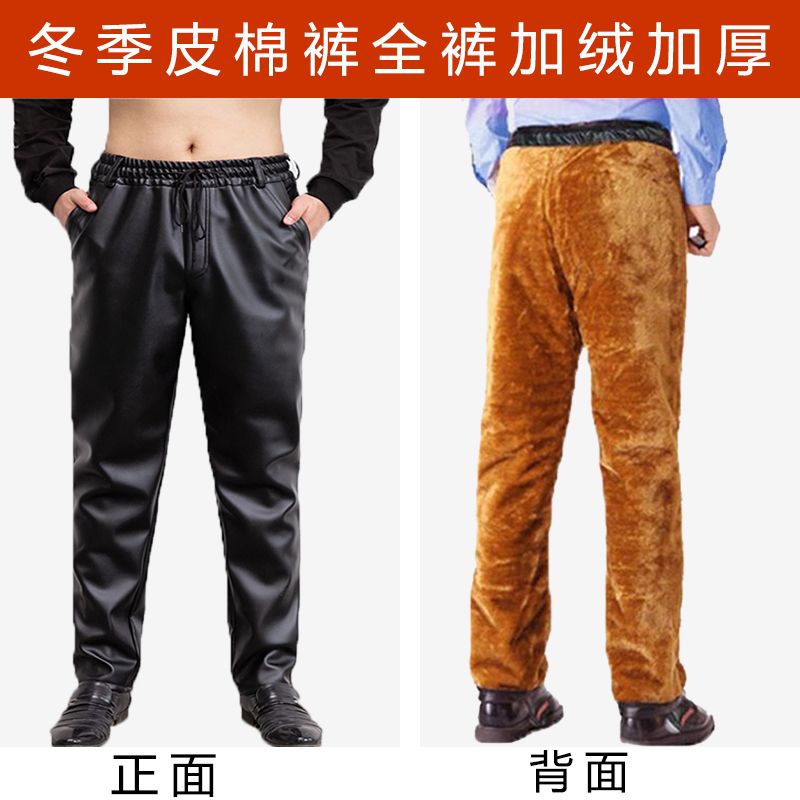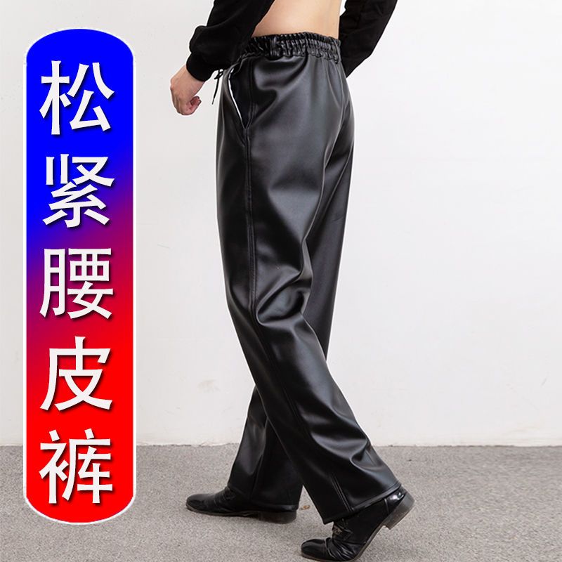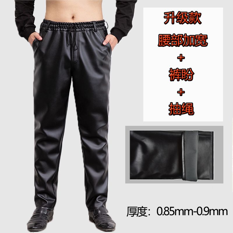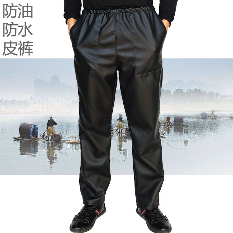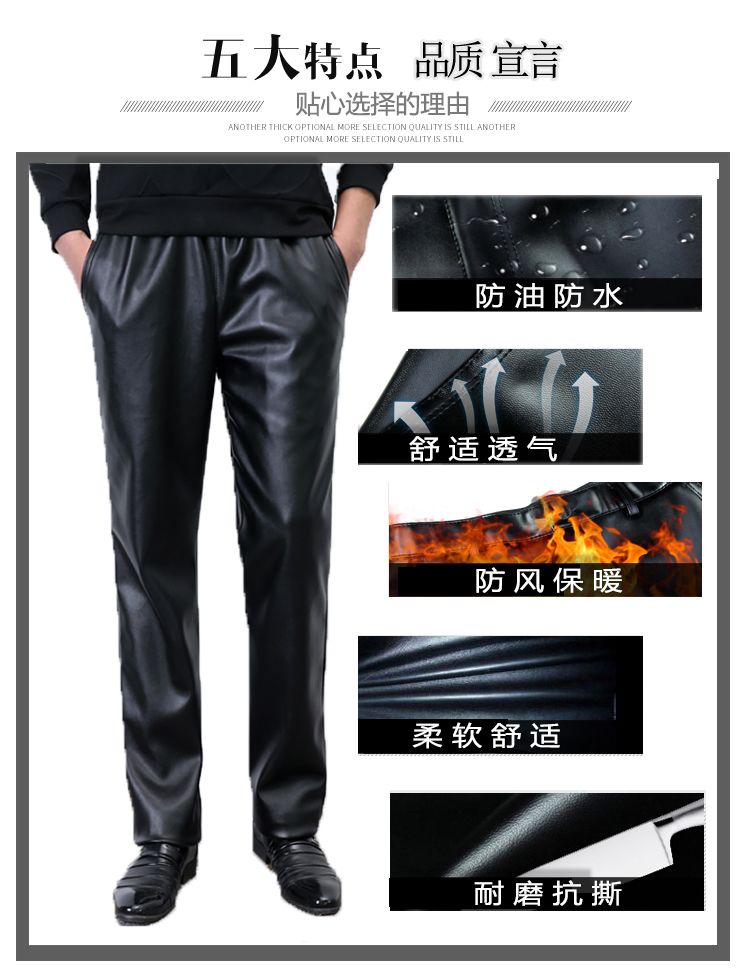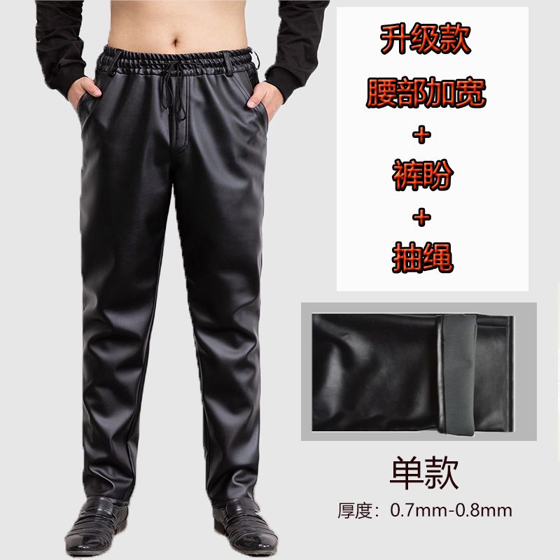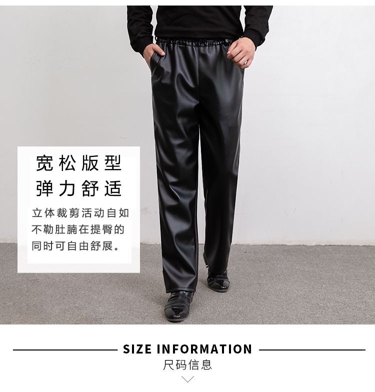秋冬季松紧腰皮裤男加绒加厚中老年高腰保暖男士防水防油PU皮裤子
