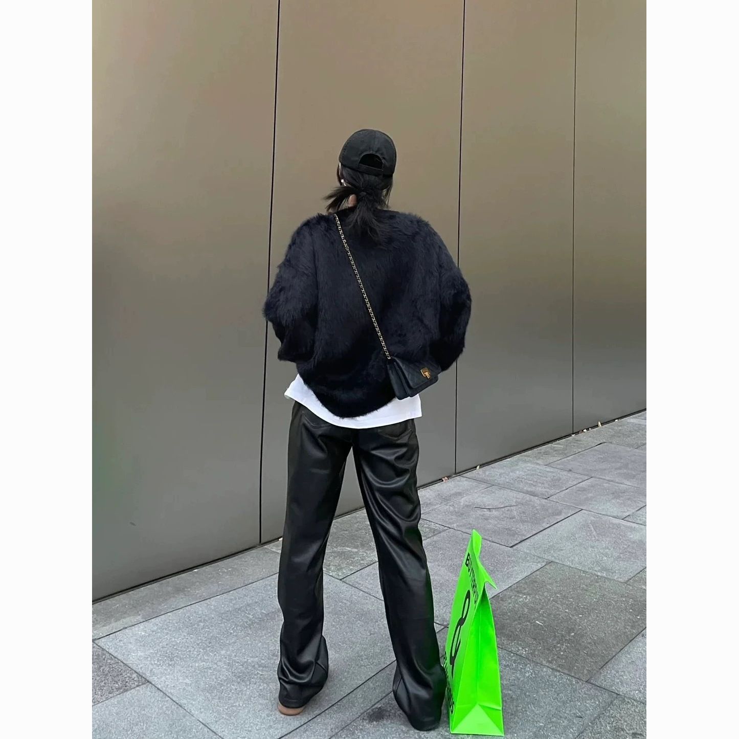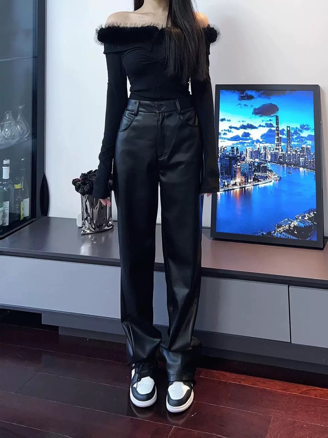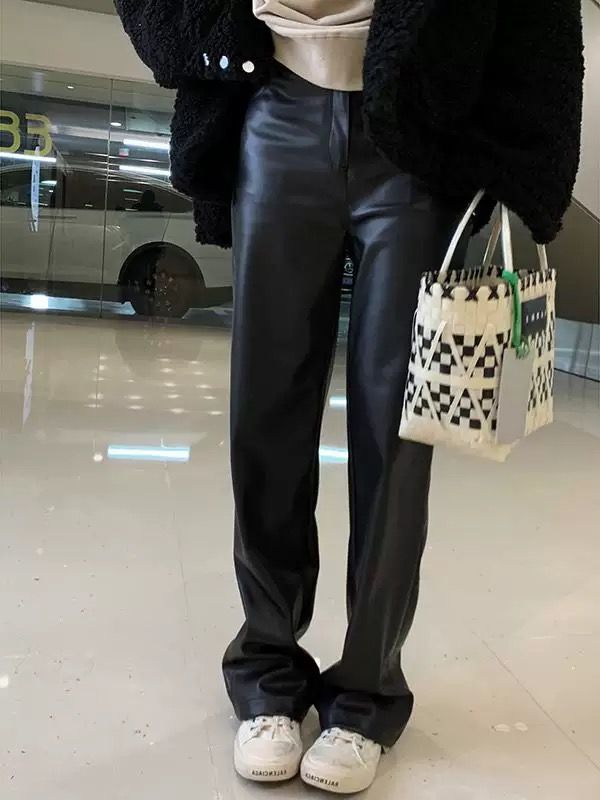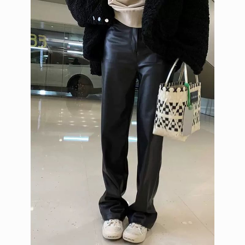 哑光皮裤女2024秋冬加绒高腰休闲宽松直筒窄版阔腿裤高腰拖地裤子