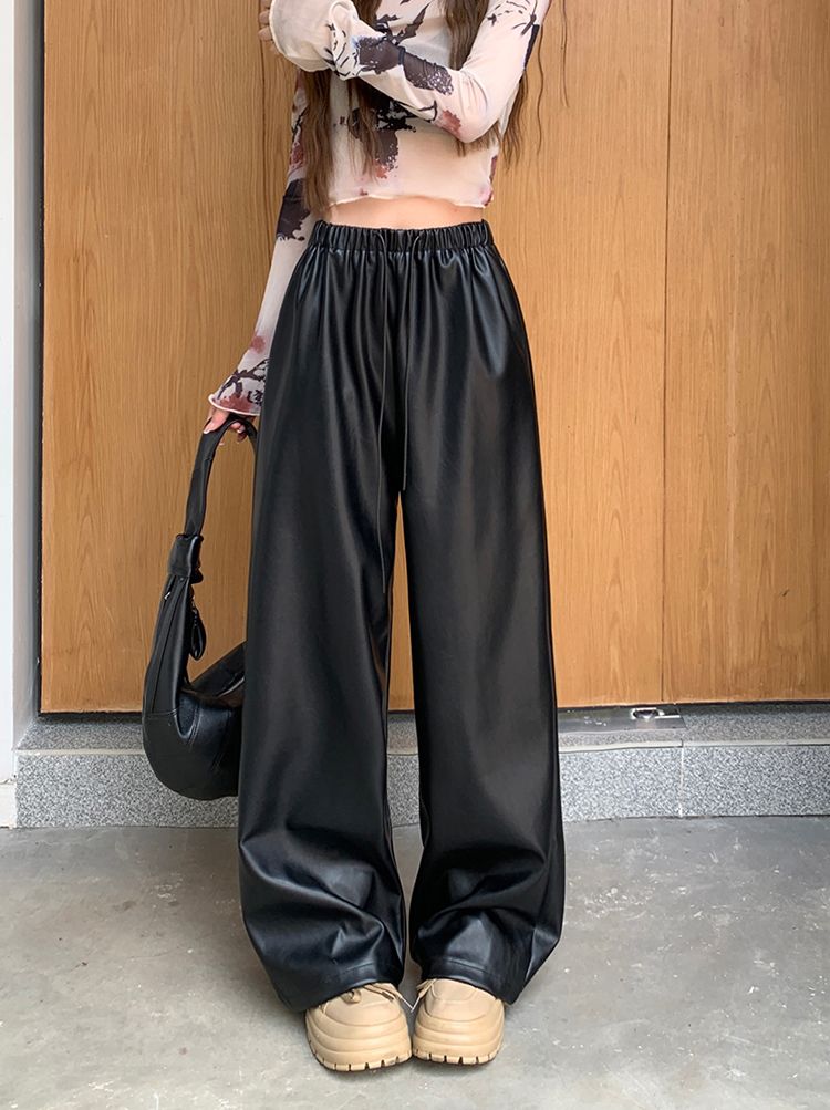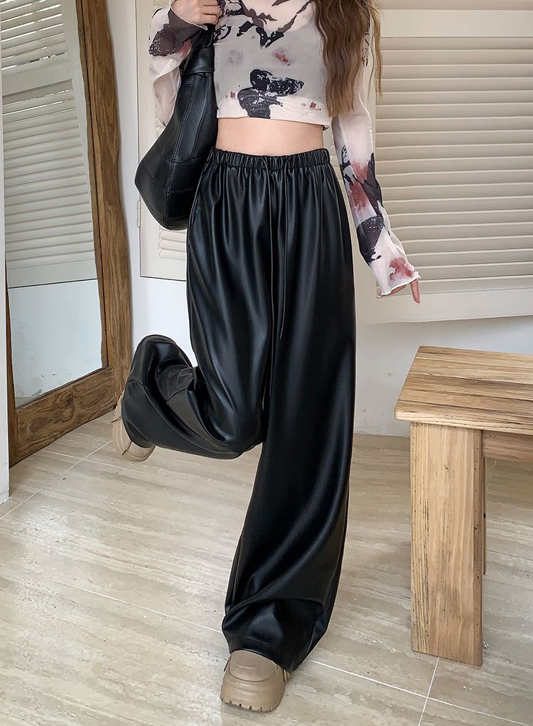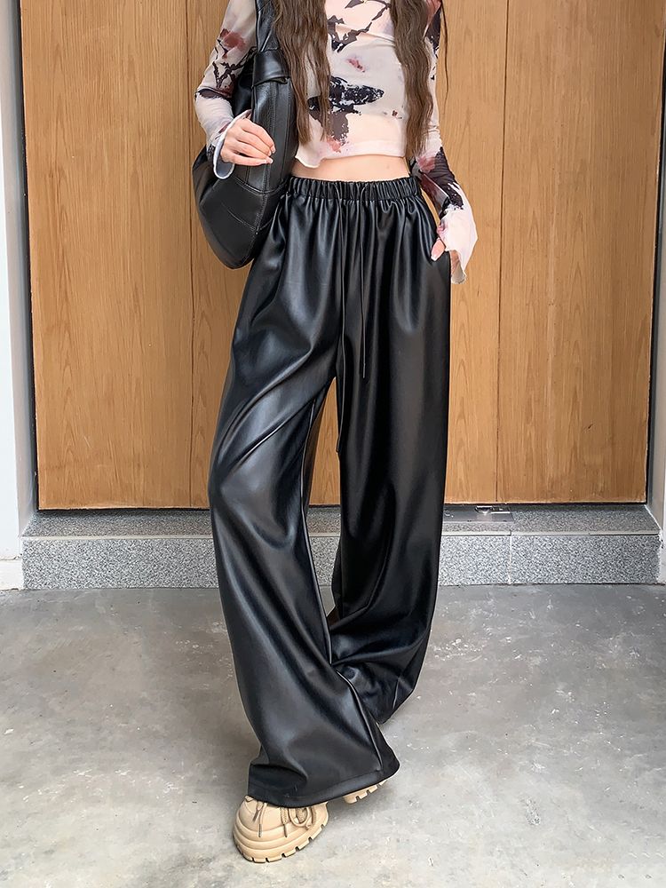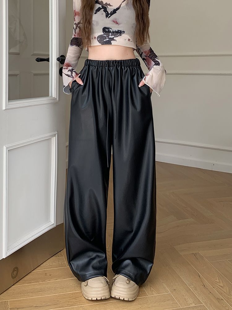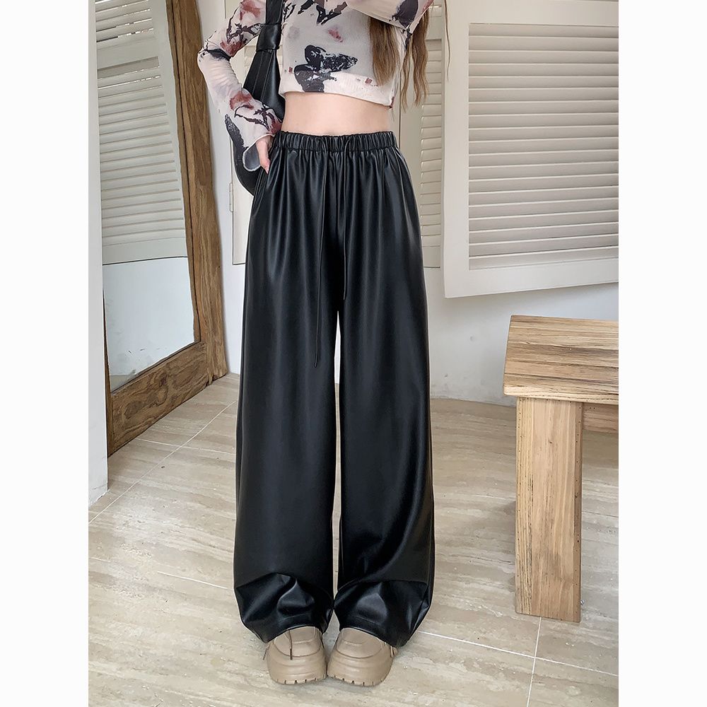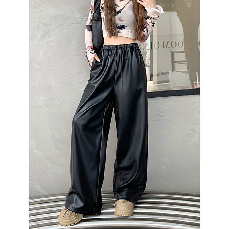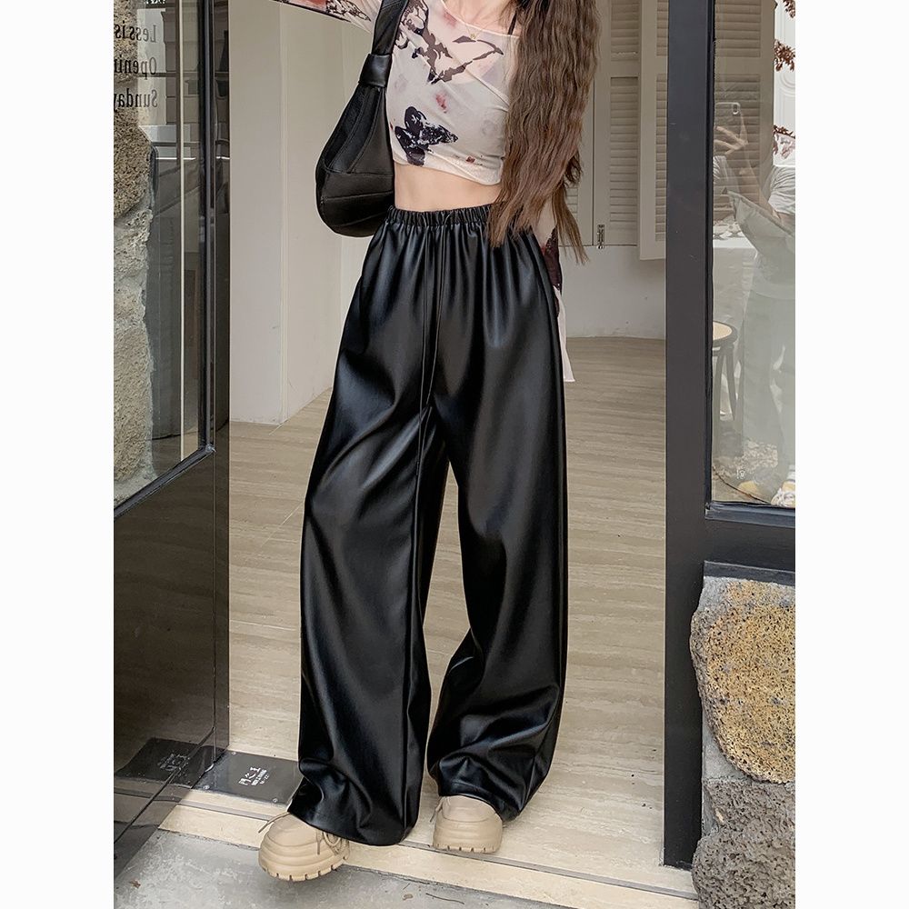 黑色皮裤女春秋哑光高腰直筒裤显瘦阔腿拖地裤美式个性休闲直筒PU