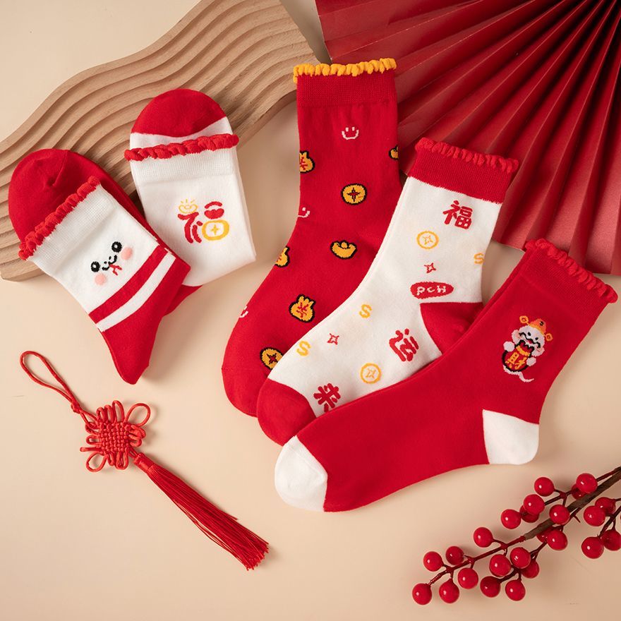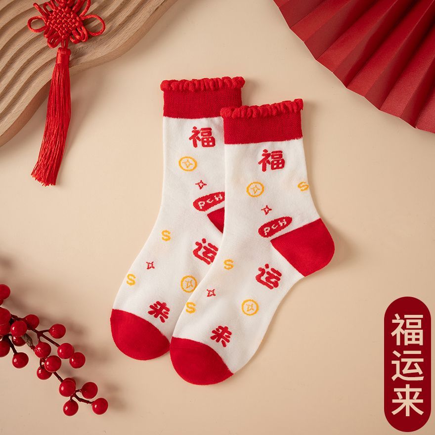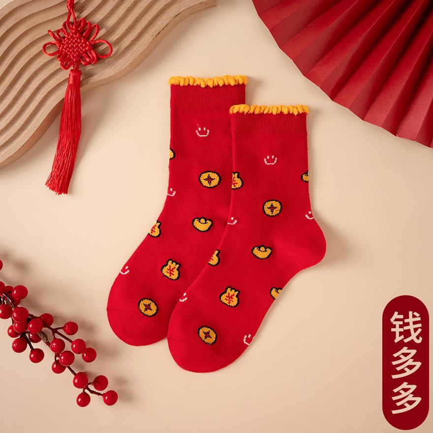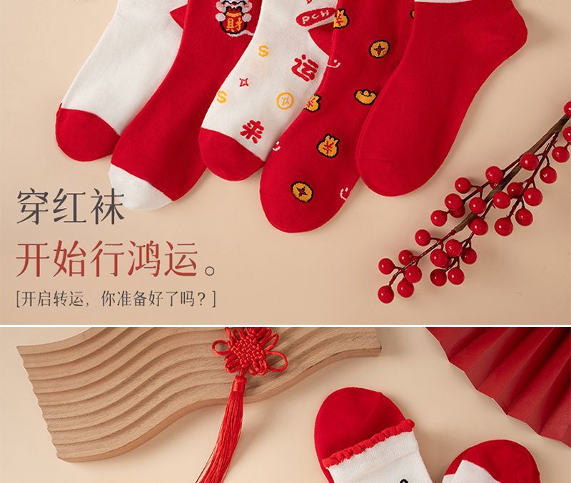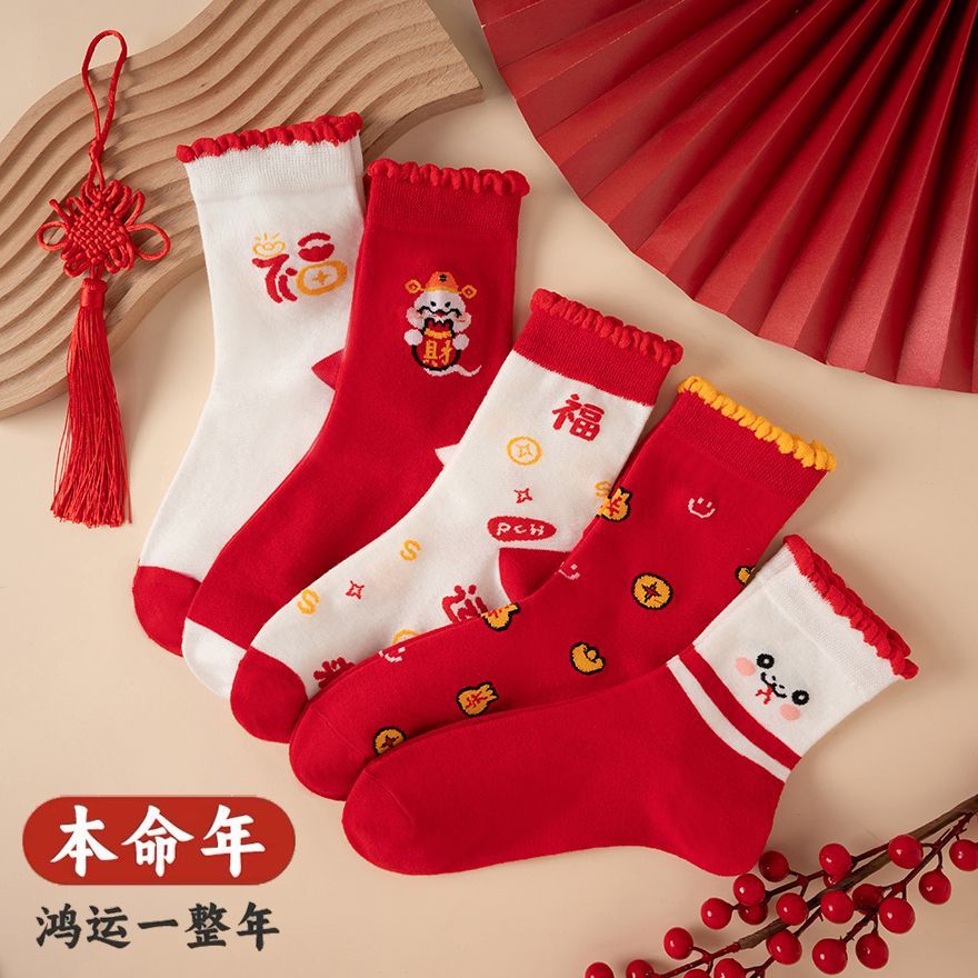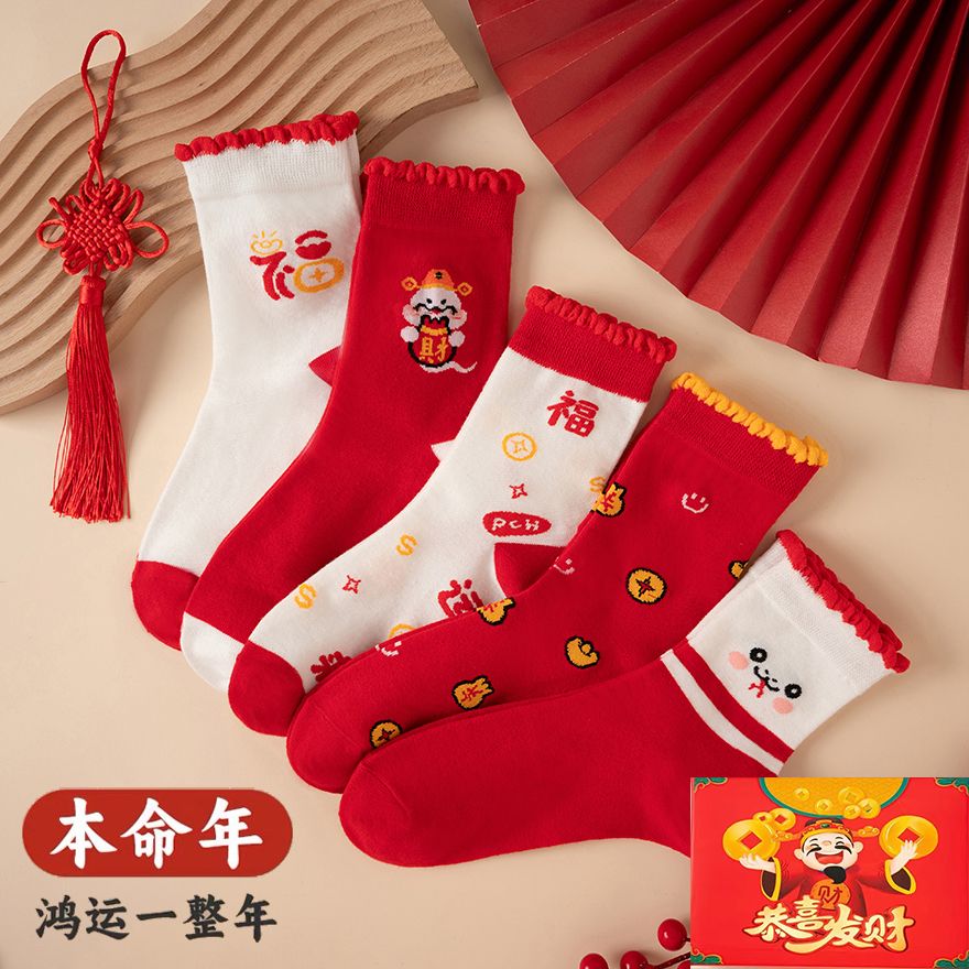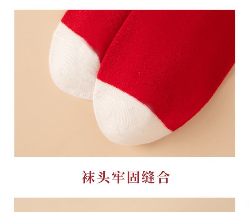 本命年网红袜子女中筒袜秋冬季纯棉圣诞袜子新年大红色可爱透气