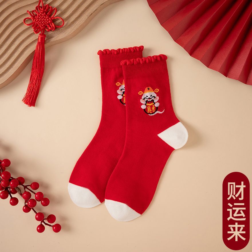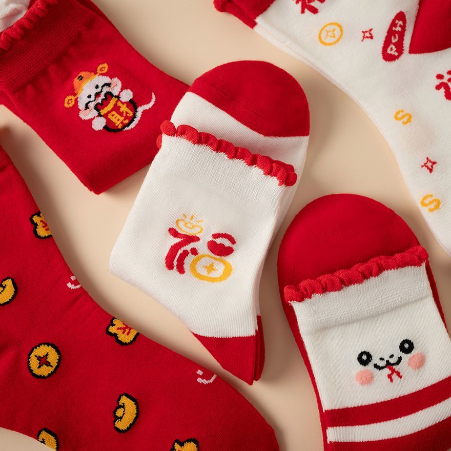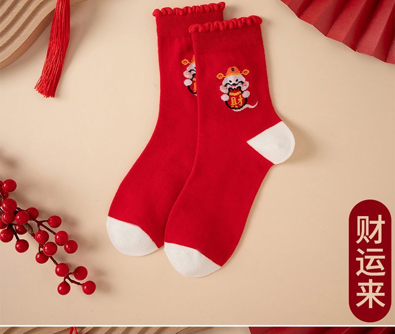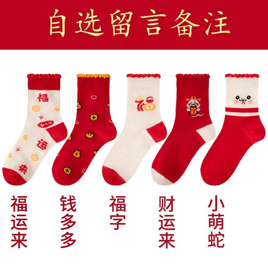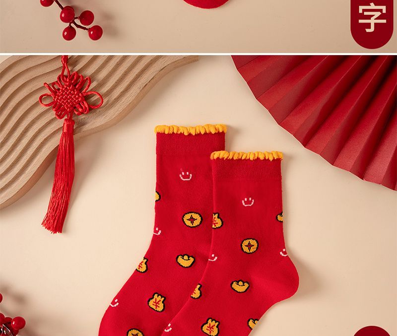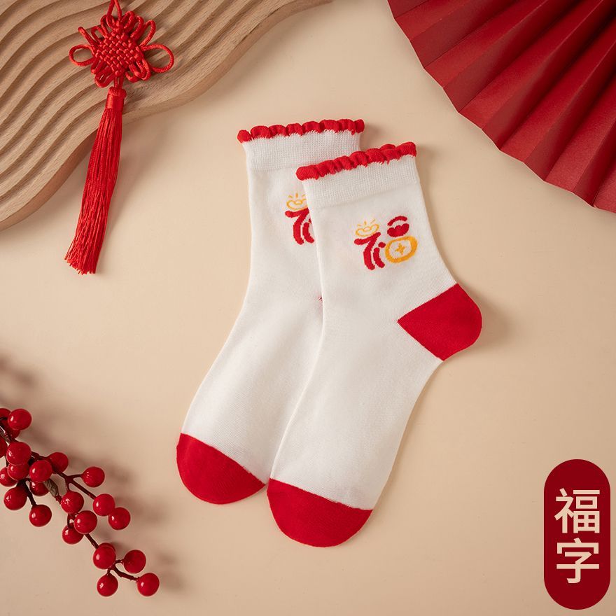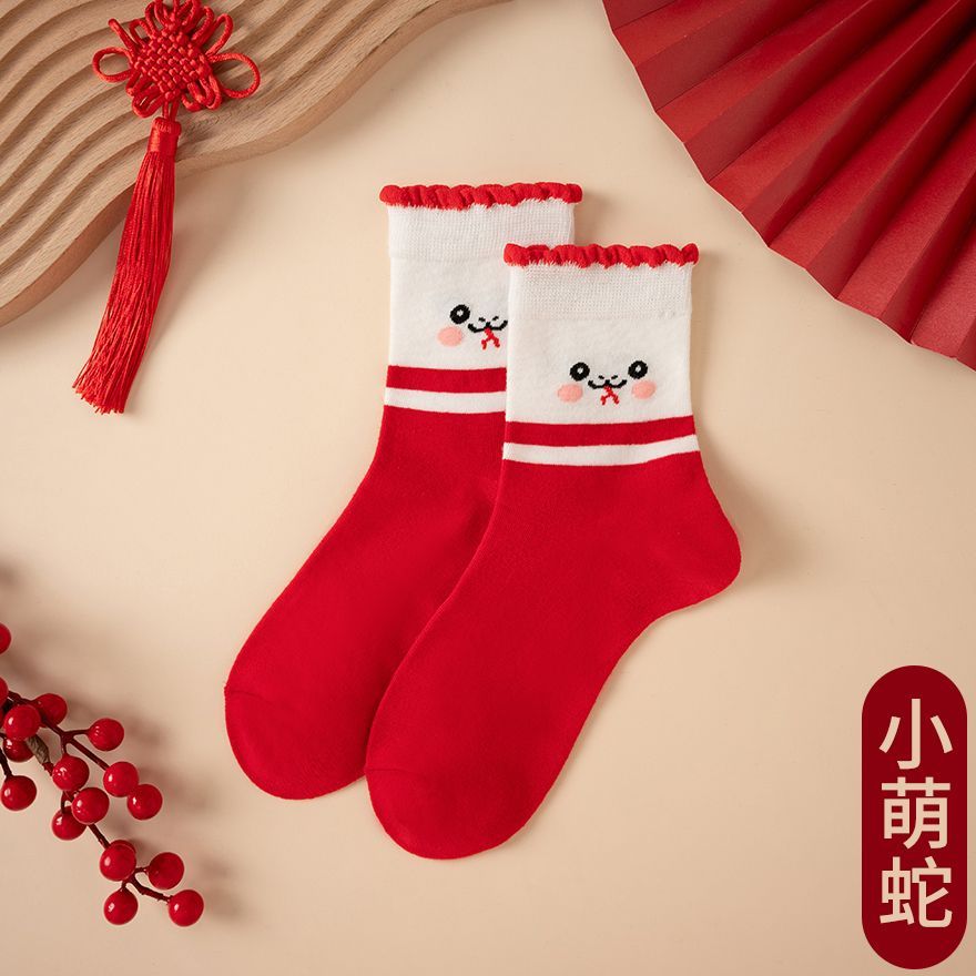 本命年网红袜子女中筒袜秋冬季纯棉圣诞袜子新年大红色可爱透气