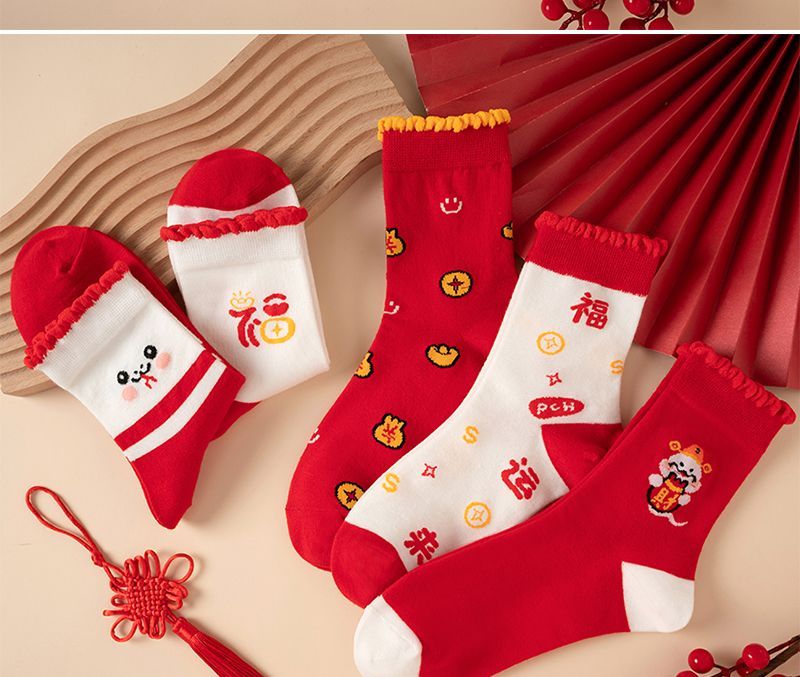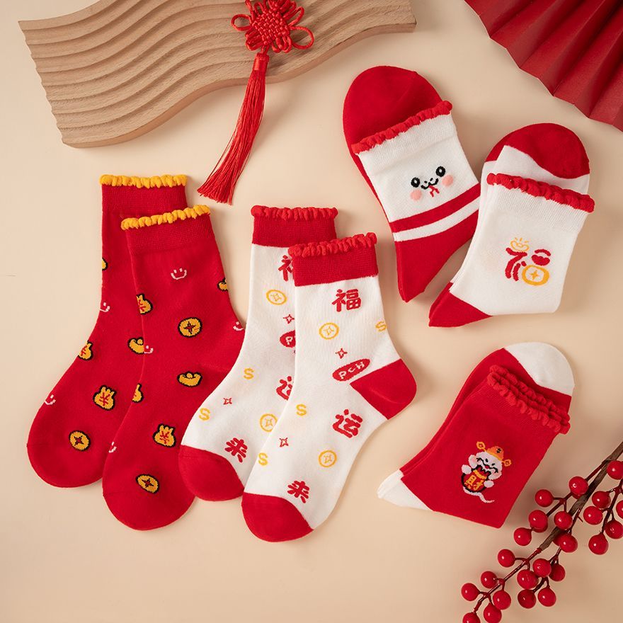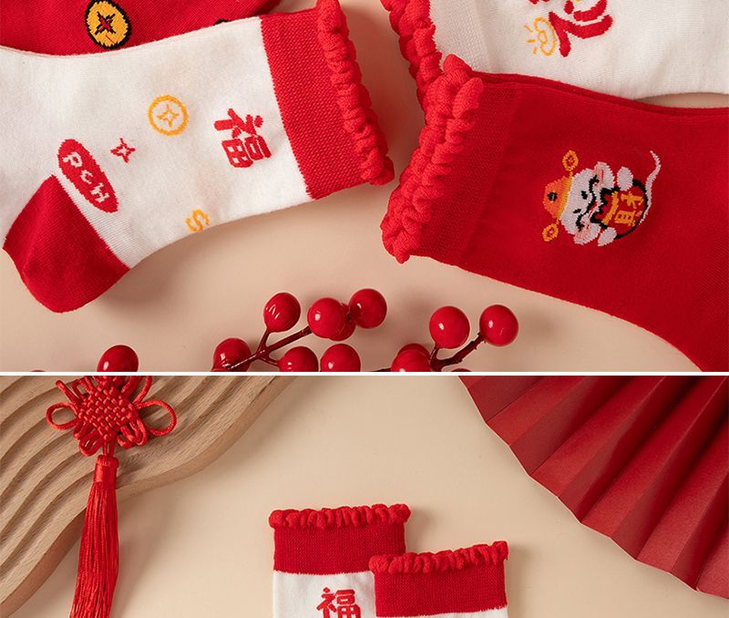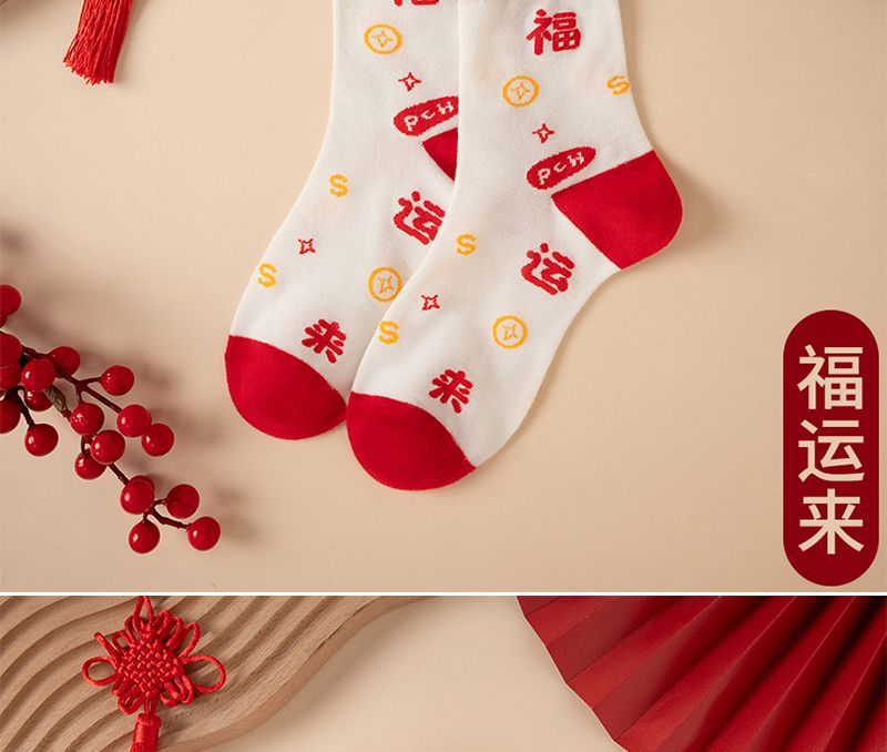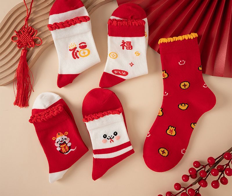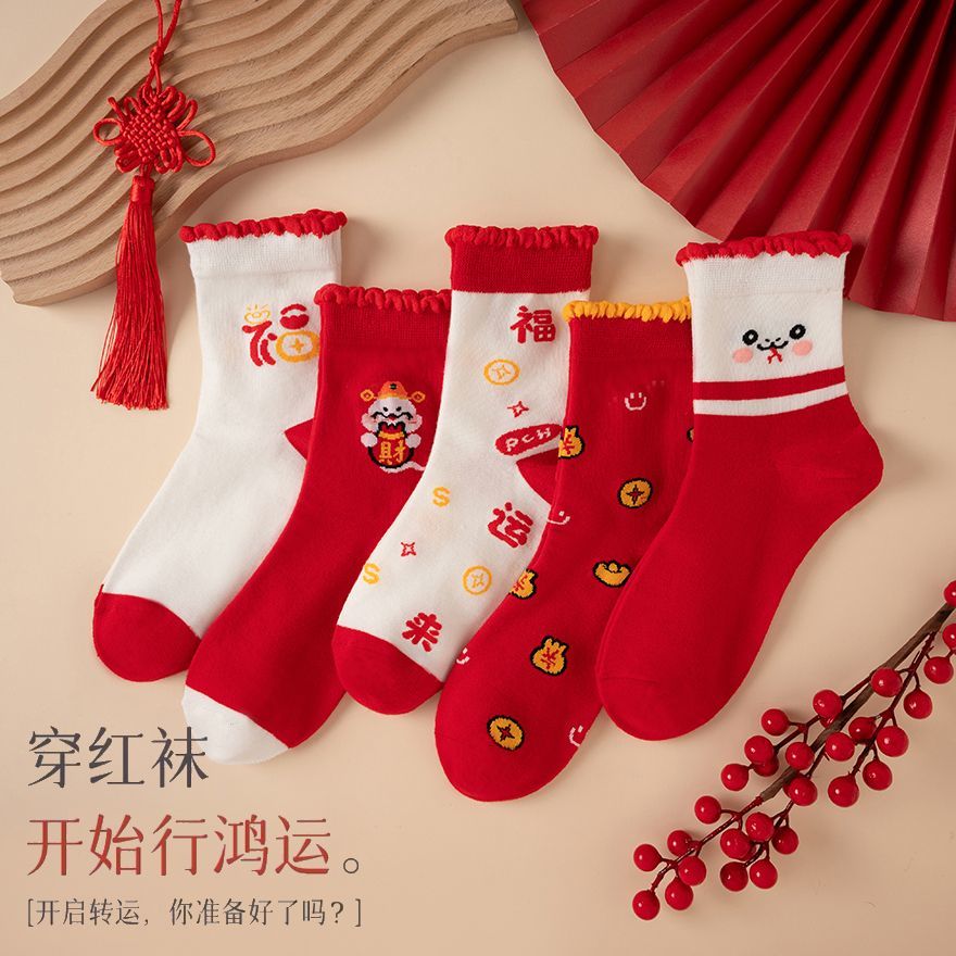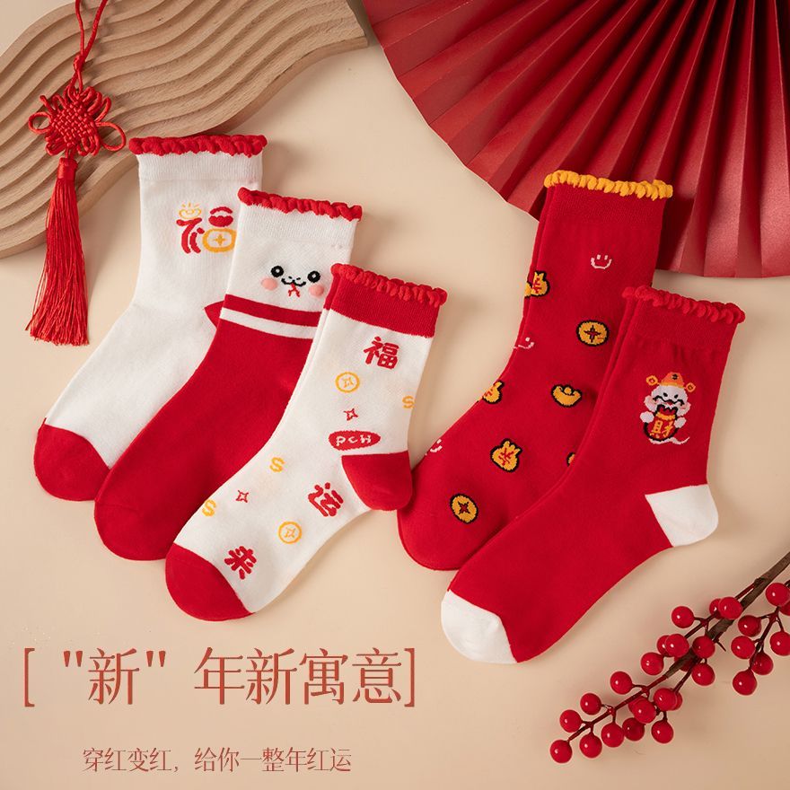 本命年网红袜子女中筒袜秋冬季纯棉圣诞袜子新年大红色可爱透气