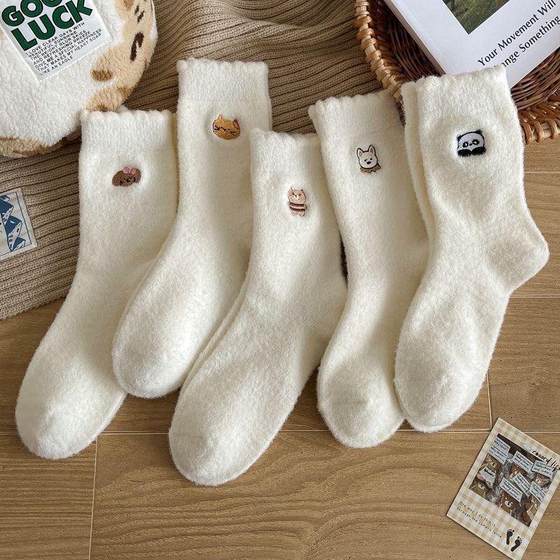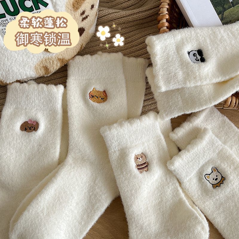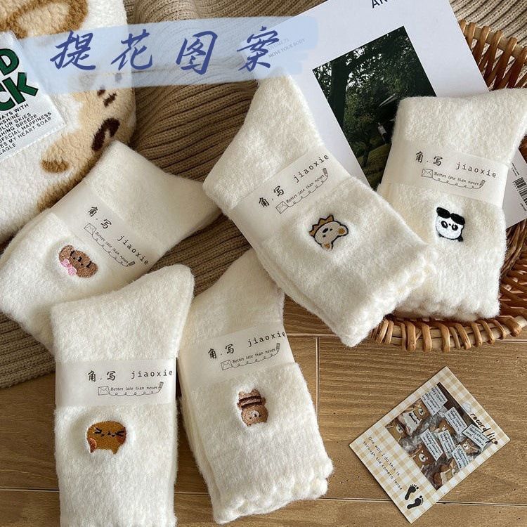 冬季加厚保暖袜子女中筒袜毛绒绒家居地板袜成年人白色长筒袜宽松