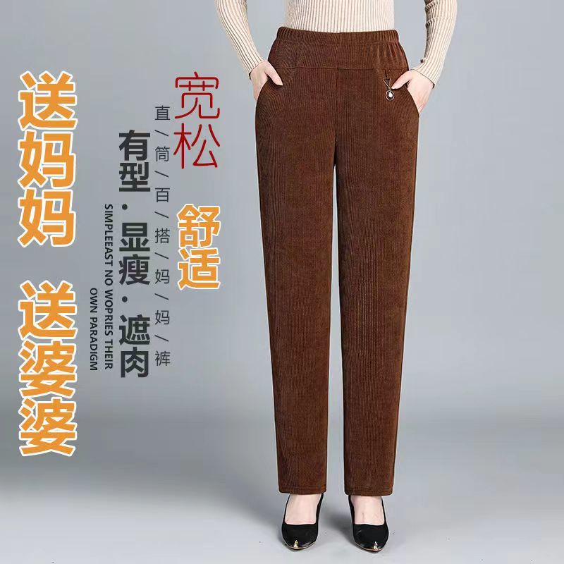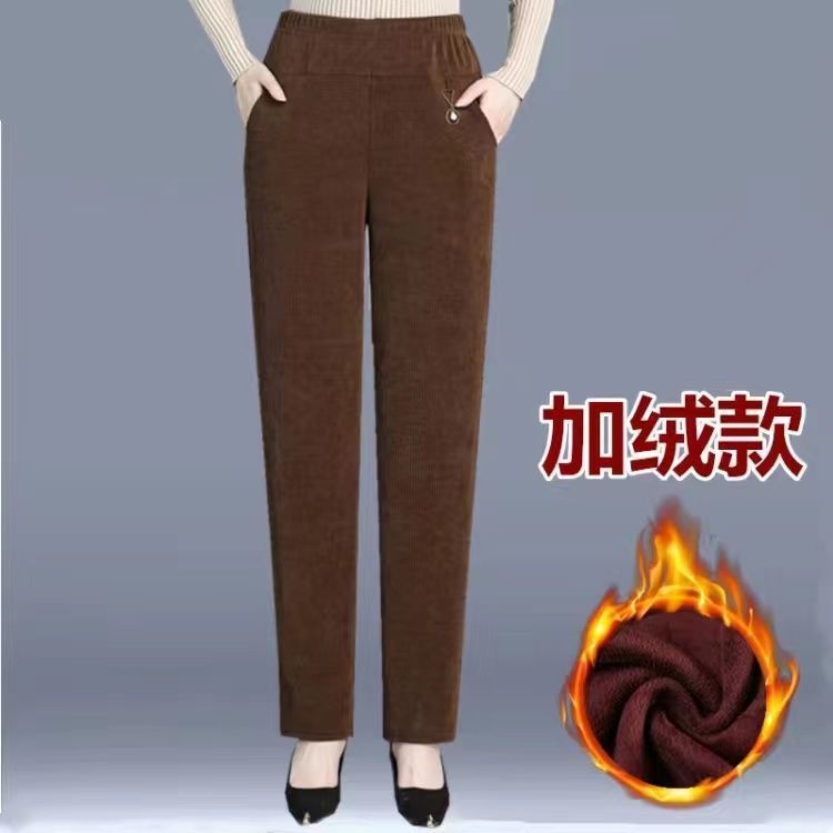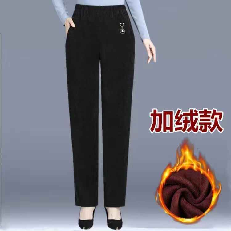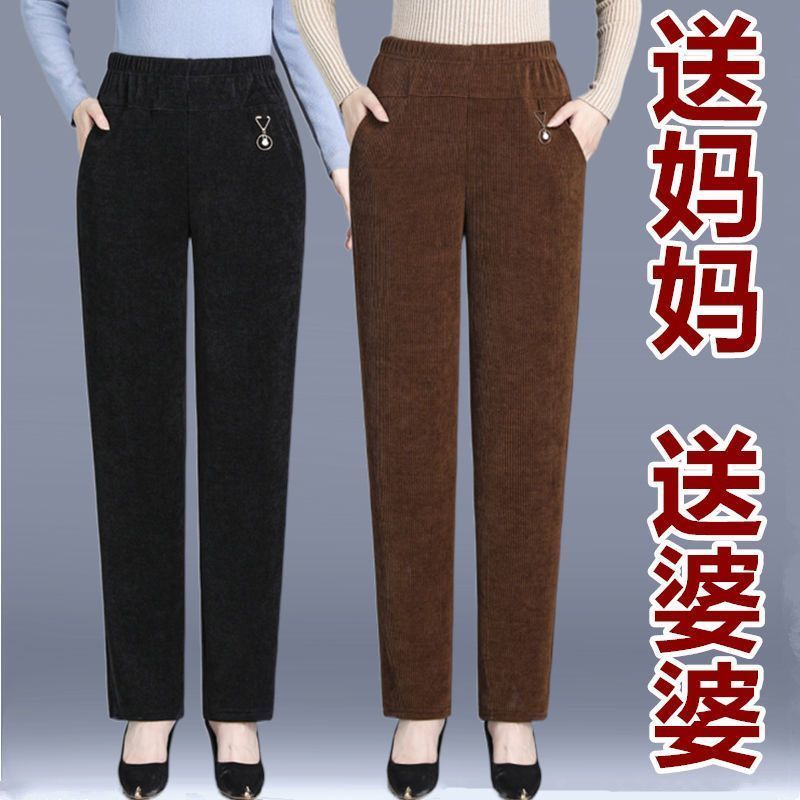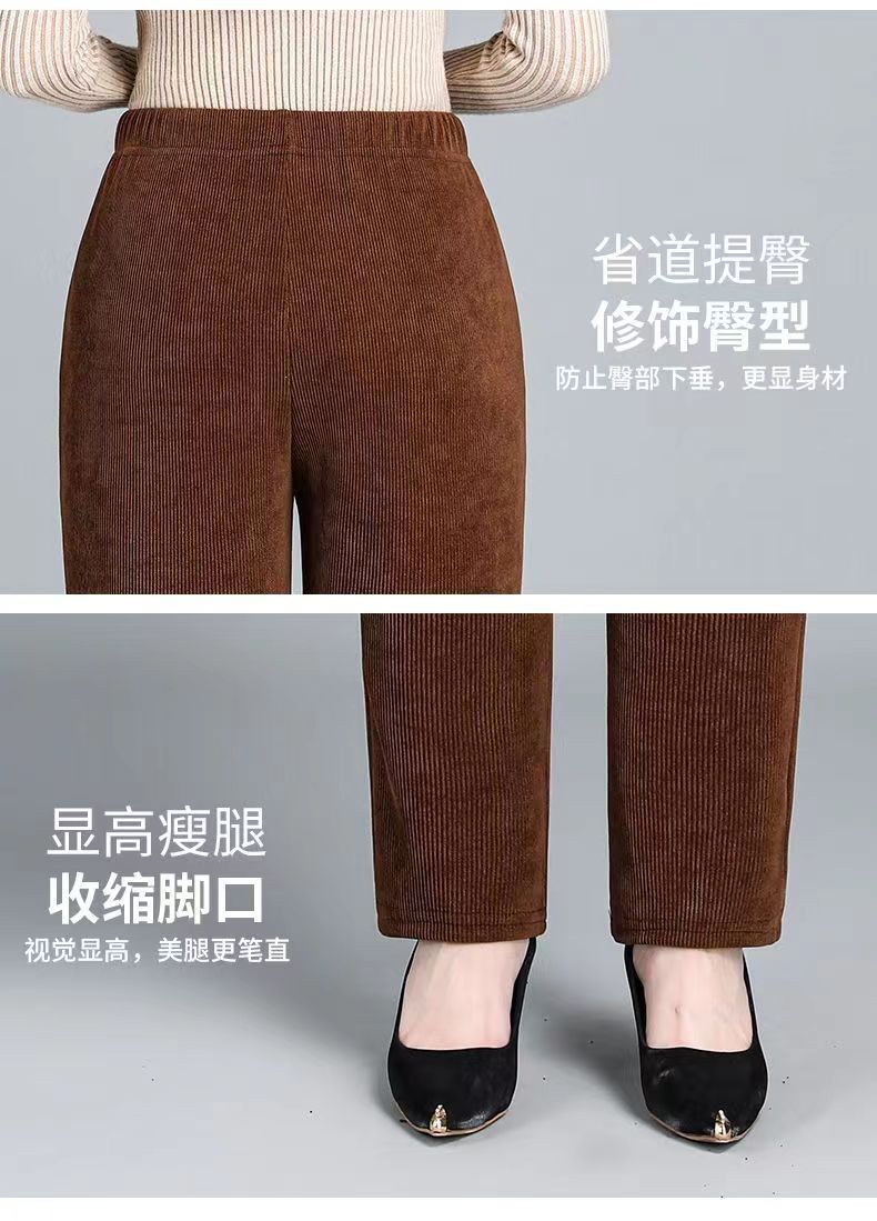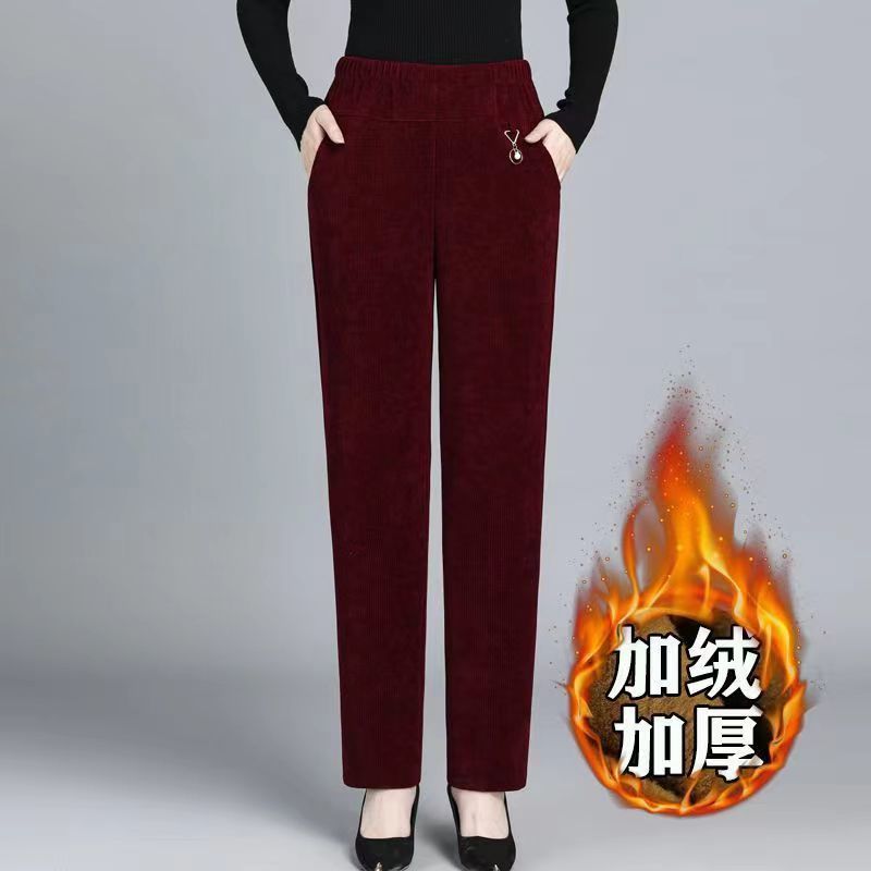秋冬加绒加厚细条绒灯芯绒中老年妈妈高腰宽松大码直筒休闲长裤女