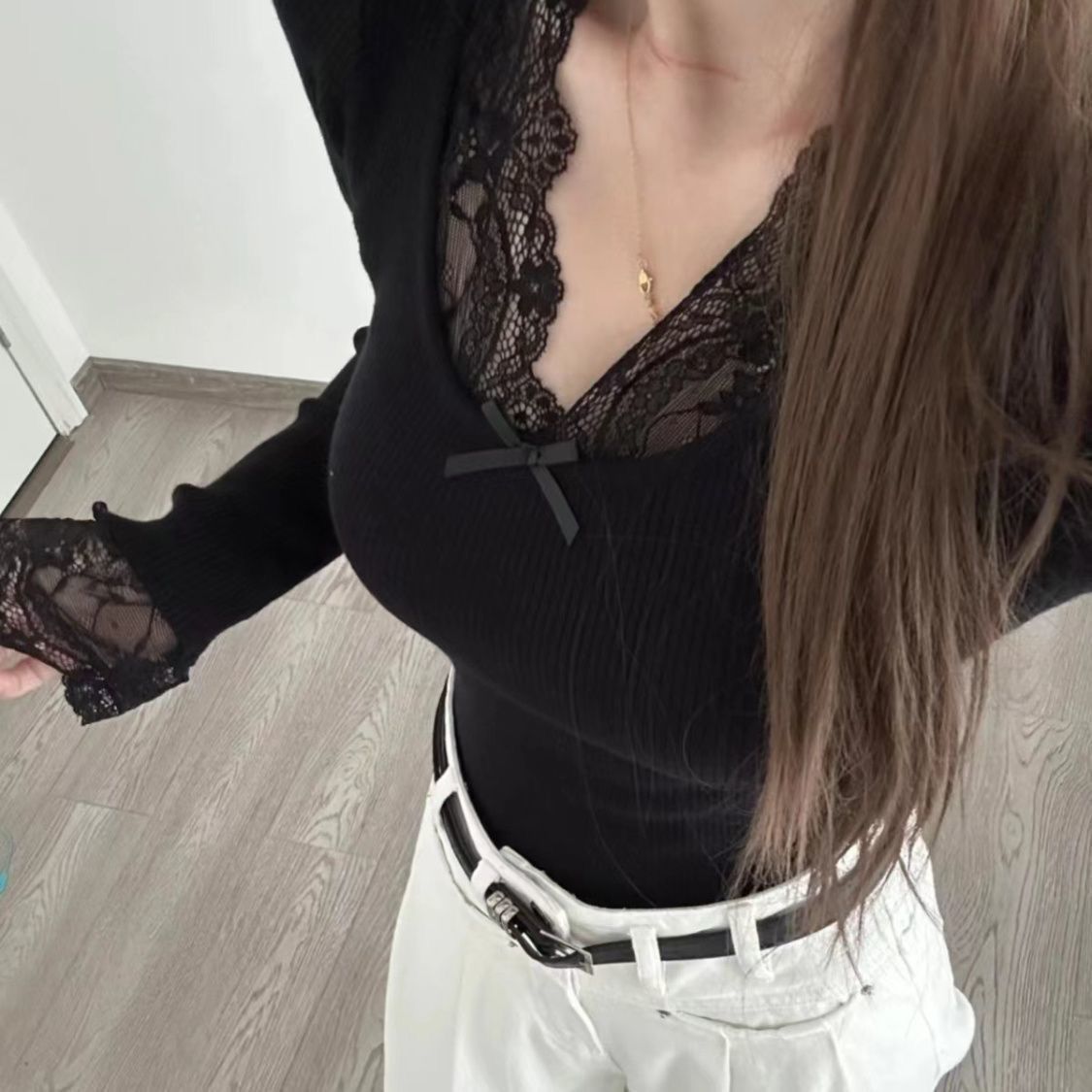 大码胖MM法式蕾丝v领保暖内衣冬显瘦温柔长袖T恤打底上衣内搭外穿