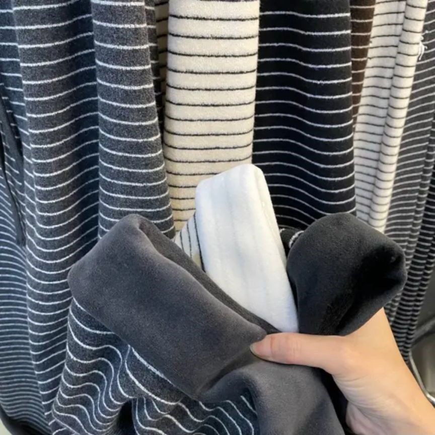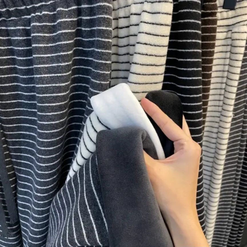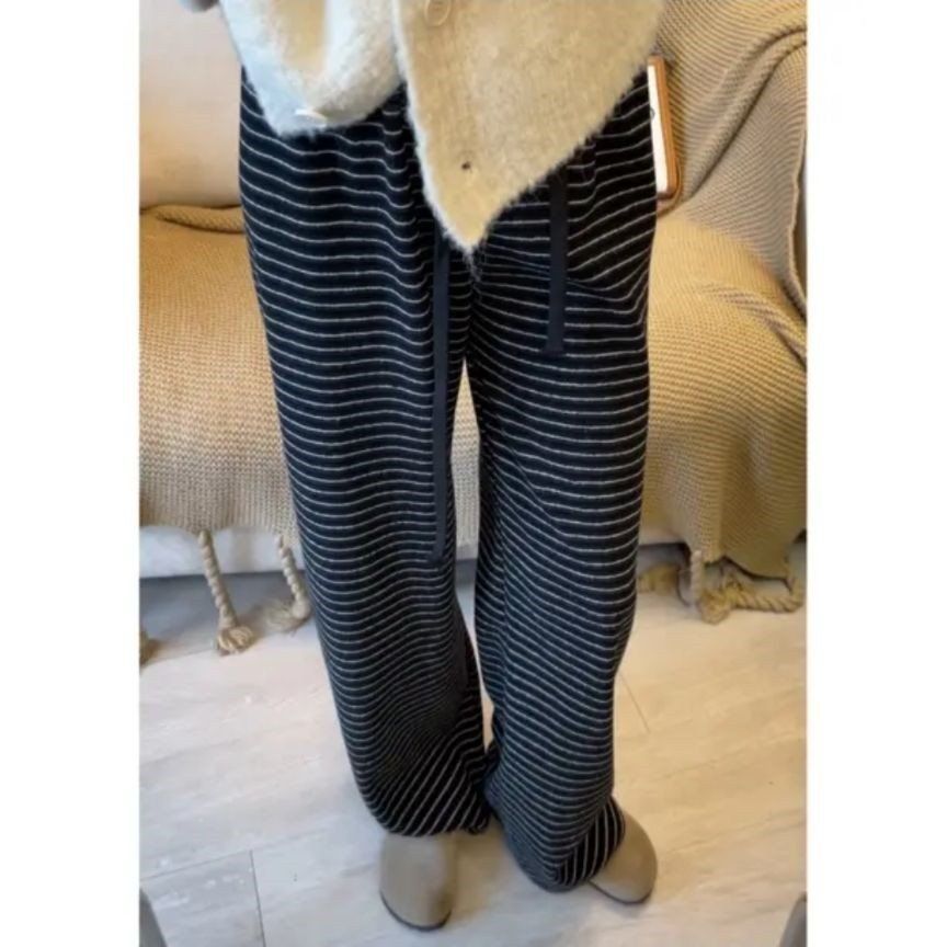 秋冬新款加绒保暖复古条纹休闲长裤女韩版大码胖mm高腰直筒阔腿裤