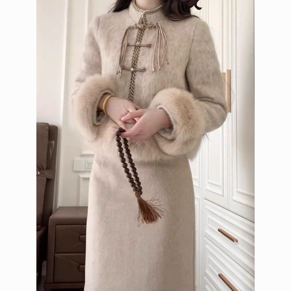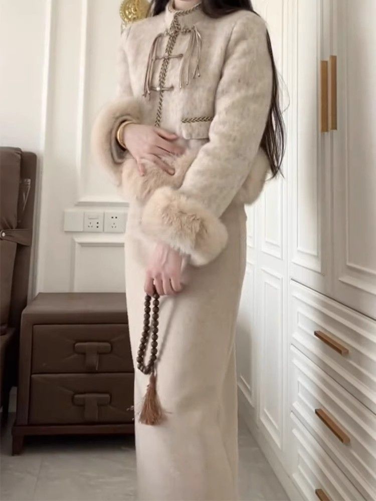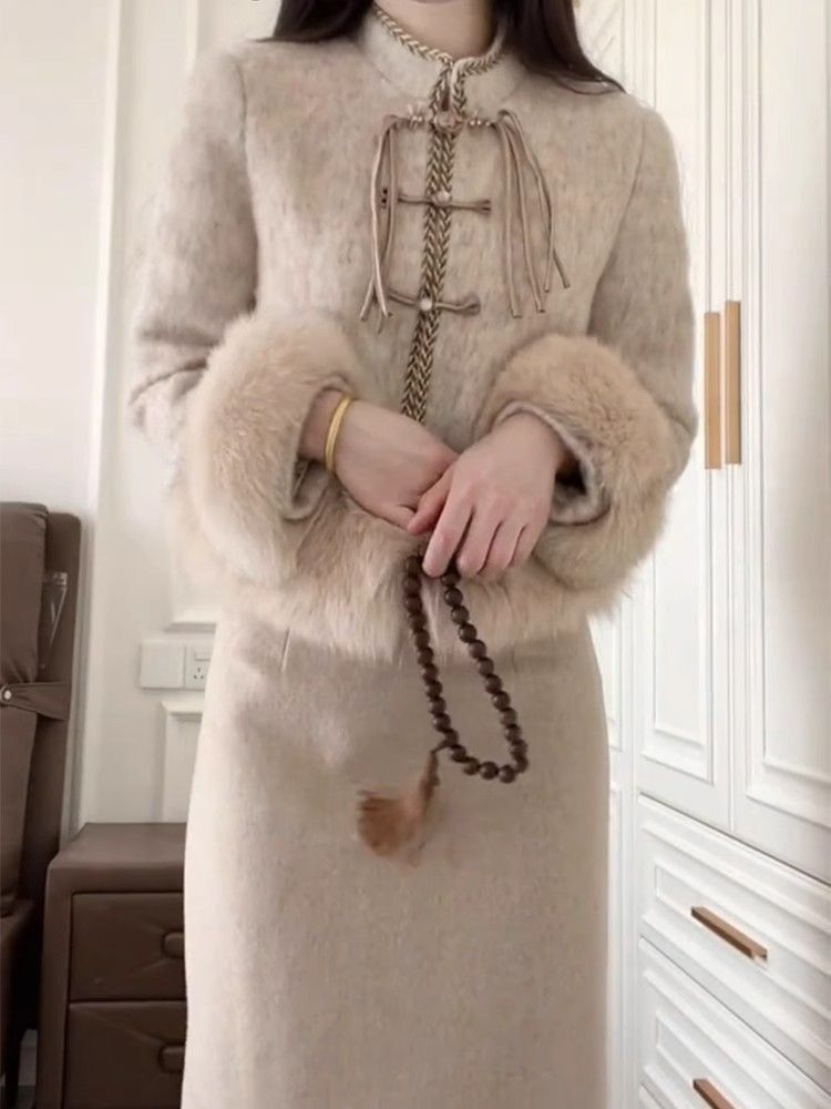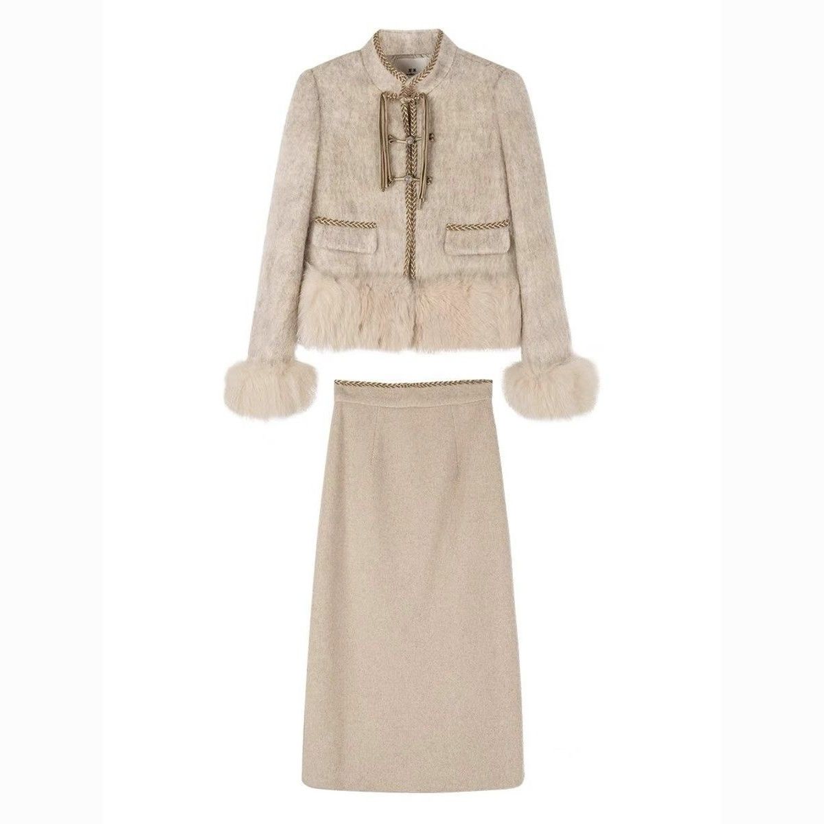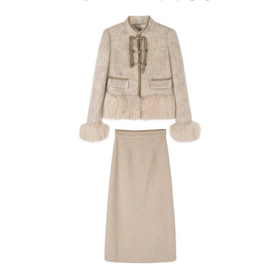 大码胖MM冬季新款小香风气质短款外套+高腰半身长裙显瘦两件套女