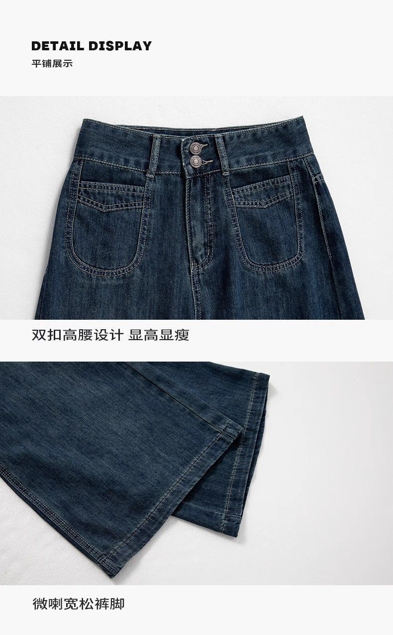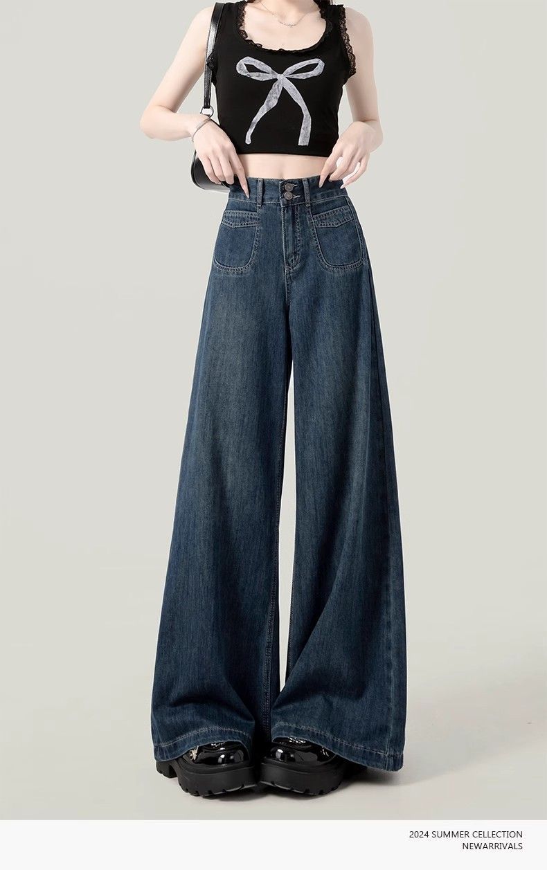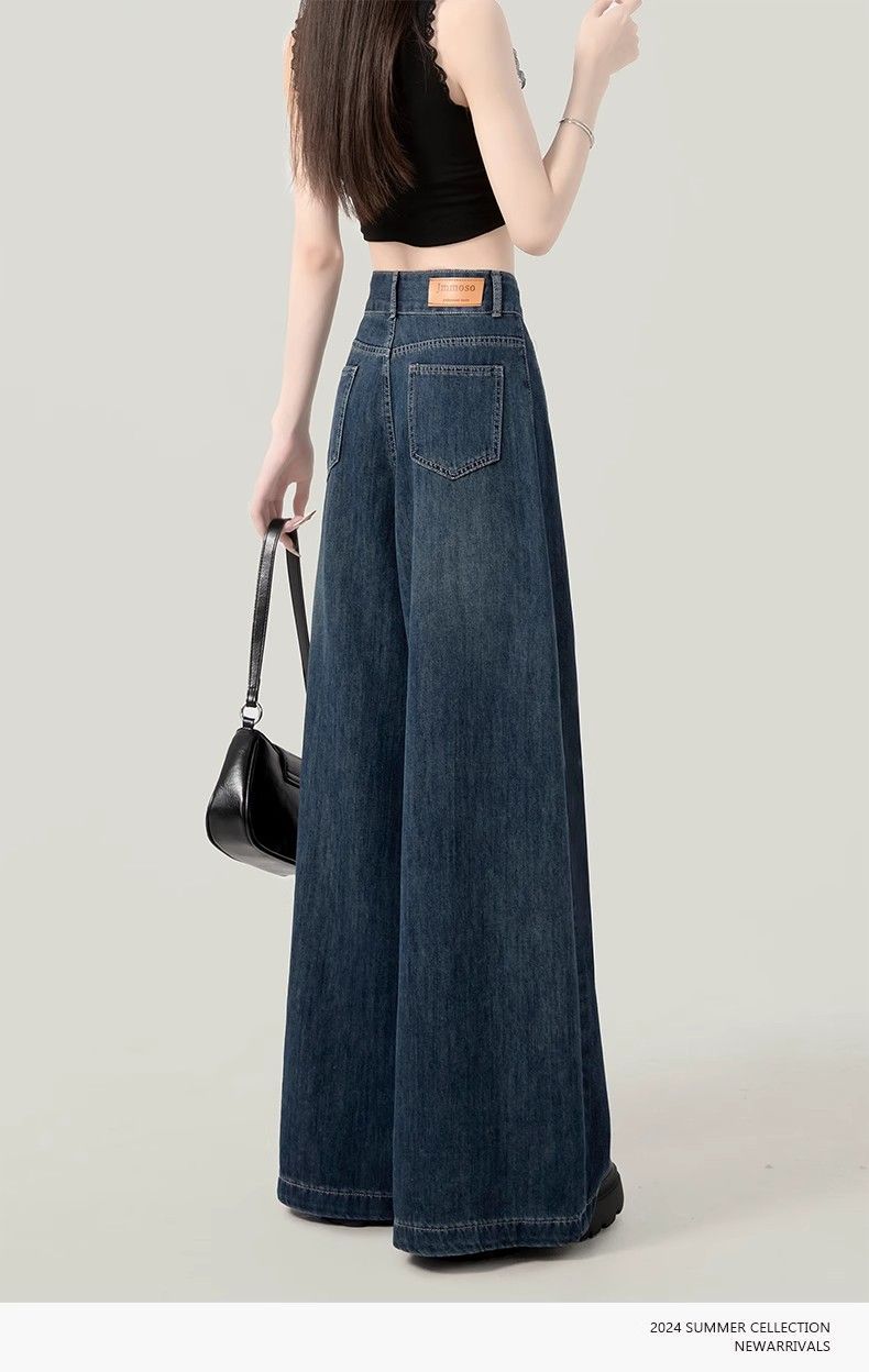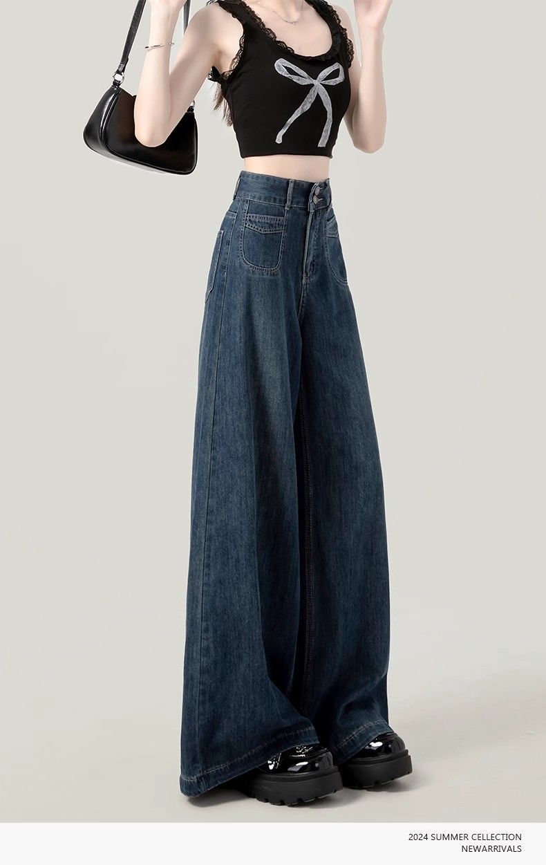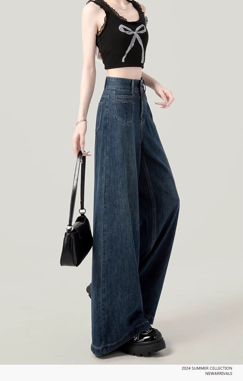 2025春季新款大码深蓝色高腰阔腿牛仔裤女百搭复古宽松显瘦直筒裤