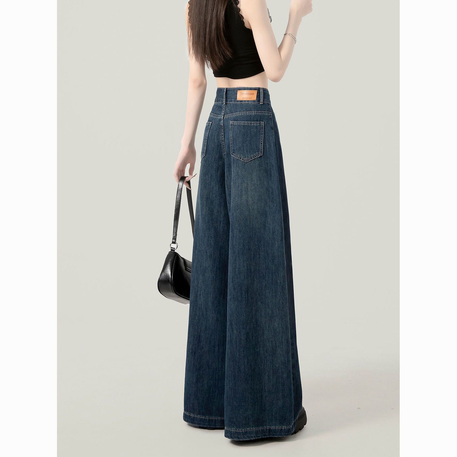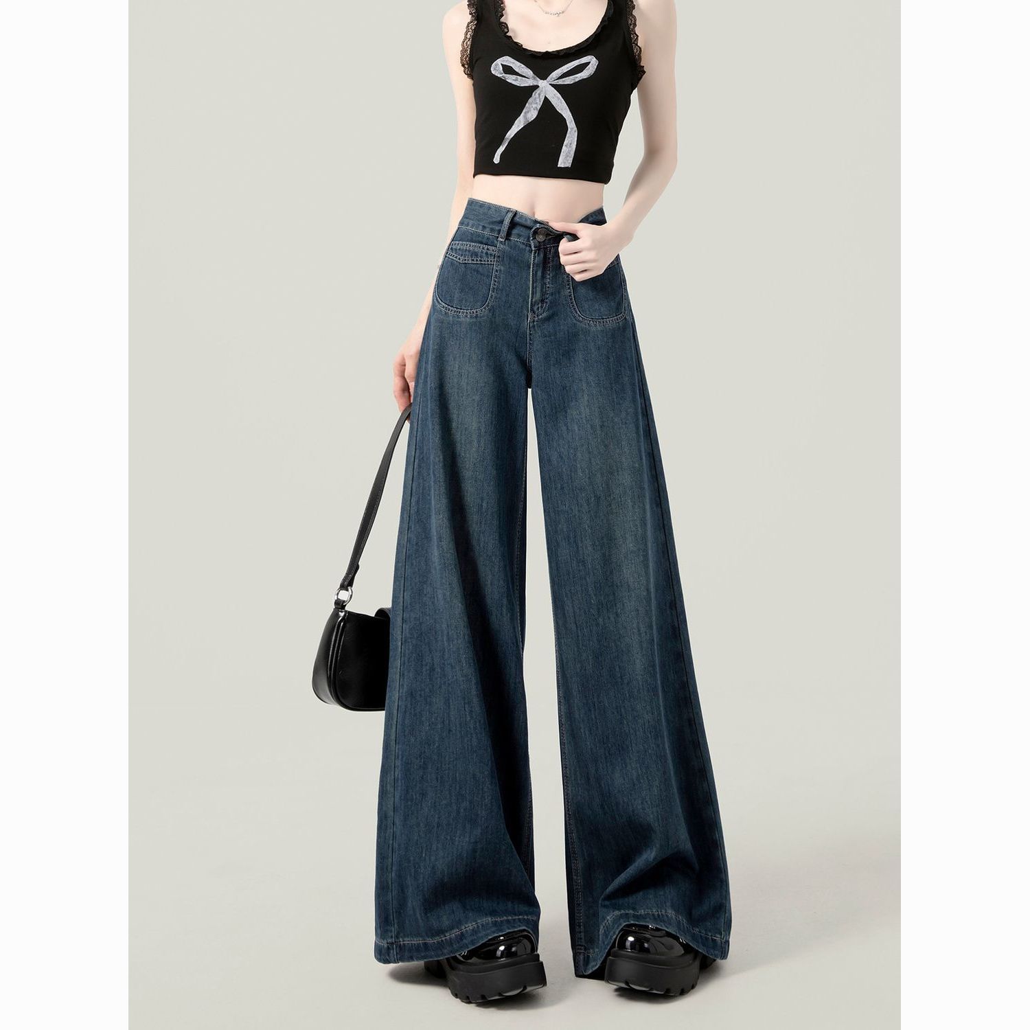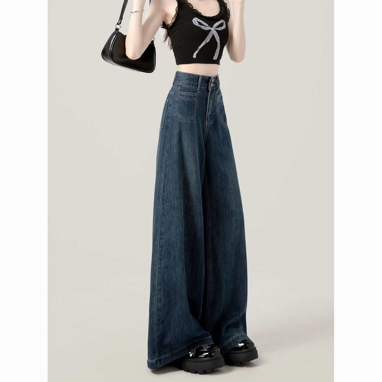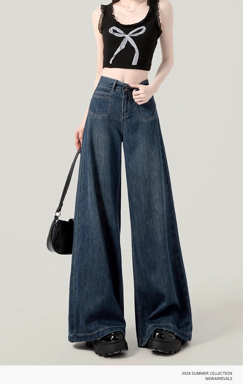 2025春季新款大码深蓝色高腰阔腿牛仔裤女百搭复古宽松显瘦直筒裤
