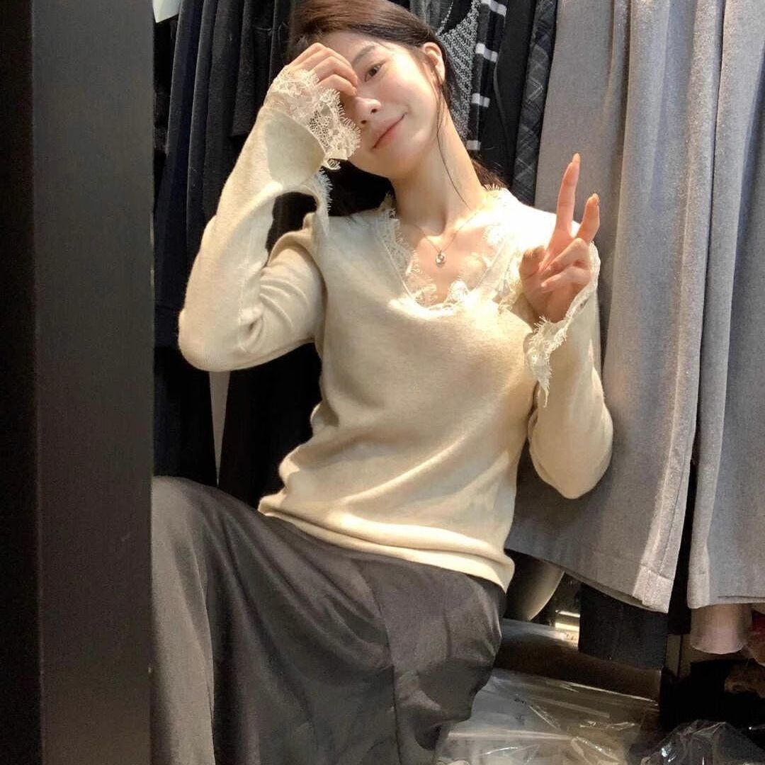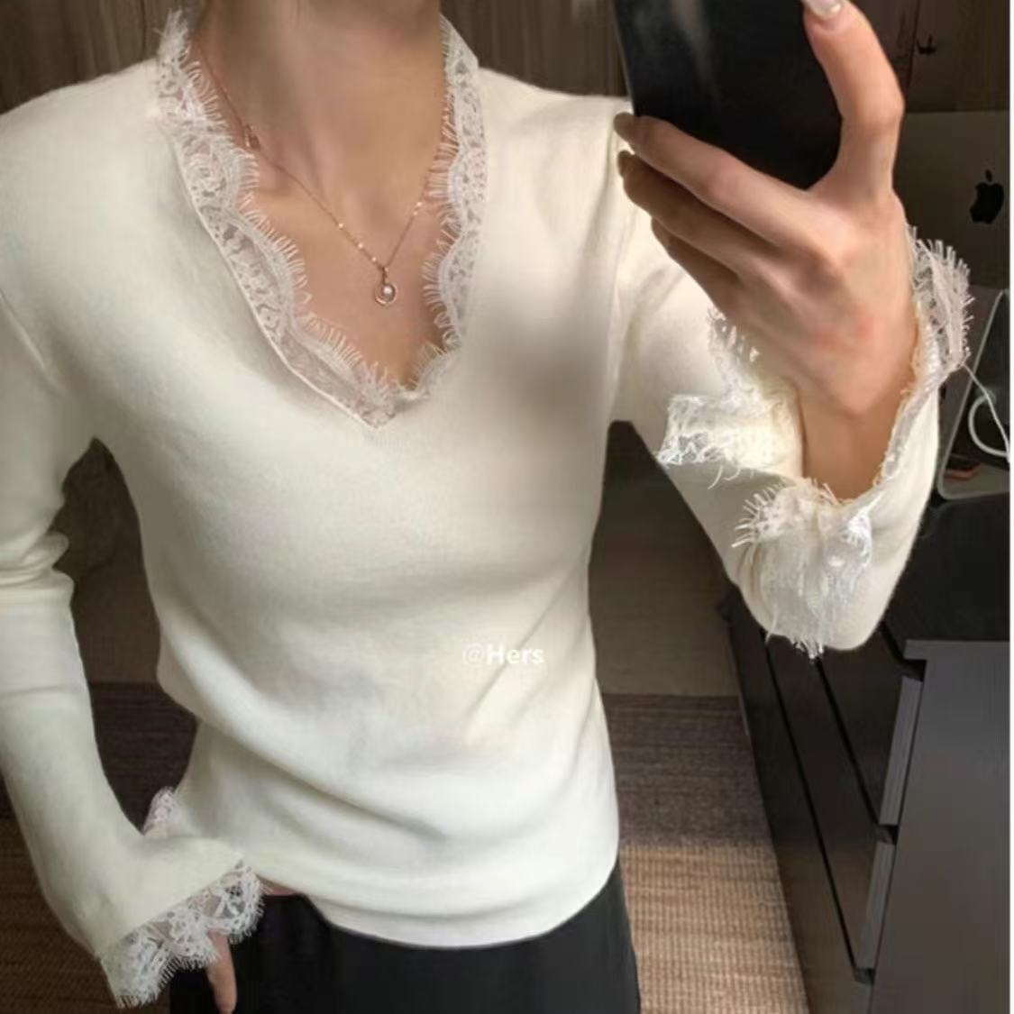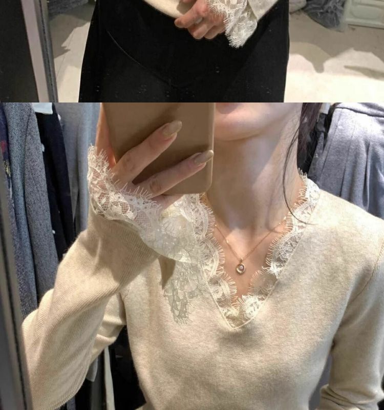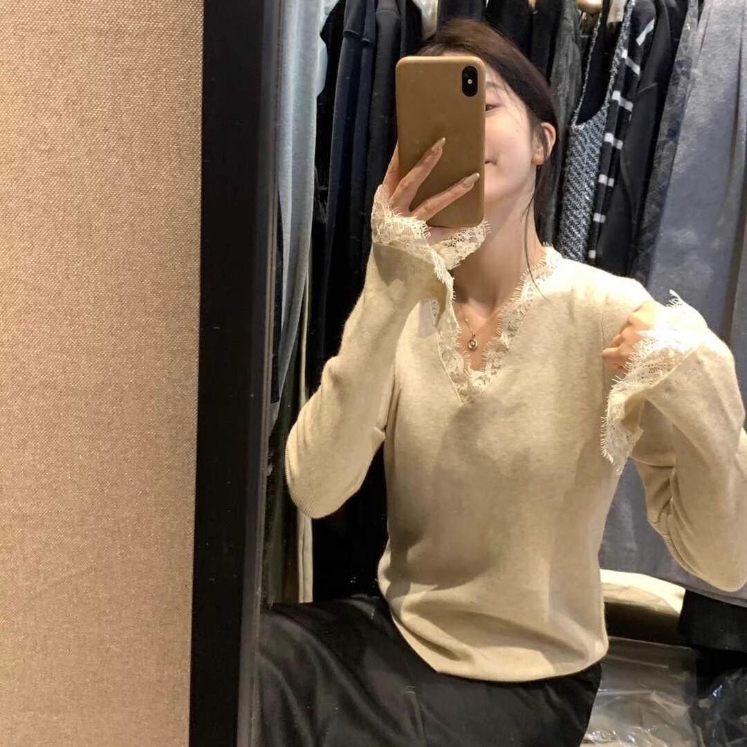 特大码300斤V领长袖蕾丝打底衫女秋冬新款内搭打底修身喇叭袖上衣