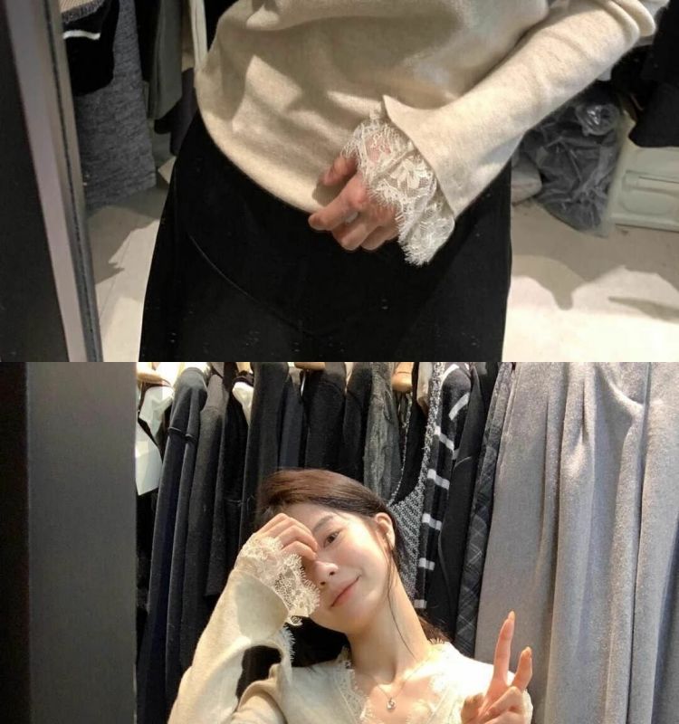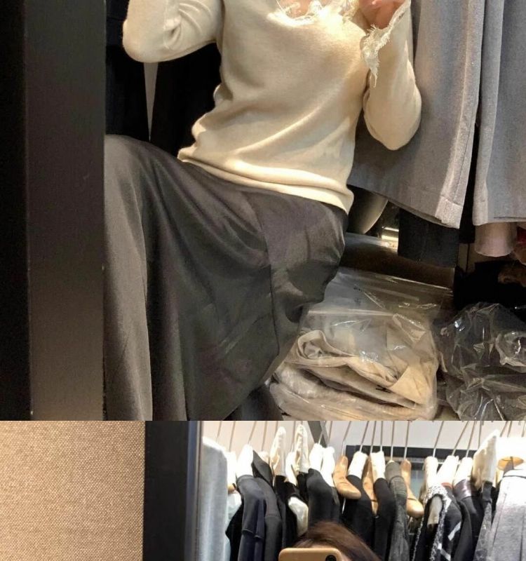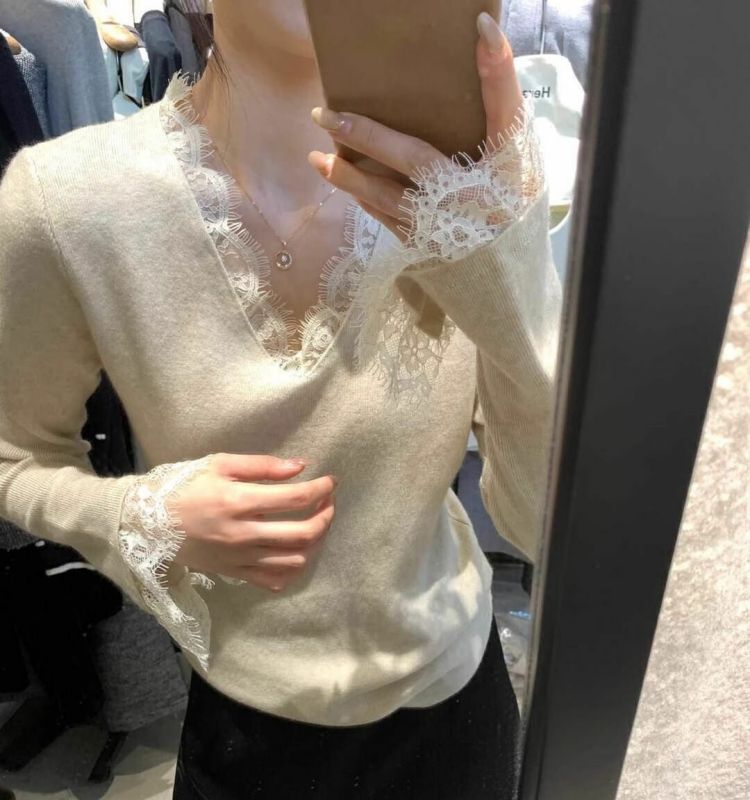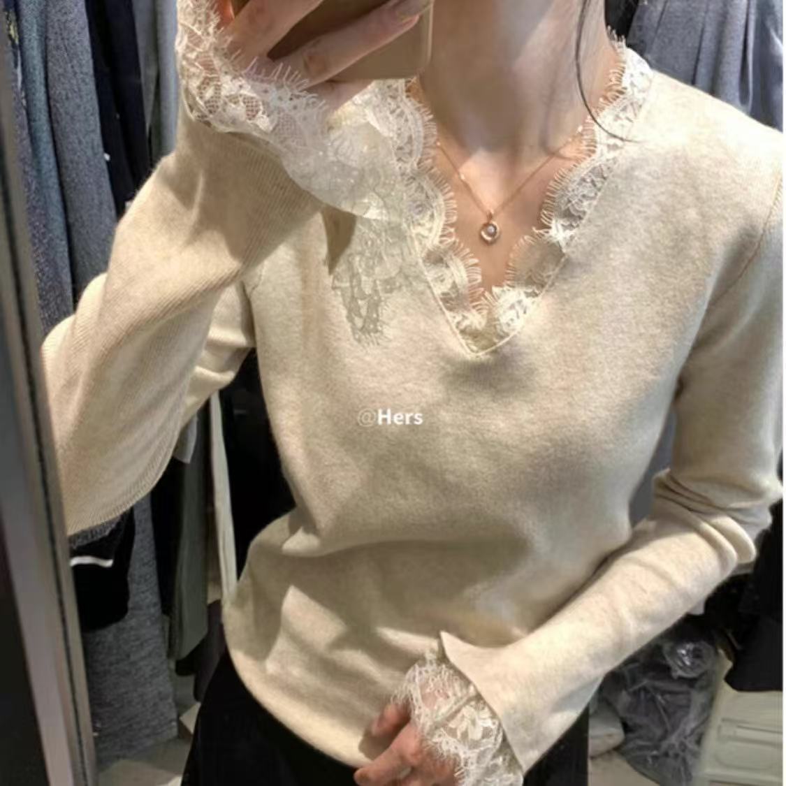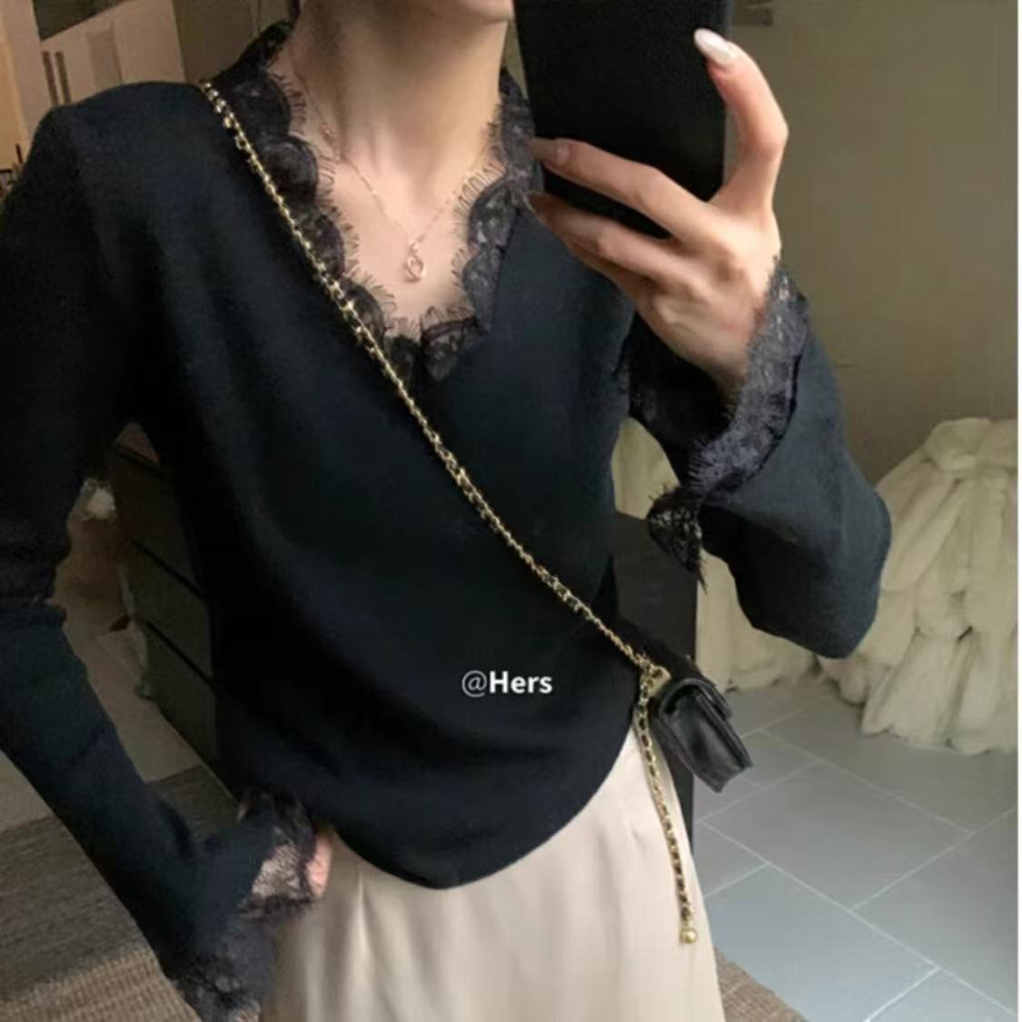 特大码300斤V领长袖蕾丝打底衫女秋冬新款内搭打底修身喇叭袖上衣