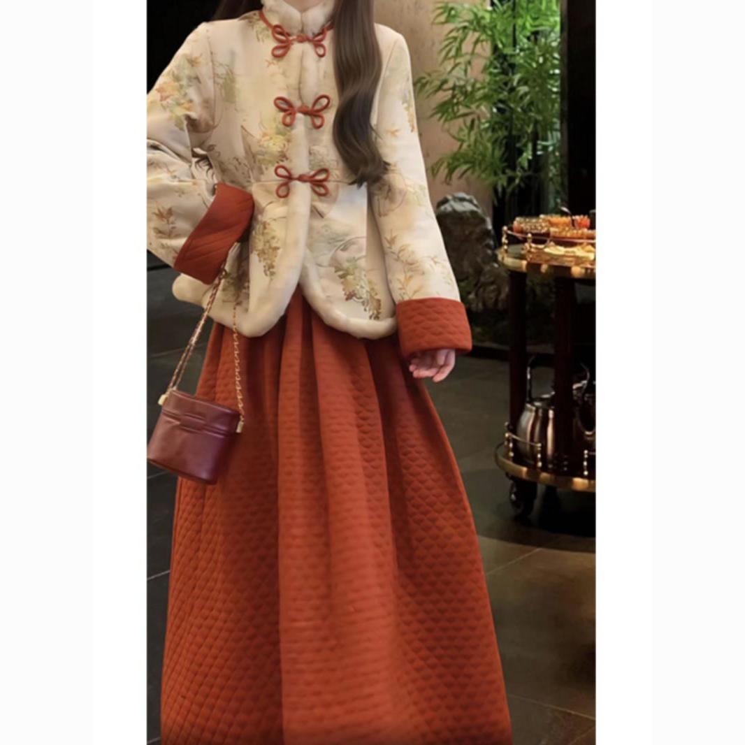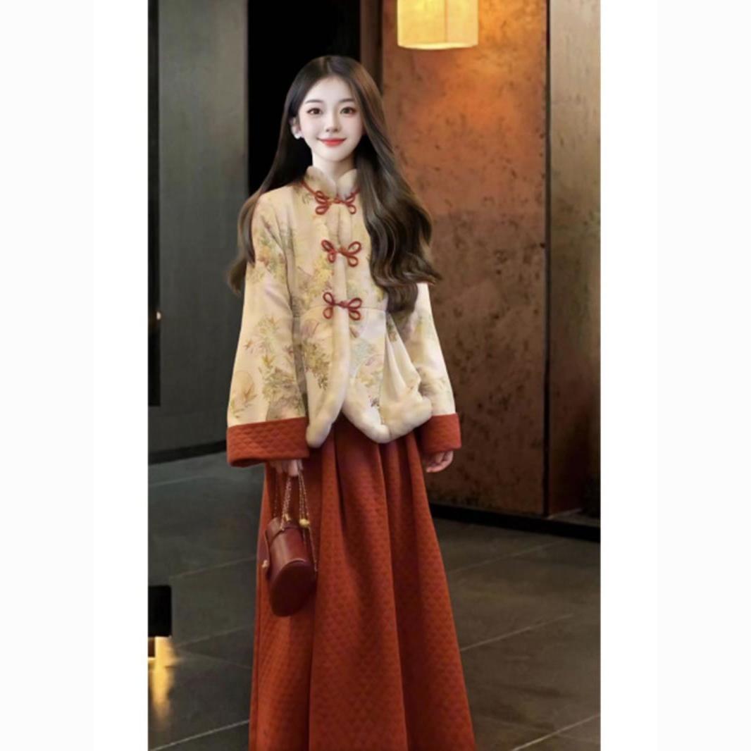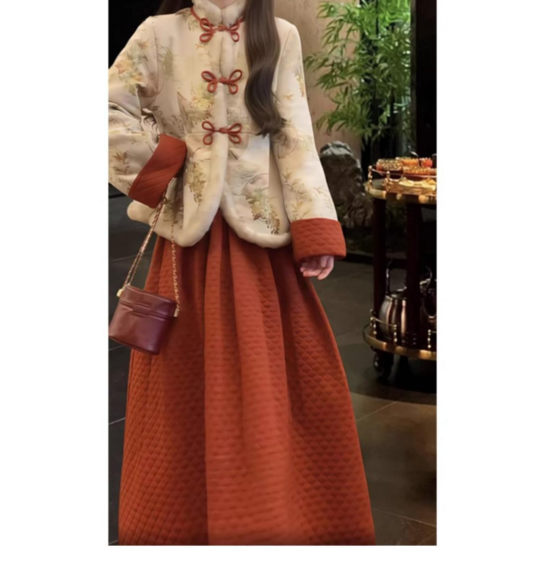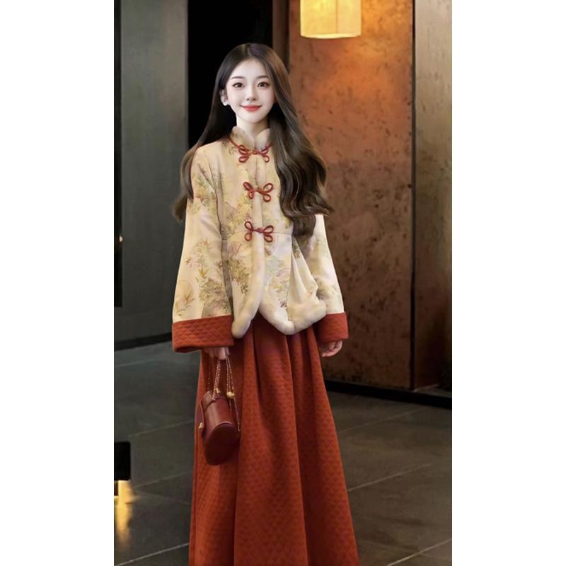 大码胖mm新中式国风套装女2025冬季新款盘扣外套半身裙两件套女装