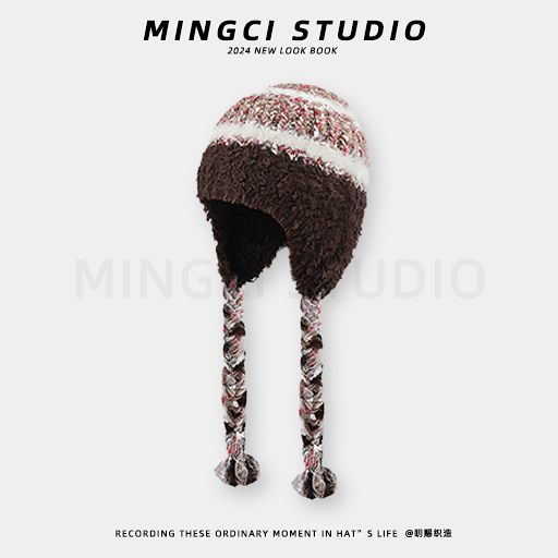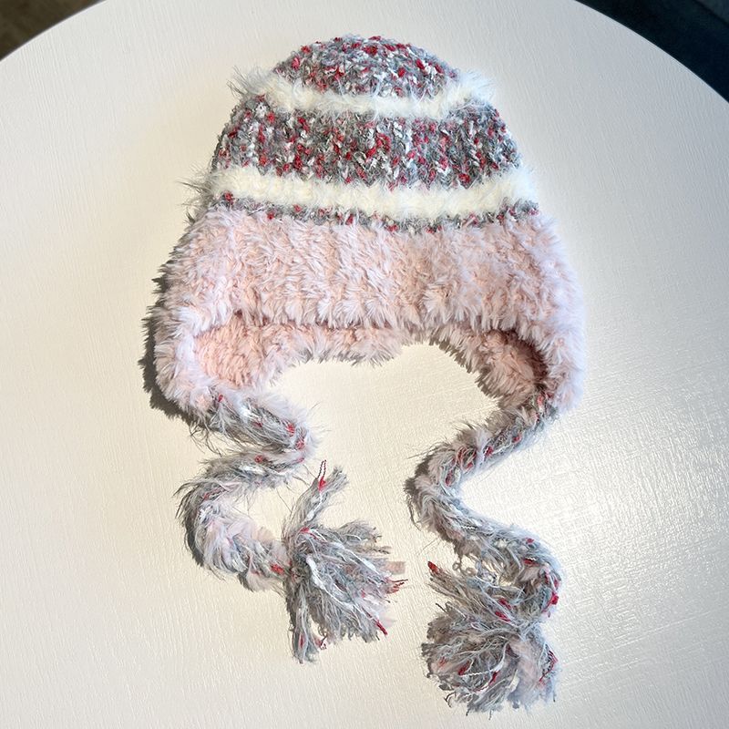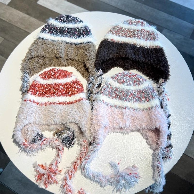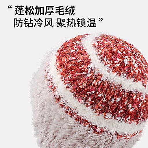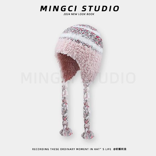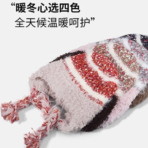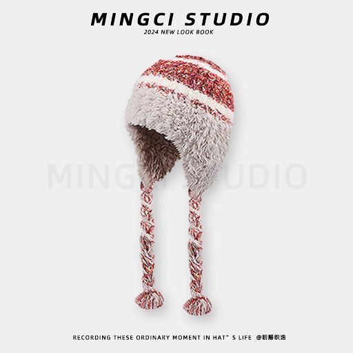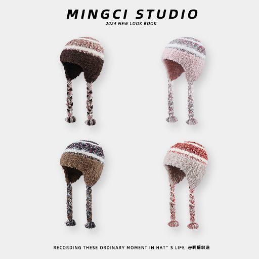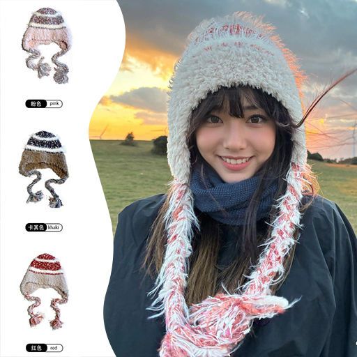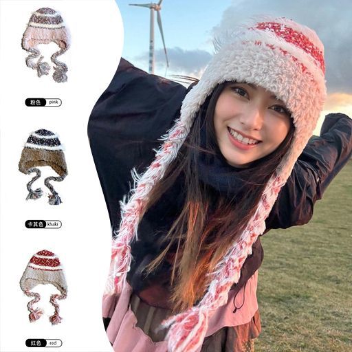 民族条纹拼接针织帽子毛线帽秋冬加厚保暖防寒毛绒护耳头帽雷锋
