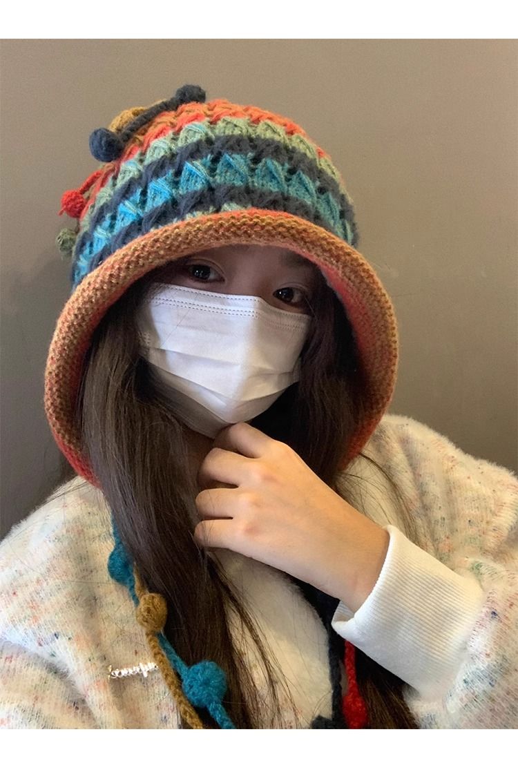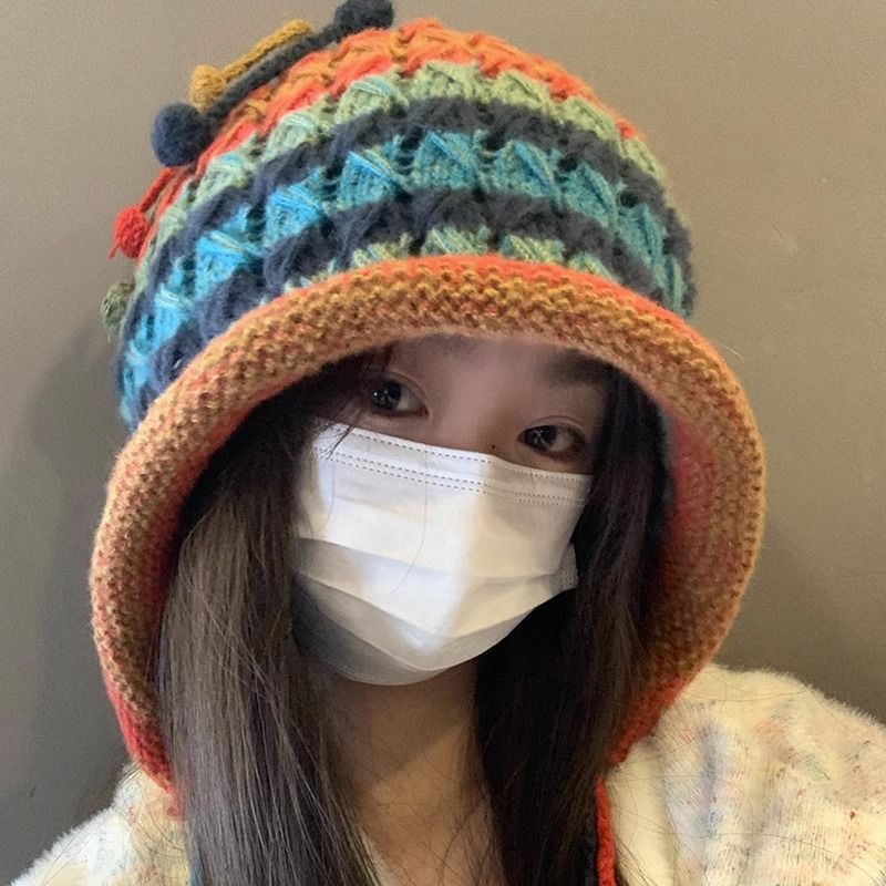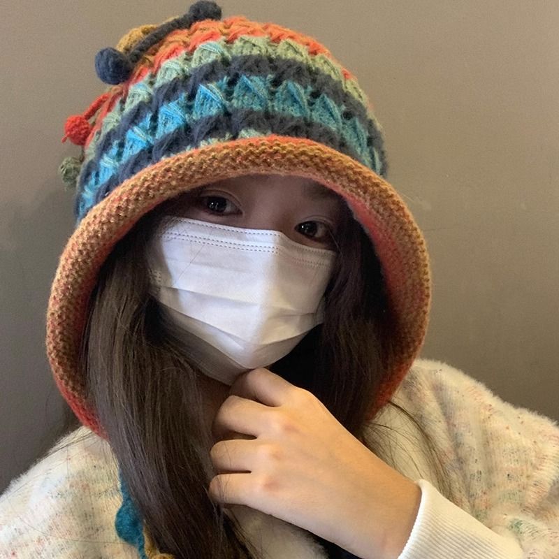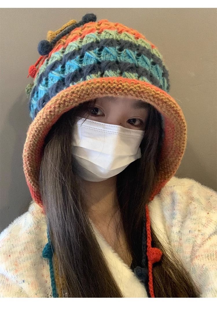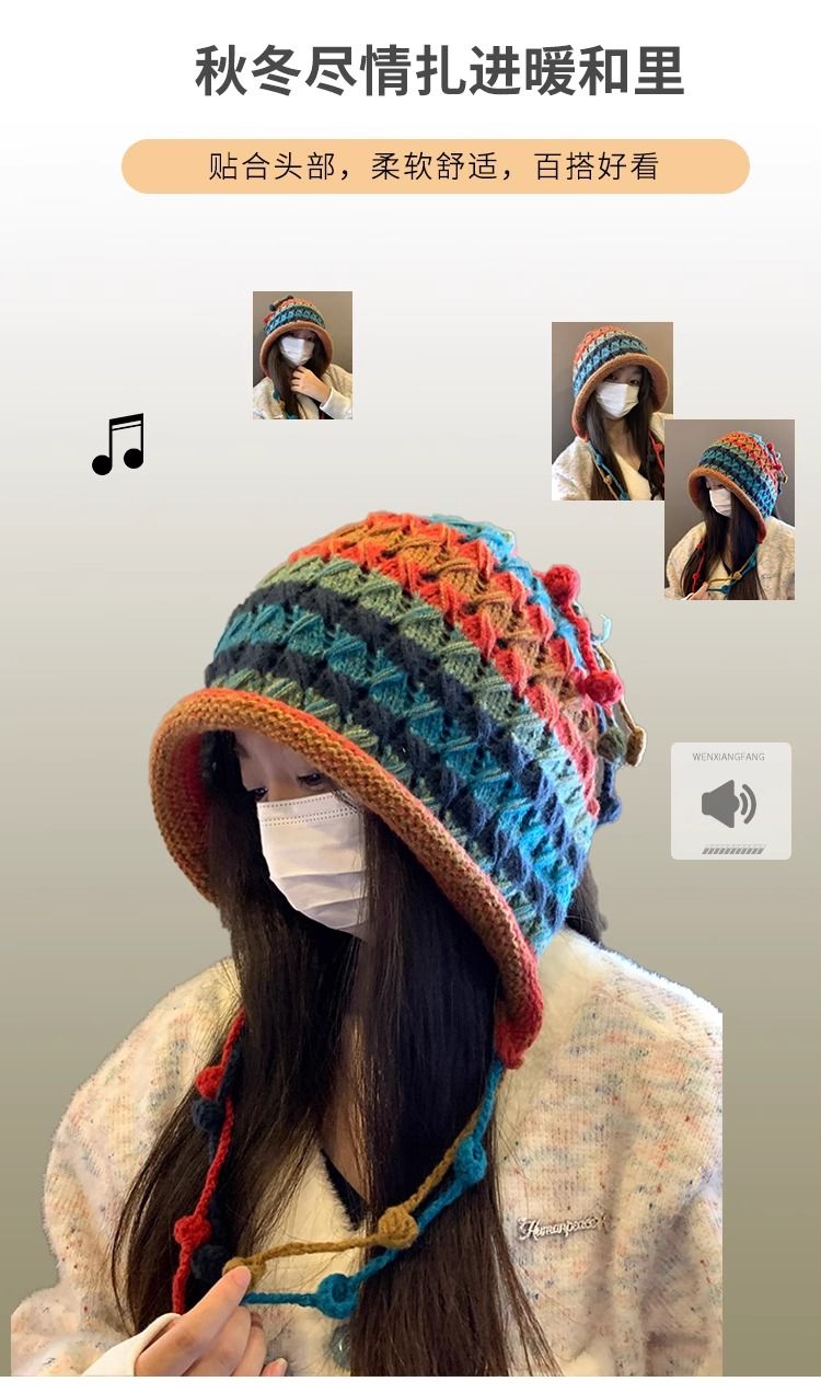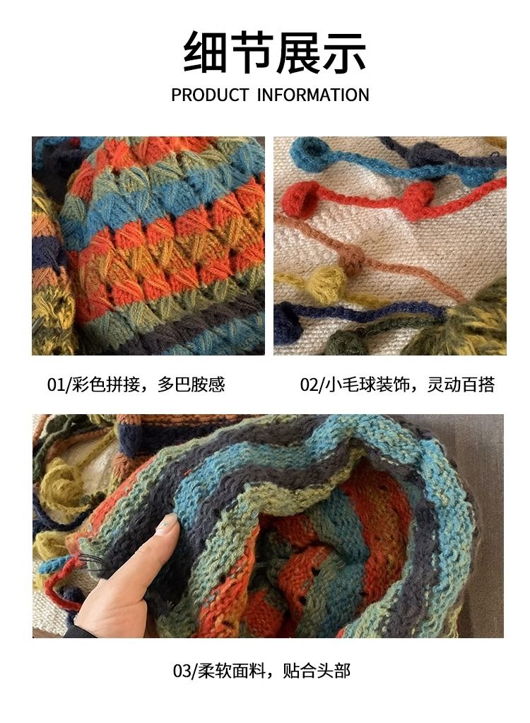 手工编织针织帽秋冬季女可爱多巴胺毛球绑绳出游彩色毛线帽民族风