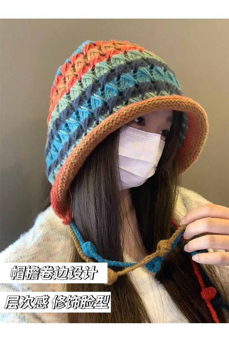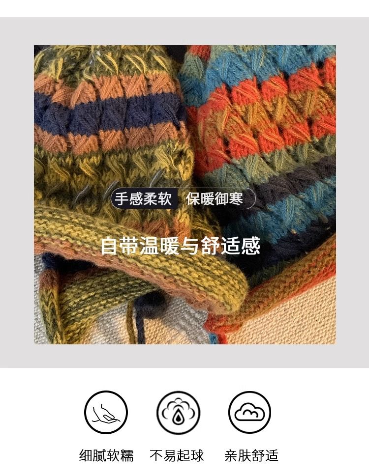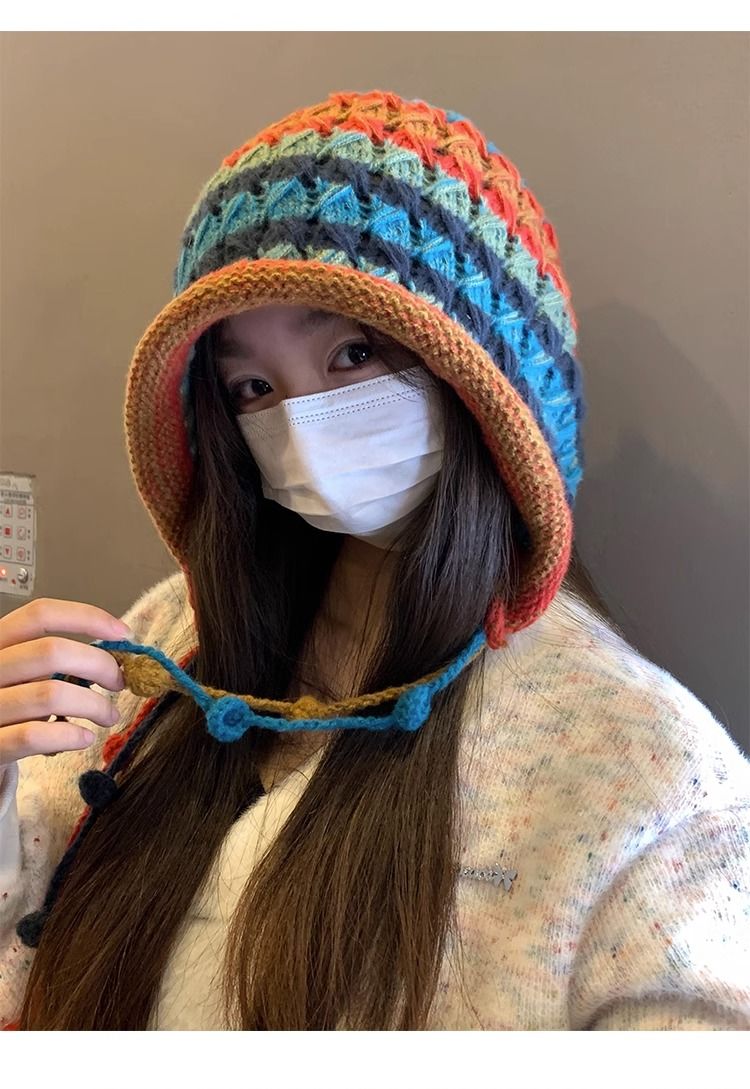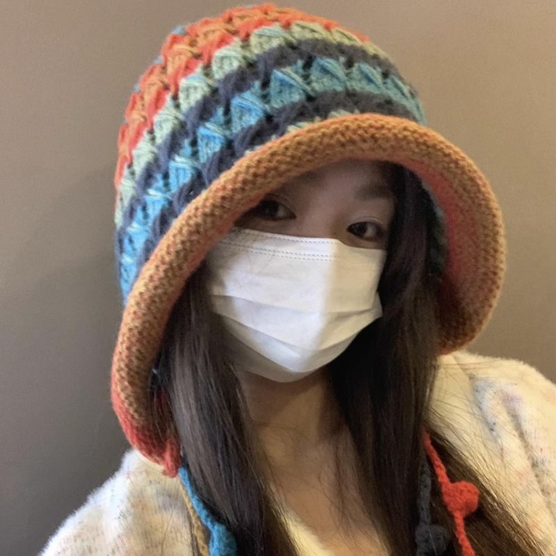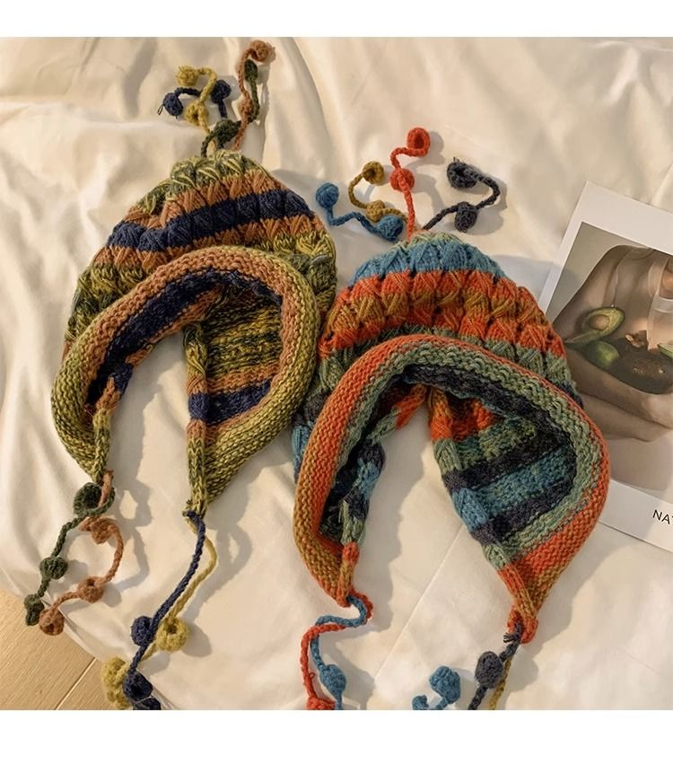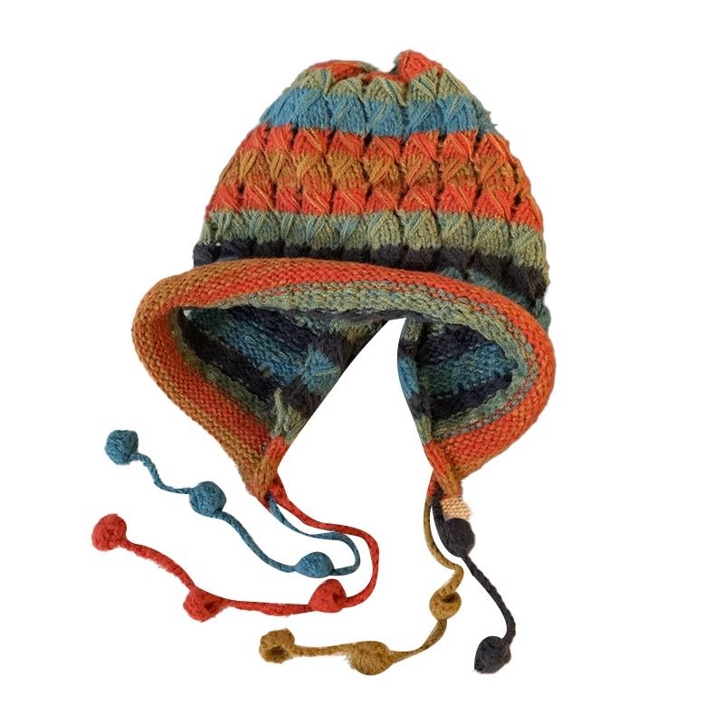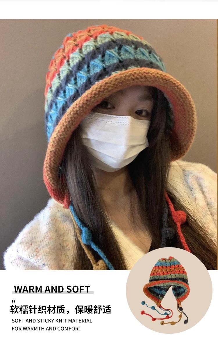 手工编织针织帽秋冬季女可爱多巴胺毛球绑绳出游彩色毛线帽民族风