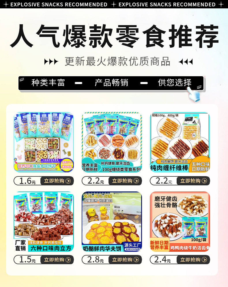 原厂货源批发狗零食纯肉类金毛100g彩袋装鸡肉鸭肉条肉干训犬奖励