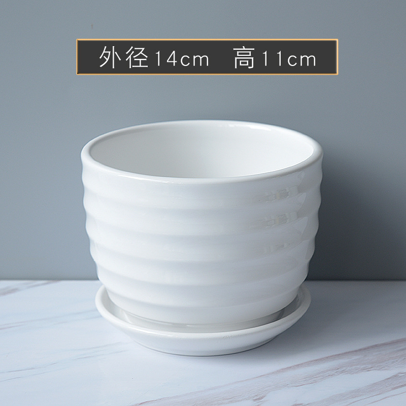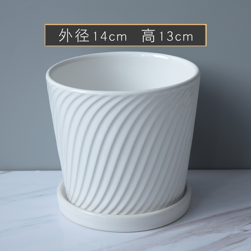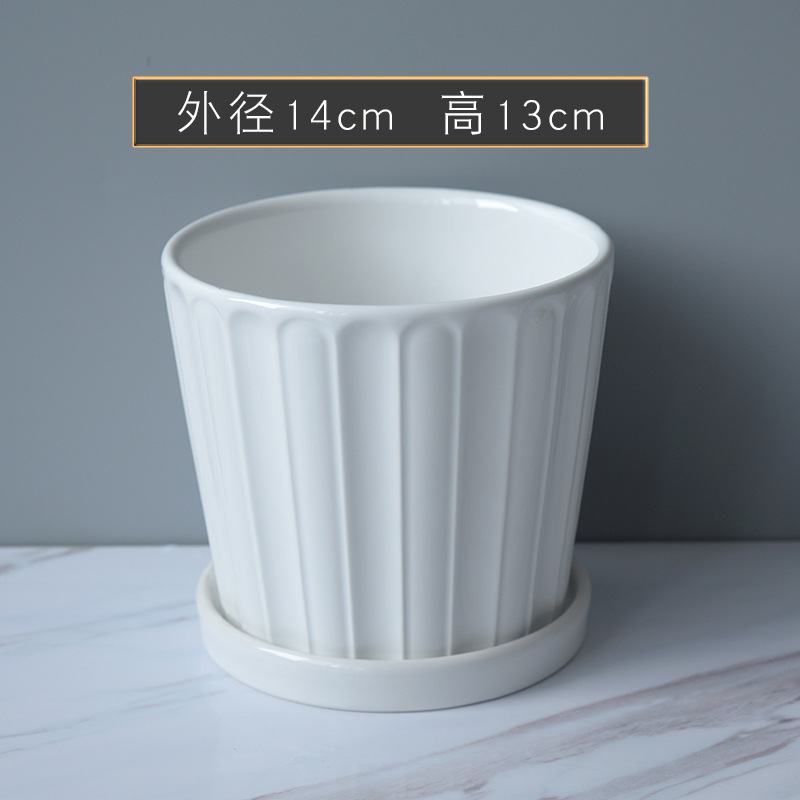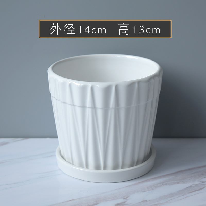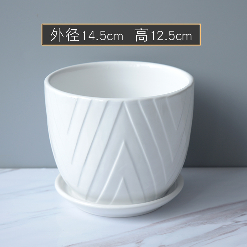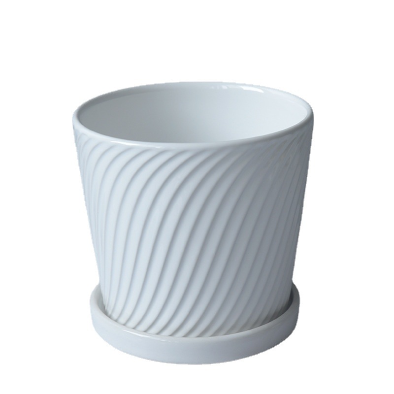 亚马逊陶瓷花盆带托盘办公室多肉花盆白色条纹阳台绿植盆花架批发
